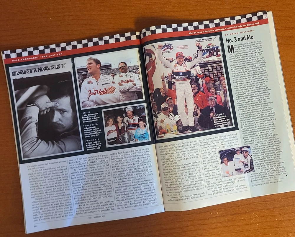 This issue of TIME magazine from March 5, 2001 features an in-depth look at the life and death of NASCAR legend Dale Earnhardt. The magazine provides a comprehensive overview of Earnhardt's career, including his rise to fame and his numerous accomplishments on and off the track. With vivid illustrations and captivating content, this edition of TIME is a must-have for fans of Earnhardt and NASCAR alike. Whether you're a longtime reader or a newcomer to the sport, this magazine is sure to provide hours of entertainment and insight into the fascinating world of racing.