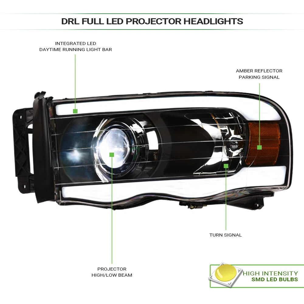 Powered by Frooition Save up to 5% daily deals shop now TLAPS For 02-05 Ram Blk Full LED Strip Projector Headlights Amber+Matte H Grille TLAPS For 02-05 Ram Blk Full LED Strip Projector Headlights Amber+Matte H Grille Part Number: hlplnb-ram02flbw-ab+fggg-grz-ram02-h-mb-201 Description Description Payment Shipping Return & Refund Feedback Description Item Description Full LED Projector Headlights Video will open in a new window Using the eBay App? Paste link into a browser window: [isdntekvideo] Application For 2002-2005 Dodge Ram 1500 Models 2003-2005 Dodge Ram 2500 / 3500 Models Attention Note : Will Not Fit Dodge Ram Van Models Will Not Fit SRT-10 / Sport Models Description Full LED Projector Headlights & Front Grill Grille Features Headlights : Full LED Projector Design With Fiber Optic LED Strips All-In-One Projector LED Lamps For Low Beam & High Beam LED Lamps Provide Brighter Beam While Using Less Energy & Last Longer New Technology High Intensity SMD LED Tube Bar Daytime Running Light Can Be Help Other Road Users Identify & Better Visibility On Road Offers Extra Smooth & Bright Light During Day / Night Time Brings Significant Exterior Upgrade, Give Your Vehicle An Unique Look Front Grille : Luxury Sport Horizontal Style Product Details • 100% Brand New In Stock, Item Exactly As The Picture Shown • Comes With A Complete Set ( Driver & Passenger Side ) • Direct Bolt-On Replacement • Instruction Is Not Included, Highly Recommend To Install By Professional Mechanic • Modification Might Require For Using HID Lighting System • Dramatically Improve Both Styling & Appearance • Please Go Check Out Our Ebay Store For More Additional Hot Items Projector Headlights Technology : A Projector headlight is one type of headlights that produces a stronger beam compared to most parabolic headlights. Projector headlights light a more focused area, providing fewer of what we called "scatter loss". Their design is somewhat similar to a slide projector. Nowadays, this type of headlights is the most common for most cars and trucks since safety is the number one concern of road users. Technical Tips : For Cars That Do Not Have Daytime Running Light ( DRL ) Function: The Lights / HALO / LED Part Can Serve As / Give Out Daytime Running Light ( DRL ) As Extra Functions But In Order For It to Work, You Might Need Modifications To The Wirings And Plugs. Additional Wirings & Plugs For Daytime Running Light ( DRL ) Function Will Not Be Provided. Please Advice Mechanics For Installation & Remember that Professional Installation Is Always Highly Recommended. ** Please make sure all Headlights are install properly, sockets are tightly fastened and all O-rings or rubber gaskets are in great condition. Broken or loose O-rings or rubber gaskets on your factory sockets can cause moisture in your lights ( It can damage your light bulb ). If you happen to have moisture buildup in your lights, please try the following solution. simply remove the lights from the vehicle and set out in the sun or in a dry area for at least few hours. Wait until the moisture has fully evaporated, and reseal around the seams with a clear silicone sealant on the assembly and replace any worn down O-rings or rubber gaskets. This should alleviate the condensation issue. Payment Payment Please complete the Ebay checkout within 3 days after winning. Payment is expected within 3 days after auction ends. Product availability is not guaranteed after 3 days. PAYPAL payment is for US. customer only and we only ship to PayPal confirmed address, no exception. PAYPAL payment ( in USD ) is the only payment method will be accepted for International Buyers. Insufficient payment amount or missing information will delay the process of order, please read the invoice carefully. Shipping Shipping U.S. 48 Contiguous States Shipping Service: UPS / Fedex Ground Price: $ 0 Transit Time: 1-7 Days With Tracking U.S. 48 Contiguous States ( Express Shipping Service ) Shipping Service: FedEx 2Day Price: $ 299 Transit Time: 1-3 Days With Tracking Canada Shipping Service: Fedex International Economy Price: $ 323 Transit Time: 2-5 Business Days With Tracking ( Brokerage Fee Is Included ) Alaska & Hawaii Shipping Service: FedEx 2Day Price: $ 299 Transit Time: 1-3 Days With Tracking International ( U.K. Europe, Australia Only ) Shipping Service: Not Available Price: $ Not Available Transit Time: Not Available There will be 9.5% Sales Tax on the Total sales price With Shipping Cost for California Buyers. " Free Shipping " Services, If offer, is for US Lower 48 States Buyers Only. Alaska & Hawaii will have a different Shipping rate. We accept Paypal / Credit Card payment through Ebay Checkout ONLY. We only ship to Paypal Confirmed Address as this is recommended for both buyer and seller protection. Most of the orders will be shipped out from our main warehouse CA 91789 within 24-48 hours after payment is cleared. The transit time is provided by the shipping carrier based upon the item is picked up. Additional shipping charge will be applied to reship for incorrect address entered by the buyer at checkout. We DO NOT Ship to PO Box , APO, FPO, Puerto Rico , Virgin Islands, Guam , American Samoa , Minor Outlying Islands , Northern Mariana Islands. International & Canada buyers are responsible for any possible brokerage/custom fee. Please consult with your local post office or authority for details. All International countries except CANADA. If Buyer can't find their country shipping rate in the Ebay shipping info, We apologize that we couldn't process the shipment to those countries which are not listed. Alaska & Hawaii Buyers Attention: Please only choose The Correct Shipping Method That Shown On The Shipping Table For ALASKA & HAWAII at the Ebay checkout to complete the transactions. It is the only shipping method that we provide for customers on U.S. territories outside the lower 48 states. Wrong shipping method selected will put the order on hold for insufficient