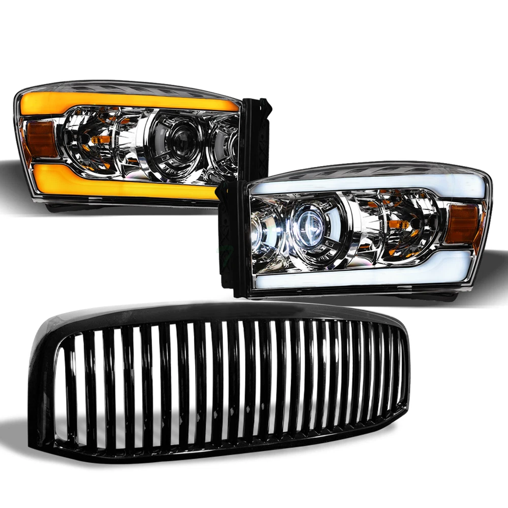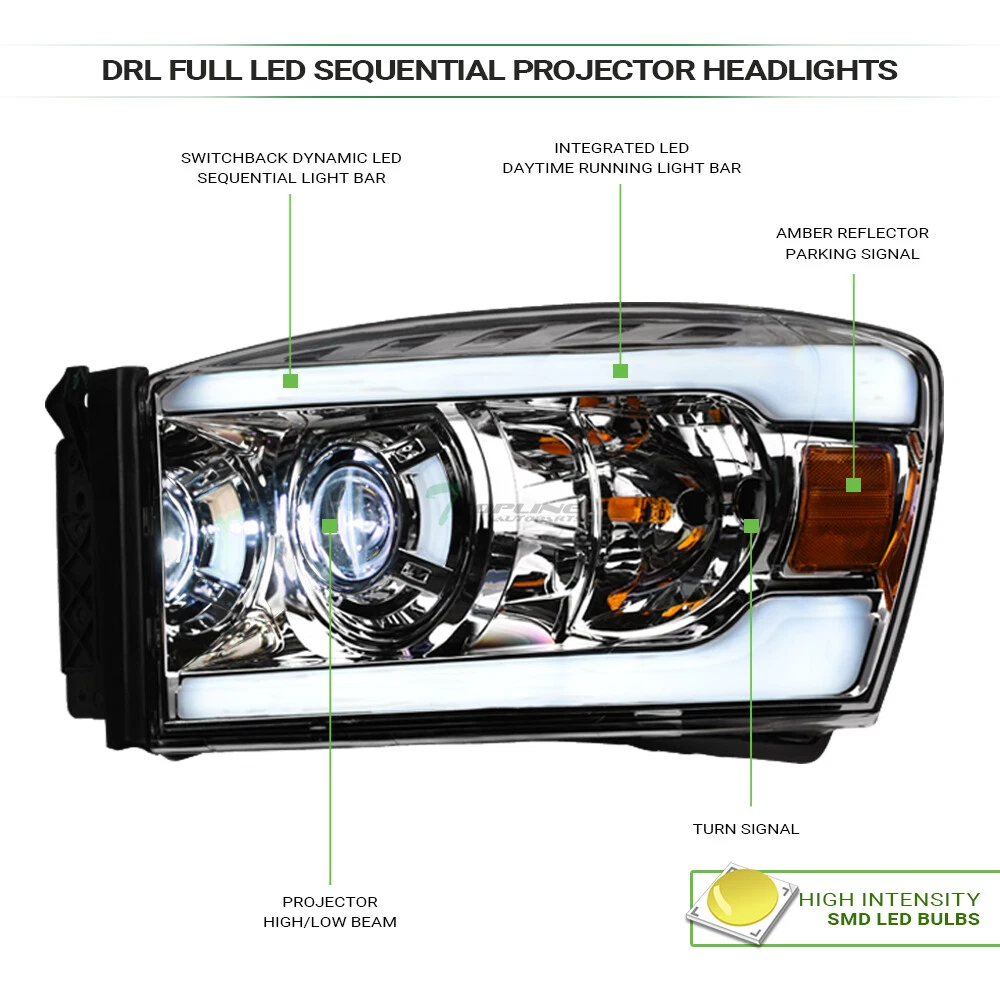 Powered by Frooition Save up to 5% daily deals shop now TLAPS For 06-09 Ram Sequential Chrome Full LED Projector Headlights+Blk V Grille TLAPS For 06-09 Ram Sequential Chrome Full LED Projector Headlights+Blk V Grille Part Number: hlplnb-ram06flsq-ac+fggg-grzv-ram06-vt-bk-201 Description Description Payment Shipping Return & Refund Feedback Description Item Description Application For 2006-2008 Dodge Ram 1500 Models 2006-2009 Dodge Ram 2500 / 3500 Models Attention Note : Will Not Fit Diesel Models Hyper Blinking May Occur If Used With Other Branded Aftermarket LED Lighting Description Full LED Switchback Sequential Projector Headlights & Front Grill Grille Features Headlights : Full LED Projector Design With Switchback Fiber Optic Sequential LED Strips All-In-One Projector LED Lamps For Low Beam & High Beam LED Lamps Provide Brighter Beam While Using Less Energy & Last Longer New Technology High Intensity SMD LED Tube Bar Switchback LED Using A Dual Filament Socket, LED Bulbs Light Up With White As The Low-Filament Running Light And Switch To Bright Amber Anytime You Toggle That Turn Signal Sequential Function Provided By Multiple Lit Elements That Illuminate Sequentially Rather Than Simultaneously. The Visual Effect Is One Of Outward Motion In The Direction Of The Intended Turn Or Lane Change Daytime Running Light Can Be Help Other Road Users Identify & Better Visibility On Road Offers Extra Smooth & Bright Light During Day / Night Time Brings Significant Exterior Upgrade, Give Your Vehicle An Unique Look Front Grille : Luxury Sport Vertical Style Product Details • 100% Brand New In Stock, Item Exactly As The Picture Shown • Comes With A Complete Set ( Driver & Passenger Side ) • Direct Bolt-On Replacement • Instruction Is Not Included, Highly Recommend To Install By Professional Mechanic • Modification Might Require For Using HID Lighting System • Dramatically Improve Both Styling & Appearance • Please Go Check Out Our Ebay Store For More Additional Hot Items Projector Headlights Technology : A Projector headlight is one type of headlights that produces a stronger beam compared to most parabolic headlights. Projector headlights light a more focused area, providing fewer of what we called "scatter loss". Their design is somewhat similar to a slide projector. Nowadays, this type of headlights is the most common for most cars and trucks since safety is the number one concern of road users. Technical Tips : For Cars That Do Not Have Daytime Running Light ( DRL ) Function: The Lights / HALO / LED Part Can Serve As / Give Out Daytime Running Light ( DRL ) As Extra Functions But In Order For It to Work, You Might Need Modifications To The Wirings And Plugs. Additional Wirings & Plugs For Daytime Running Light ( DRL ) Function Will Not Be Provided. Please Advice Mechanics For Installation & Remember that Professional Installation Is Always Highly Recommended. ** Please make sure all Headlights are install properly, sockets are tightly fastened and all O-rings or rubber gaskets are in great condition. Broken or loose O-rings or rubber gaskets on your factory sockets can cause moisture in your lights ( It can damage your light bulb ). If you happen to have moisture buildup in your lights, please try the following solution. simply remove the lights from the vehicle and set out in the sun or in a dry area for at least few hours. Wait until the moisture has fully evaporated, and reseal around the seams with a clear silicone sealant on the assembly and replace any worn down O-rings or rubber gaskets. This should alleviate the condensation issue. Payment Payment Please complete the Ebay checkout within 3 days after winning. Payment is expected within 3 days after auction ends. Product availability is not guaranteed after 3 days. PAYPAL payment is for US. customer only and we only ship to PayPal confirmed address, no exception. PAYPAL payment ( in USD ) is the only payment method will be accepted for International Buyers. Insufficient payment amount or missing information will delay the process of order, please read the invoice carefully. Shipping Shipping U.S. 48 Contiguous States Shipping Service: UPS / Fedex Ground Price: $ 0 Transit Time: 1-7 Days With Tracking U.S. 48 Contiguous States ( Express Shipping Service ) Shipping Service: FedEx 2Day Price: $ 329 Transit Time: 1-3 Days With Tracking Canada Shipping Service: Fedex International Economy Price: $ 339 Transit Time: 2-5 Business Days With Tracking ( Brokerage Fee Is Included ) Alaska & Hawaii Shipping Service: FedEx 2Day Price: $ 329 Transit Time: 1-3 Days With Tracking International ( U.K. Europe, Australia Only ) Shipping Service: Not Available Price: $ Not Available Transit Time: Not Available There will be 9.5% Sales Tax on the Total sales price With Shipping Cost for California Buyers. " Free Shipping " Services, If offer, is for US Lower 48 States Buyers Only. Alaska & Hawaii will have a different Shipping rate. We accept Paypal / Credit Card payment through Ebay Checkout ONLY. We only ship to Paypal Confirmed Address as this is recommended for both buyer and seller protection. Most of the orders will be shipped out from our main warehouse CA 91789 within 24-48 hours after payment is cleared. The transit time is provided by the shipping carrier based upon the item is picked up. Additional shipping charge will be applied to reship for incorrect address entered by the buyer at checkout. We DO NOT Ship to PO Box , APO, FPO, Puerto Rico , Virgin Islands, Guam , American Samoa , Minor Outlying Islands , Northern Mariana Islands. International & Canada buyers are responsible for any possible brokerage/custom fee. Please consult with your local post office or authority for details. All International countries except CANADA. If Buyer can't find their country shipping rate in the Ebay shipping info, We apologize that we couldn't process the shipment to those countries which are not listed. Alaska & Hawaii Buyers Attention: Please o