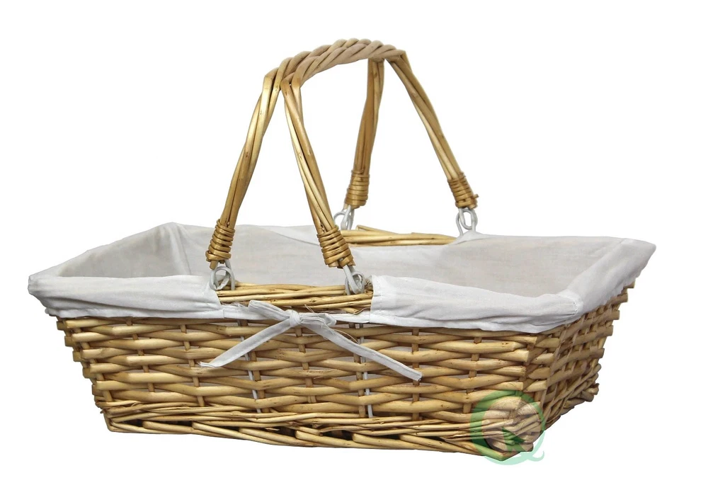 This is a nice, medium size basket, with a removable liner. Cute and well made, makes a very nice gift basket. Material: Wicker.-Lined with cloth.-Double drop down handles. Approx. Dimension: 15.8.7" x 11.5" x 5" 2 handles for easy carrying Attractive and elegant lined basket Practical and handy addition to any home Great gift idea