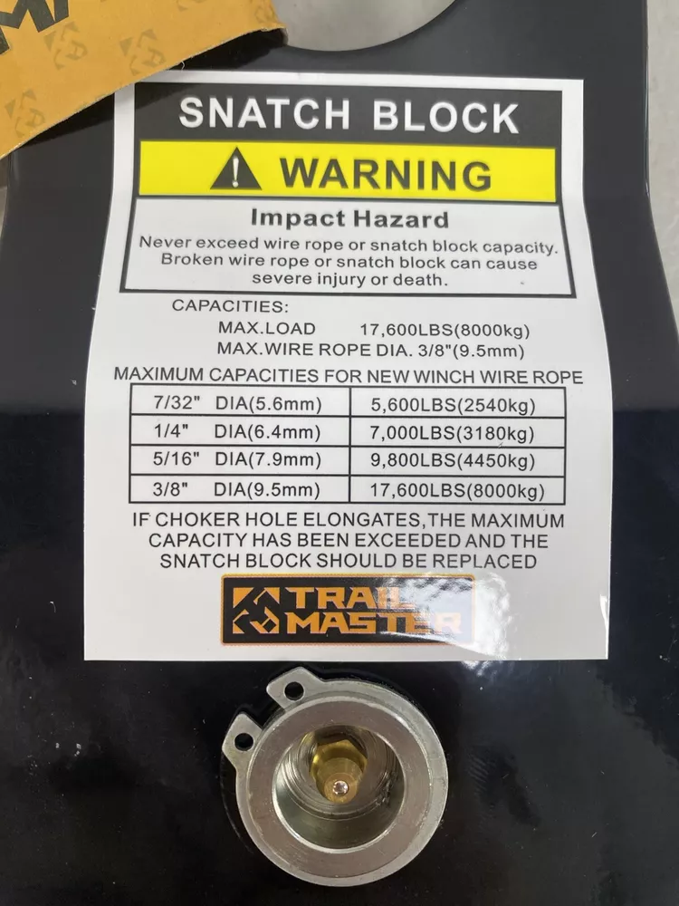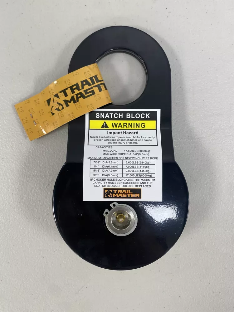 The Trail Master Snatch Block can increase the pulling power of your winch, and even double it with a double-line pull. It can also change the direction of the pull when you have an offset anchor, preventing damage to your steel cable or synthetic rope. With a 17,600 lb. load capacity, this snatch block can accommodate ropes up to 3/8" diameter and is a must for any off-roader. SN: O31