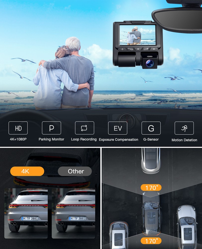 You may also like TOGUARD Dual Dash Cam 1080P+1080P Front and Inside Car Driving Camera 64GB Card 52.69 USD Free shipping TOGUARD 4K Dual Dash Cam UHD 2160P+1080P Front Rear Car DVR Camera night vision 67.59 USD Free shipping TOGUARD 12" Mirror Dash Cam 4K GPS Backup Camera Front and Rearview DVR Recorder 79.29 USD Free shipping TOGUARD 3 Channel 4K GPS Dash Cam Car Recorder Camera Night Vision G-Sensor 69.41 USD Free shipping 9"2.5K Dash Cam Car Stereo Radio Wireless Apple Carplay&Android Auto+Rear Camera 89.21 USD Free shipping TOGUARD Dual Lens 4K Dash Cam Front Rear Car Video Camera Night Vision G-sensor 49.29 USD Free shipping TOGUARD Uber Dual Dash Cam Full HD 4K+1080P Inside and Outside Car Camera Dash Cams 3" LCD 340° Dashboard Camera with G-Sensor, WDR, Parking Monitor, Motion Detection for Truck Car Taxi US STOCK! FAST DELIVERY! FAST RECEIVED!!! Product Description: TOGUARD BRAND - Monitor What You Concern Trusted by over Millions of homes and businesses since our establishment in 2009, TOGUARD is an industry leader in Home and Personal Security Monitoring Technology. Whether you need to guard your safety and car, record moments while driving, or keep an eye on car when you leave car, TOGUARD is here to help. Key words: 【 Dual 4K+ 1080P Dash Camera with Audio for Uber TruckTaxi 】Front Camera Resolution: 4K 3840*2160@25fps and Backup Camera: FHD 1920*1080P@25fps, front and cabin in-car dash cameras with Advanced Sony Exmor IMX323 sensor simultaneously record the road and inside the car, which provide sharp high quality video/picture. Dual lens dash cams provide powerful evidence in case you have an accident and single lens can record 2160P UHD video, capturing license plates clear. 【 340° Wide angle & 360° Rotatable Cameras 】Based on the each 180° rotatable dual dash camera, it is more convenient and user friendly for you to adjust the angel. The two 170° wide angle lens captures the whole road and license plates of other cars in front of you from the edges of your windscreen, and recording what is happening in the cabin simultaneously during the day and night. Perfect dual lens dash cams for car, cab driver, taxis, Uber and so on. 【 24 Hours Parking Monitor & Motion Detection 】Triggered by the parking monitor and motion detection, the dual dash cams will automatically turn itself on and starts recording when it detects motion in front of your car or someone crashes your car while it is parked. Excellent audio recording with built in microphone can provide perfect proof if someone damages your car and gives you peace of mind after you left your car. 【 Continuous Loop Recording & G-Sensor 】Seamless loop recording will automatically overwrites the oldest footage and replacing it with the new videos, so there's no need to worry about your memory card running out of storage space. The G-sensor(smart record emergency lock system) is a great feature that if any sudden braking or bumps caused an accident the footage will get locked and saved. This can be used as evidence and insurance claim during car accidents. 【 Super IR Night Vision & WDR & Reliable Service 】The driving recorder with Sony IMX323 sensor, f/2.0 aperture and WDR (Wide Dynamic Range) funtion ensures the clarity of images or videos. You can easy to obtain sharp images and videos even in low-light environments. Also, we support 30 days money back and 12 months warranty, professional after-sale service, you questions will be replied within 24 hours. Warm tips: 1.The built-in battery is very small for safety reasons, not designed to work alone, so please keep it connected to external power supply. 2.We recommend to buy Class 10 or above high speed Genuine Micro-SD card at Amazon's Own or Branded Stores, capacity 32GB. ( SD card not include in the package .) 3.Please f ormat the micro-SD card before the first time use. Format the SD card regularly to prevent “card error” problem. 4.We recommend to use our brand DC5V/2.1A car charger and please don't use car charger below DC5V/2A. Front 4K 3840*2160@25fps Backup Camera: FHD 1920*1080P@25fps front and cabin in-car dash cameras with Advanced Sony Exmor IMX323 sensor simultaneously record the road and inside the car, which provide sharp high quality video/picture. Seamless Loop Recording Auto power on and record while car engine started. Loop Recording will overwrite the oldest footage with the newest one when the memory card approaches to its maximum capacity to get efficient storage management. Dual 170° Lens The 170°wide angle lens front camera captures the whole road and license plates in front of you from the edges of your windscreen, and the 170°inside camera enhances in car at super low light environment. G-Sensor The sensibility adjustable G-sensor(smart record emergency lock system) is a great feature any sudden braking or bumps which is very useful in the event of an accident the footage will get locked and saved. Lens Exchange Turn on to switch A / B Lens Direction. As default, The A lens is facing backward,used to record inside of the car; The B lens is facing forward,used to record outside of the car, cover the road. If you want to switch the direction, you need to manually switch the lens direction, and then turn on Lens Exchange to correct the image direction. Parking Monitor It is used to protect your car after parking. With this function on, after you stop the car and the camera turns off, it stays in standby, when camera detects significant shock, it will automatically turn on and take a short video, then turn off automatically. Motion Detection Turn it on automatically and record when it detects any motion. Note: Please do not turn on motion detection features while driving, this function may make recording intermittent. WDR Wide Dynamic Range: turn on to optimize video quality with wider light range and image details. Package Included: 1x TOGUARD CE45A Dual Dash Cam 1x 3.5m Car Charger 1x Suction Cup Mount 1x 3M Adhesive Sticke