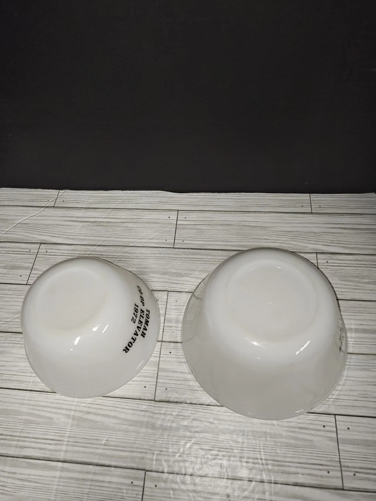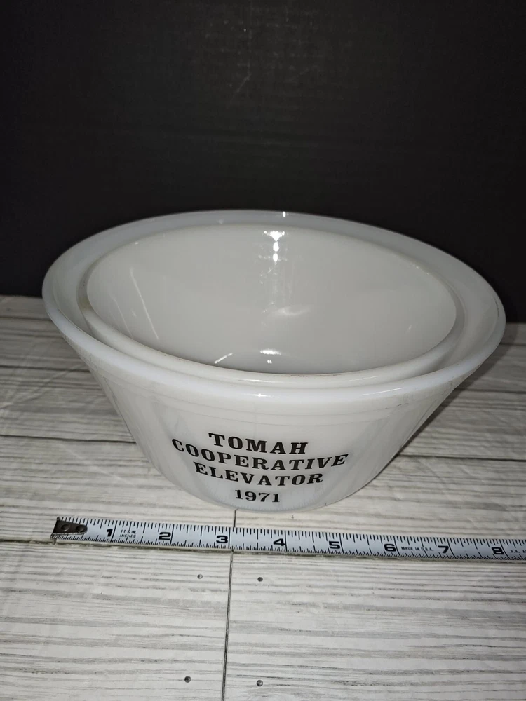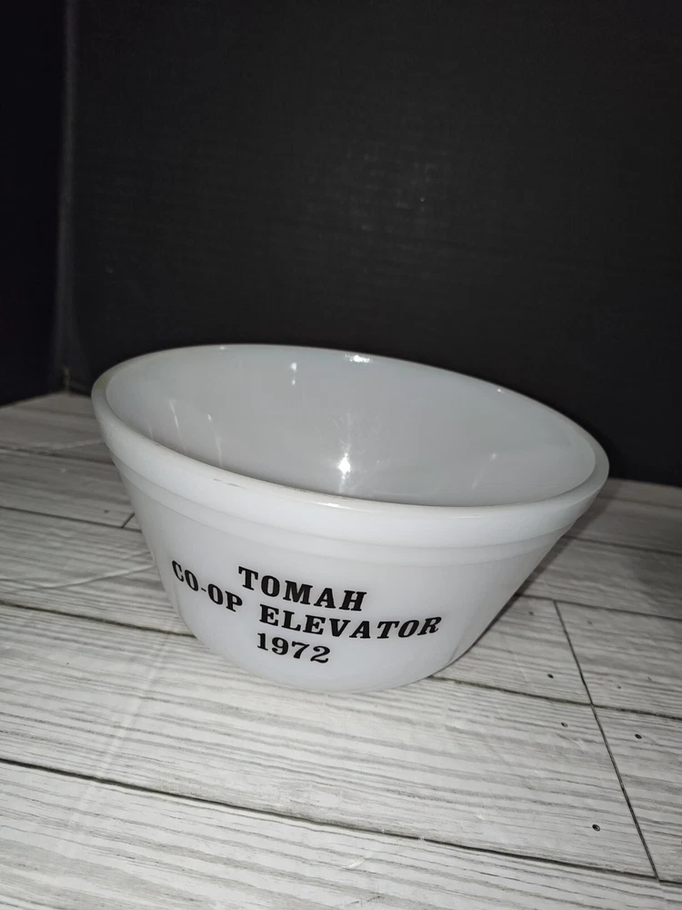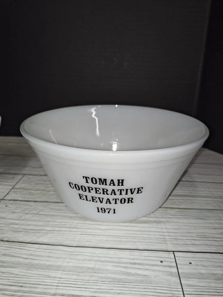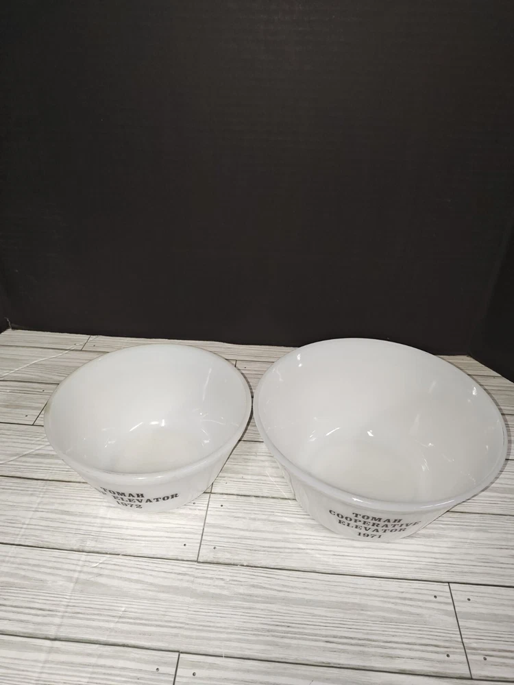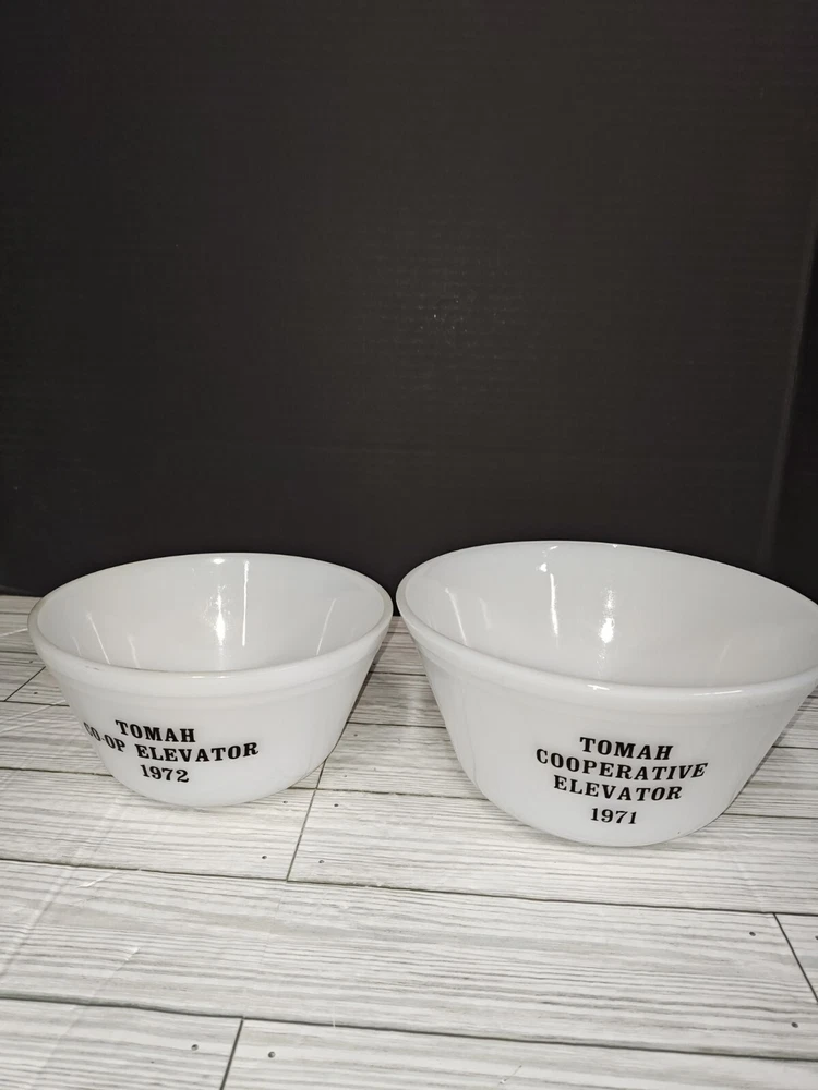 TOMAH CO-OP ELEVATOR TOMAH Wisconsin 1971 & 1972 Milkglass Advertising Bowls. They have some wear from age use and storage. See pictures. Sold as is.