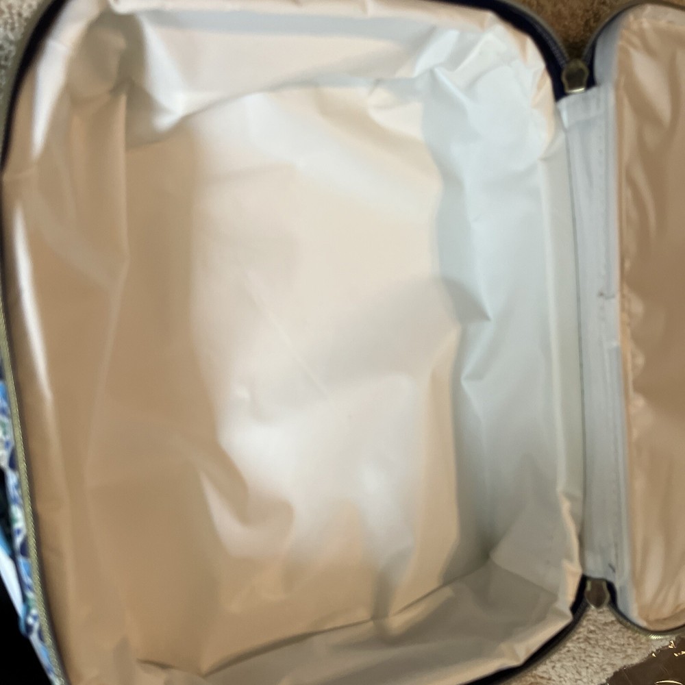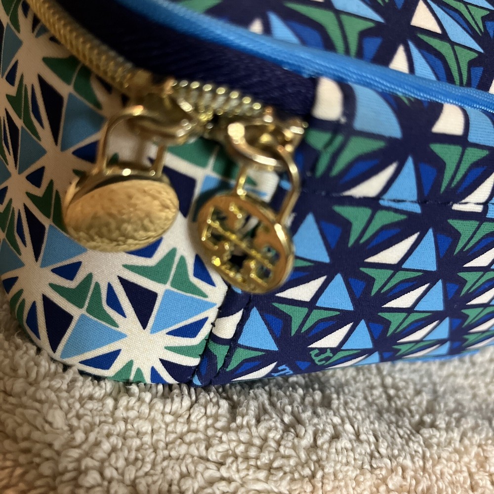 This Tory Burch lunch box tote is a stylish and practical addition to your lunch. With a geometric pattern in multicolor blue, it features a zip lid, neoprene material, and a rectangular shape. The lunch box has one compartment and comes with a handle for easy carrying. Measuring 11 inches in length , 3 inches in height, and 8.5 inches in width , it is perfect for storing and keeping your lunch fresh. The reusable lunch box is a modern style statement and is great for any occasion. Excellent used condition.