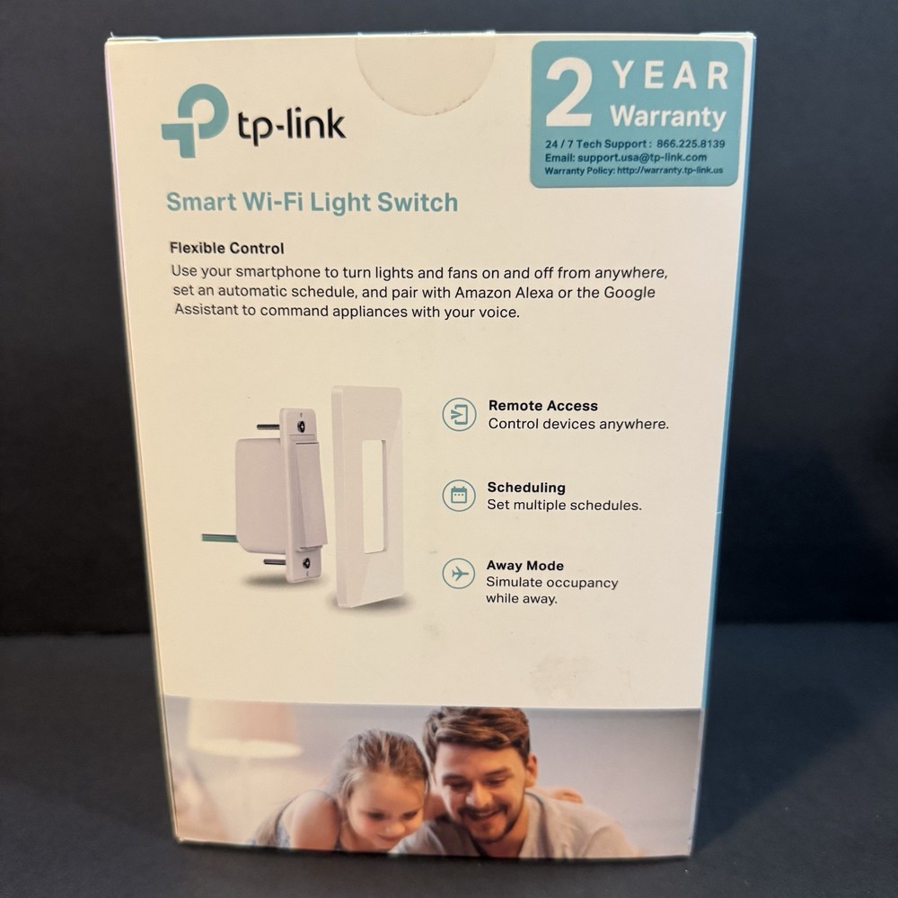 Open box The TP-LINK Smart WiFi Light Switch HS200 is an on/off wall switch that offers connectivity through Wi-Fi and wired connections. It features convenient functions such as scheduling and timers, voice control, smart actions, and away mode. This switch is compatible with both Google Assistant and Amazon Alexa, making it a versatile and intelligent addition to any smart home setup. The California Prop 65 warning indicates that this product is compliant with environmental safety regulations.
