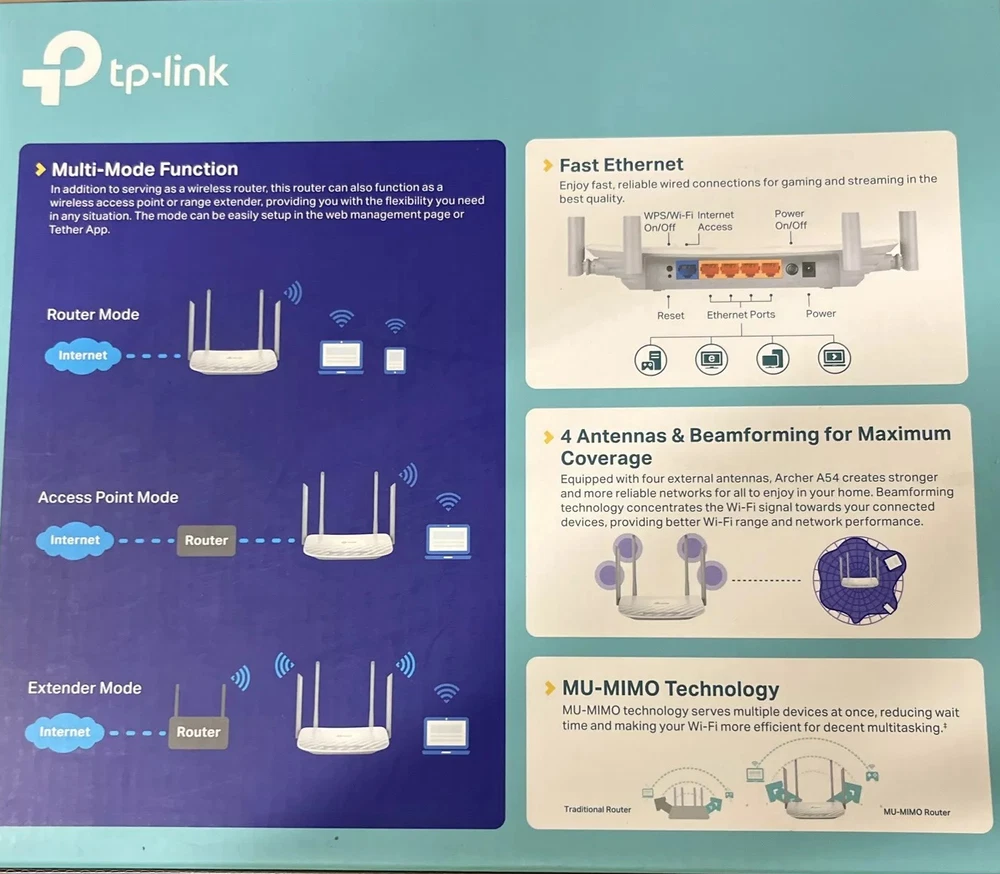 Strong, Far-Reaching Wi-Fi AC1200 Dual Band Wi-Fi Router Archer A54 High-Speed Dual Band Wi-Fi for Better Connections The Archer A54 lets your PC or laptop enjoy connections 3x faster than Wireless N with Wireless AC technology. With 300Mbps over the 2.4GHz band and 867Mbps over the the crystal clear 5GHz band, the Archer A54 is the superior choice for seamless HD streaming, online gaming and other bandwidth-intensive tasks. 1. Router Mode Connect to the Ethernet to instantly create a private wireless network and share internet access to all your Wi-Fi devices. 2. Access Point Mode Transform your existing wired network to a wireless one. 3. Range Extender Mode Boost the existing wireless coverage in your room. 4 Antennas & Beamforming for Maximum Coverage Equipped with four external antennas, Archer A54 creates stronger and more reliable networks for all to enjoy in your home. Beamforming technology concentrates the Wi-Fi signal towards your connected devices, providing better Wi-Fi range and network performance. Easy Parental Control Supervise children and staff with responsible access, controlled by parents or administrators. Use key words to easily set up a black list and limit the level of web access. Guest Network Access Allow guests to join your Wi-Fi network while protecting your privacy. Make sharing easy, maintain security. Captive portal helps maintain only authorized guests to use the network, presenting devices with a convenient, user-friendly authentication method to grant Wi-Fi access. Easily share your facebook account to anyone who connects to your network. Connect More Devices Simultaneously Archer A54 helps your devices achieve optimal performance by making communication more efficient with MU-MIMO technology. Two simultaneous data streams, allow all connected devices to achieve faster speeds than standard AC routers. Easy Setup and Use Set up the Archer A54 in minutes thanks to its intuitive web interface and the powerful Tether app. Tether also lets you manage its network settings from any Android or iOS device, including parental controls and access control. IPv6 Supported Future-proof your network with IPv6 (Internet Protocol Version 6) support IPTV Improve your IPTV streaming experience with IGMP Proxy/Snooping Bridge and Tag VLAN LED Control Easily schedule the LED on or off to your needs, no blinking light disturbing your sleep Tether APP Tether APP lets you manage your network settings easily from any Android or iOS device More from the Manufacturer Simultaneous 2.4GHz 300 Mbps and 5GHz 867 Mbps connections for 1200 Mbps of total available bandwidth. 4 external antennas provide stable wireless connections and optimal coverage. Supports IGMP Proxy/Snooping, Bridge and Tag VLAN to optimize IPTV streaming. Access Point Mode - Supports AP Mode to transform your wired connection into wireless network, an ideal wireless router for home. Advanced Security with WPA3 - The latest Wi-Fi security protocol, WPA3, brings new capabilities to improve cybersecurity in personal networks. Easy network management at your fingertips with the TP-Link Tether app. Works with all internet service providers, such as AT&T, Verizon, Xfinity, Spectrum, RCN, Cox, CenturyLink, Frontier, etc.(a modem is required for most internet service providers