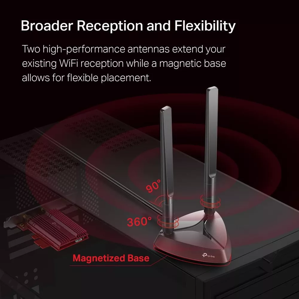 About this item Wi-Fi 6 Technology Powered by Intel: The latest Wi-Fi 6 standard gives you incredible speed ultra-low latency and uninterrupted connectivity with OFDMA and MU-MIMO technology Utilizing next-generation Wi-Fi 6 technology Archer TX3000E is designed to excel in even the busiest of networks for next-level entertainment Next-gen speeds up to 2.4Gbps Reach incredible speeds up to 2.4 Gbps (2402 Mbps on 5 GHz or 574 Mbps on 2 4 GHz) - Supports Windows 11, 10 (64bit) - Driver installation required via Website or included CD Minimized lag for your PC Revolutionary OFDMA reduces lag so you can enjoy ultra-responsive real-time gaming or an immersive VR experience Broader Coverage Two multi-directional and high-performance antennas with a magnetized base extends your existing Wi-Fi reception capabilities. Place the magnetized antenna base anywhere on your desktop to find the optimal location for signal reception. Easily install with low profile bracket. Bluetooth 5.2 for Greater Speeds and Coverage: Archer TX3000E is equipped with the latest Bluetooth 5.2 Technology achieving 2x faster speeds and 4x broader coverage than Bluetooth 4.2 Connect as many devices as you want including game controllers headphones and keyboards for the ultimate setup If you do not have a CD Rom or having difficulty with the CD please visit our homepage and search Archer TX3000E Driver is available for download on the support page for Archer TX3000E Please note that to utilize the Bluetooth function, the Bluetooth USB cable must be connected to a F_USB connector Please also note that while the packaging shows Bluetooth 5.0 support, you can update the firmware from the TP-Link website to support Bluetooth 5.2. Technical Details Collapse all Summary Wireless Type 802.11n, 802.11b, 802.11ax, 802.11g, 802.11ac Other Technical Details Brand TP-Link Series PCI-e Adapter Item model number Archer TX3000E Operating System Windows 11 Item Weight 1 pounds Product Dimensions 3.75 x 4.76 x 0.85 inches Item Dimensions LxWxH 3.75 x 4.76 x 0.85 inches Color black Manufacturer TP-Link ASIN B07ZV2CJL2 Country of Origin Vietnam Date First Available January 10, 2020 Product Description Arm Your PC with Next-Gen WiFi Technology AX3000 Wi-Fi 6 Bluetooth 5.0 PCIe Adapter Next-Level Gaming Stay Immersive 1024-QAM and a 160 MHz bandwidth deliver powerful, continuous WiFi to fully unlock the potential of your Wi-Fi 6 router. Wi-Fi 6 drives your PC to peak performance so your setup keeps pace with your jaw-dropping skills. Broader Coverage Two multi-directional and high-performance antennas with a magnetized base extends your existing WiFi reception capabilities, allowing you to game anywhere and anytime. Place the magnetized antenna base anywhere on your desktop to find the optimal location for signal reception. Bluetooth 5.0 Compatible Archer TX3000E is compatible with the latest Bluetooth 5.0 technology, achieving 2× faster speed and 4× broader coverage than Bluetooth 4.2. Connect as many devices as you want, including game controllers, headphones, and keyboards, to enjoy a smoother experience.*** Advanced Security The latest security enhancements—WPA3 provides more secure and individualized encryption in personal password safety, protecting your network from wireless hacking. Always keep your network safe while gaming online.** Fine Crafting for Ultimate Performance Built with a specialized heatsink crafted to improve stability and reliability even in hot environments. Careful attention to every detail, such as gold plating on every contactor to resist oxidation, delivers a superior network experience.