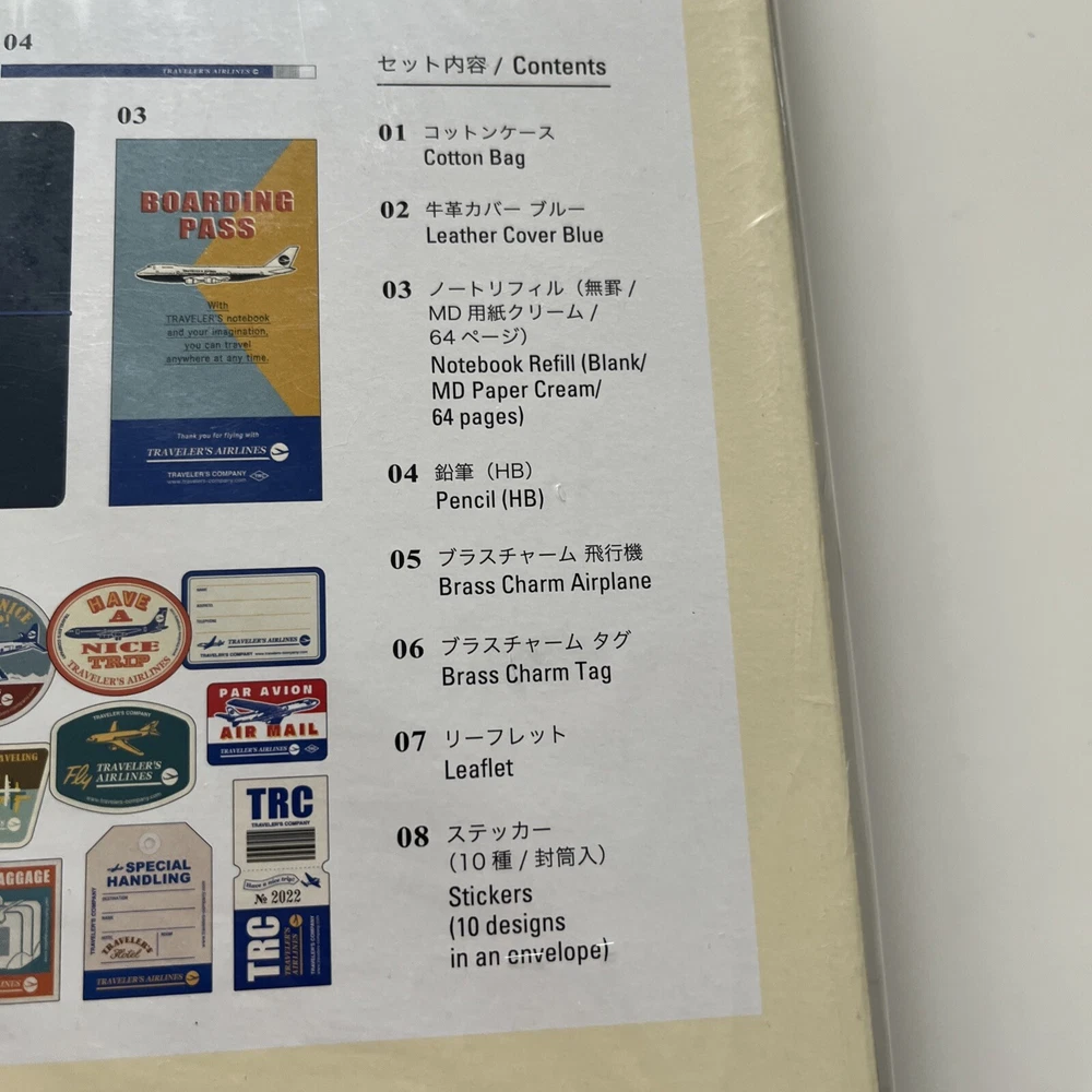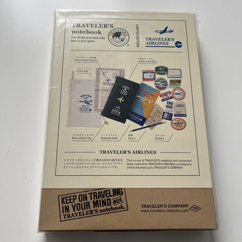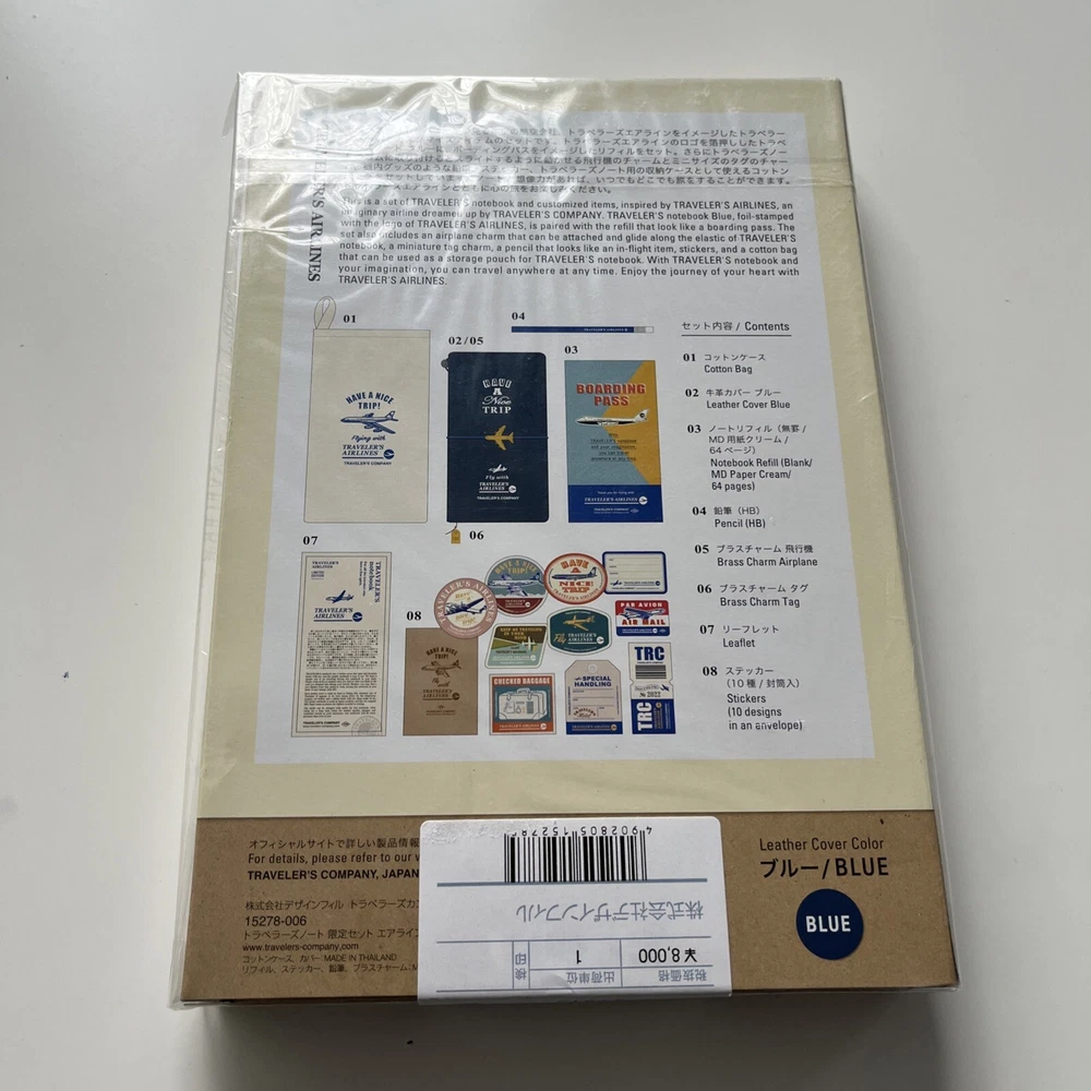 The TRAVELER'S Notebook Airline Set is a limited edition leather cover notebook for 2022, featuring a stylish blue design. Made by TRAVELER’S COMPANY in Japan, this medium-sized notebook is part of the Airline series and comes as a single unit. The notebook is high-quality and perfect for organizing notes and ideas throughout the year, making it a great companion for travel or everyday use.
