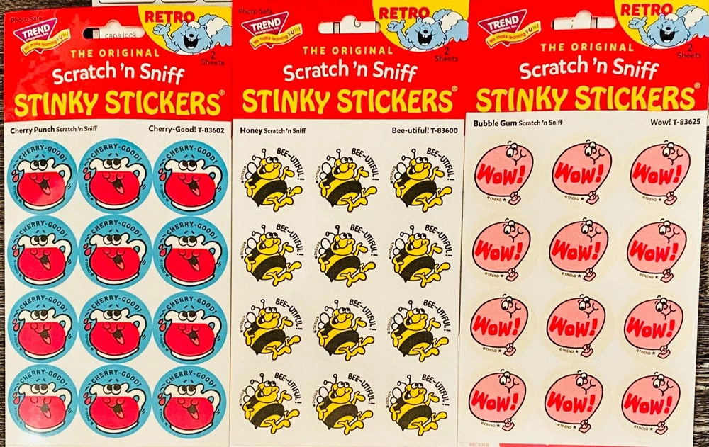 3 Pack | Factory Sealed TREND Scratch n Sniff Stickers from the Special Edition RETRO Collection ~ Stinky Stickers! Includes... Cherry Punch ~ 24 Stickers & Honey ~ 24 Stickers & Bubble Gum ~ 24 Stickers