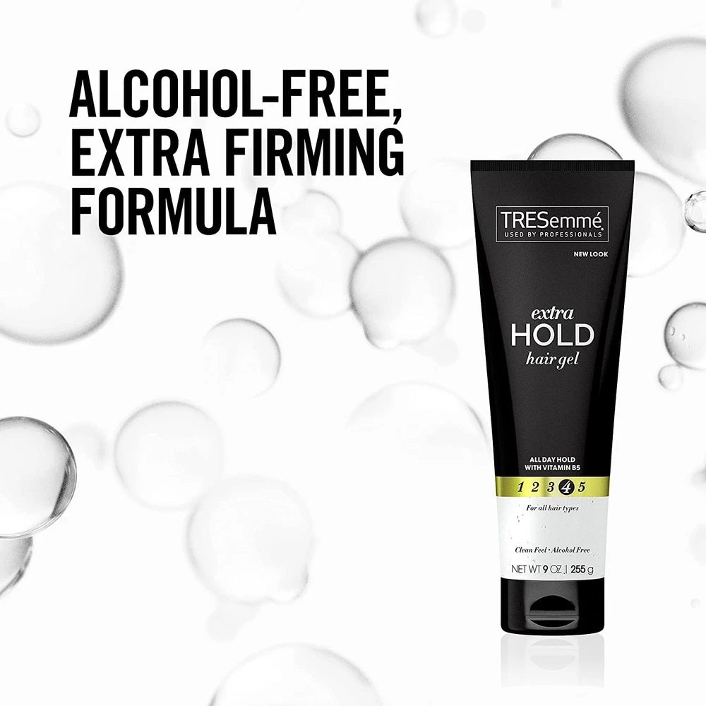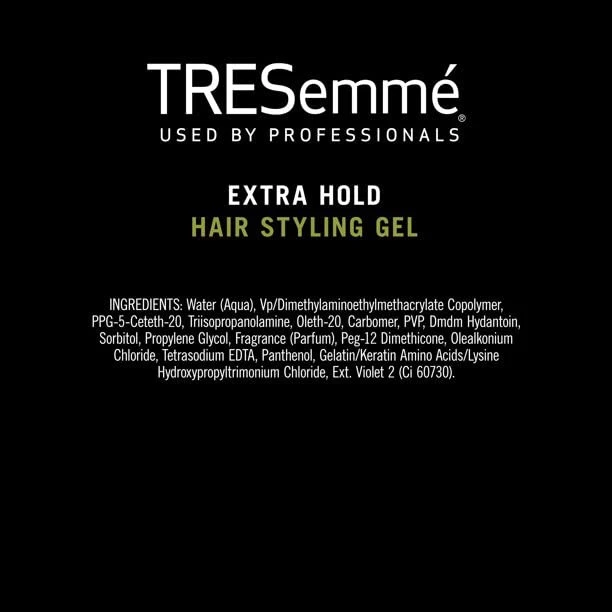 Product Description Tresemme Tres Two, Gel Extra Firm Control, Extra Hold, #4 Hair Styling Gel, 9 Ounce (Pack Of 6) TRESemme Extra Hold Frizz Control Hair Styling Gel, The best styling gel should hold your style without causing a sticky situation. TRESemme Extra Hold Hair Gel delivers all-day-long humidity resistance and keeps your style going strong without ever feeling stiff or sticky. After you put the work into your style, you better lock it in before you lose it. Built for control and ready to be styled, this Extra Hold Gel fights frizz all day long with 24-hour humidity protection, while continuously holding your style in place. This hair styling gel can be used on any hair type, as a curly hair gel or to lock in your wavy styles. Our unique, alcohol-free hair gel formula is great for all hair types and designed to add lasting shine to your style. Step 1: Prep your hair with your favorite TRESemme shampoo and conditioner. Step 2: Start by dispensing a quarter-sized drop of TRESemme Extra Hold Hair Gel into your hands and use fingers to evenly coat towel-dried hair, creating your preferred style. Add more hair styling products as needed. TRESemmé Extra Hold Frizz Control Hair Styling Gel, 9 oz MEGA HOLD HAIR GEL: TRESemmé Extra Hold Hair Gel adds long-lasting shine and firm hold without leaving hair looking sticky or wet ANTI-FRIZZ GEL: This alcohol-free hair styling gel delivers all-day control with humidity resistance to help keep frizz away LOCK IN YOUR STYLE: TRESemmé Extra Hold Hair Gel for women will keep you in control and your hair game strong TREND LED, RIGOROUSLY TESTED: Ingredients in this hair gel are carefully selected to ensure your hair receives the best possible care. We don't test on animals & are PETA Approved HAIR CARE TIPS FROM OUR STYLISTS: Dispense a quarter-size drop into your hands and use your fingers to evenly coat damp hair, creating your desired style. Add more gel as needed EXTRA HOLD HAIR GEL: This gel is a professional-quality clean-feel styling gel that doesn’t dry out your hair. It delivers all-day control with humidity resistance to help keep frizz away NO CRUNCH: Our alcohol-free hair gel adds long-lasting shine and firm hold without leaving hair looking sticky PROTECT HAIR WHILE USING HAIR DRYER, STYLING TOOLS & APPLIANCES: Apply hair gel before using your hair dryer, styling tools & appliances to protect hair from damaging heat while defining your hair style with an extra hold hair gel. VITAMIN B 5 FOR VOLUME AND SHINE: Hair will appear healthy, thicker, with more volume and shine thanks to the Vitamin B 5 in this Extra Hold hair gel. FRIZZ CONTROL IN HIGH HUMIDITY: Frizz control hair gel with extra hold lets you rock your hairstyle and curly hair with confidence without worrying about the humid weather. HOW TO APPLY: Dispense a quarter-sized drop of Extra Hold hair gel into hands. Use fingers to evenly coat towel-dried, clean hair, and work into your preferred style. Add more product if needed. Use your hair dryer or air-dry. MORE THAN HAIR PRODUCTS: TRESemmé is committed to advancing the next generation of female leaders by creating an intentional momentum forward. Find out more about how at #WomenLeadTheWay. Inactive Ingredients Water (Aqua) Vp/Dimethylaminoethy|methacrylateCopolymer PPG-5-Ceteth-20 Trisopropanolamine Oleth-20 Carbomer PVP Dmdm Hydantoin Sorbitol Propylene Glycol Fragrance (Parfum) Peg-12 Dimethicone Olealkonium Chloride Tetrasodium EDTA Panthenol Gelatin/Keratin Amino Acids/Lysine Hydroxypropyltrimonium Chloride Ext. Violet 2 (Ci 60730). Ingredients Water (Aqua), Vp/Dimethylaminoethy|methacrylateCopolymer, PPG-5-Ceteth-20, Trisopropanolamine, Oleth-20, Carbomer, PVP, Dmdm Hydantoin, Sorbitol, Propylene Glycol, Fragrance (Parfum), Peg-12 Dimethicone, Olealkonium Chloride, Tetrasodium EDTA, Panthenol, Gelatin/Keratin Amino Acids/Lysine Hydroxypropyltrimonium Chloride, Ext. Violet 2 (Ci 60730). Active Ingredients NA