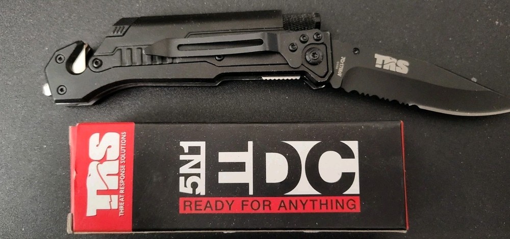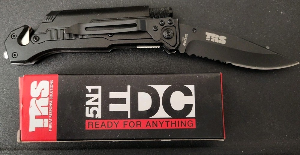 The TRS EDC 5N1 Tactical Defense Knife is a robust cutting tool designed for practical use. It features a straight back serrated blade, ensuring maximum efficiency for slicing and sawing tasks. The manual opening mechanism is reliable and user-friendly, perfect for both everyday carry and outdoor adventures. Crafted with a durable stainless steel handle and a sleek black finish, this knife is both stylish and sturdy. The liner lock type provides additional security and safety during use. The knife's classic model boasts a single blade, embodying the essence of TRS's commitment to simplicity and functionality in their tactical product line.