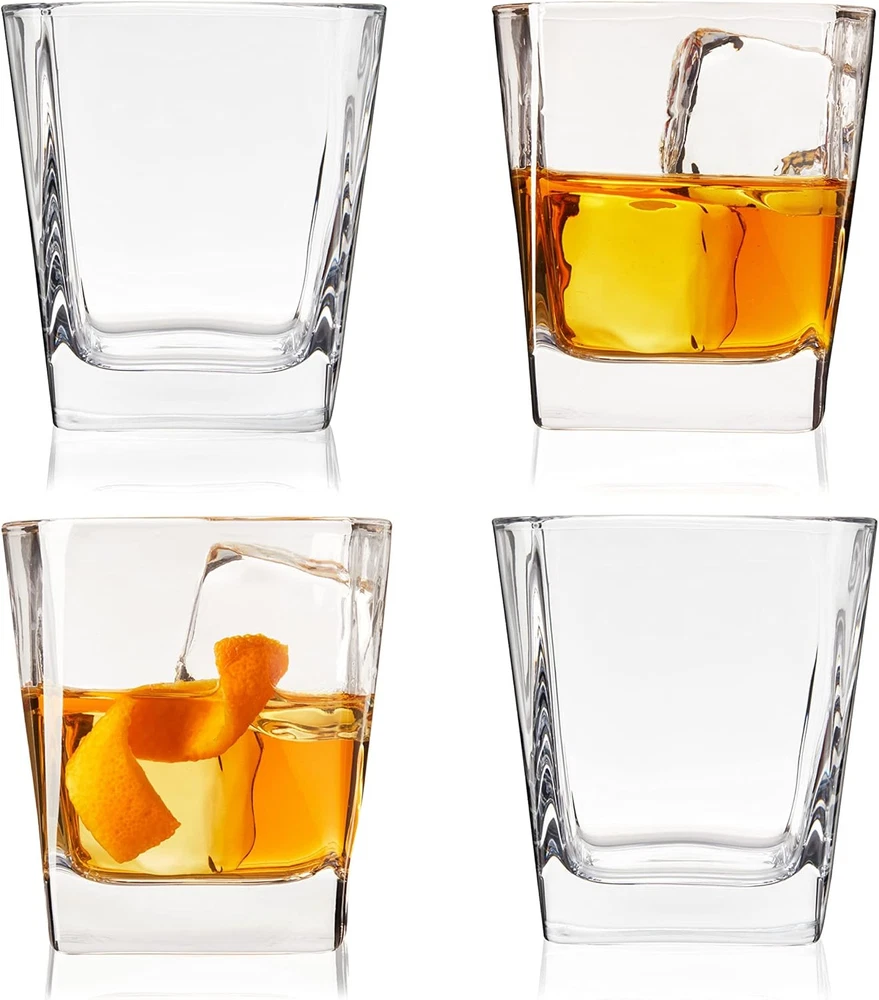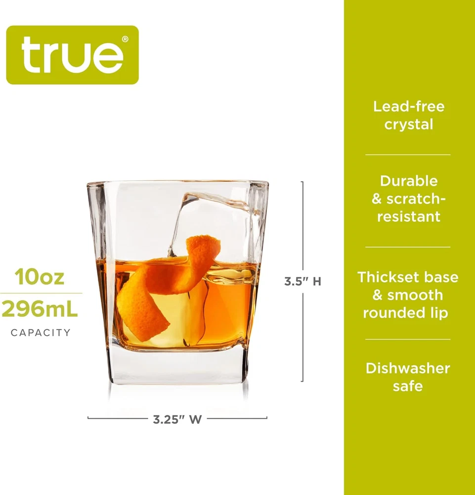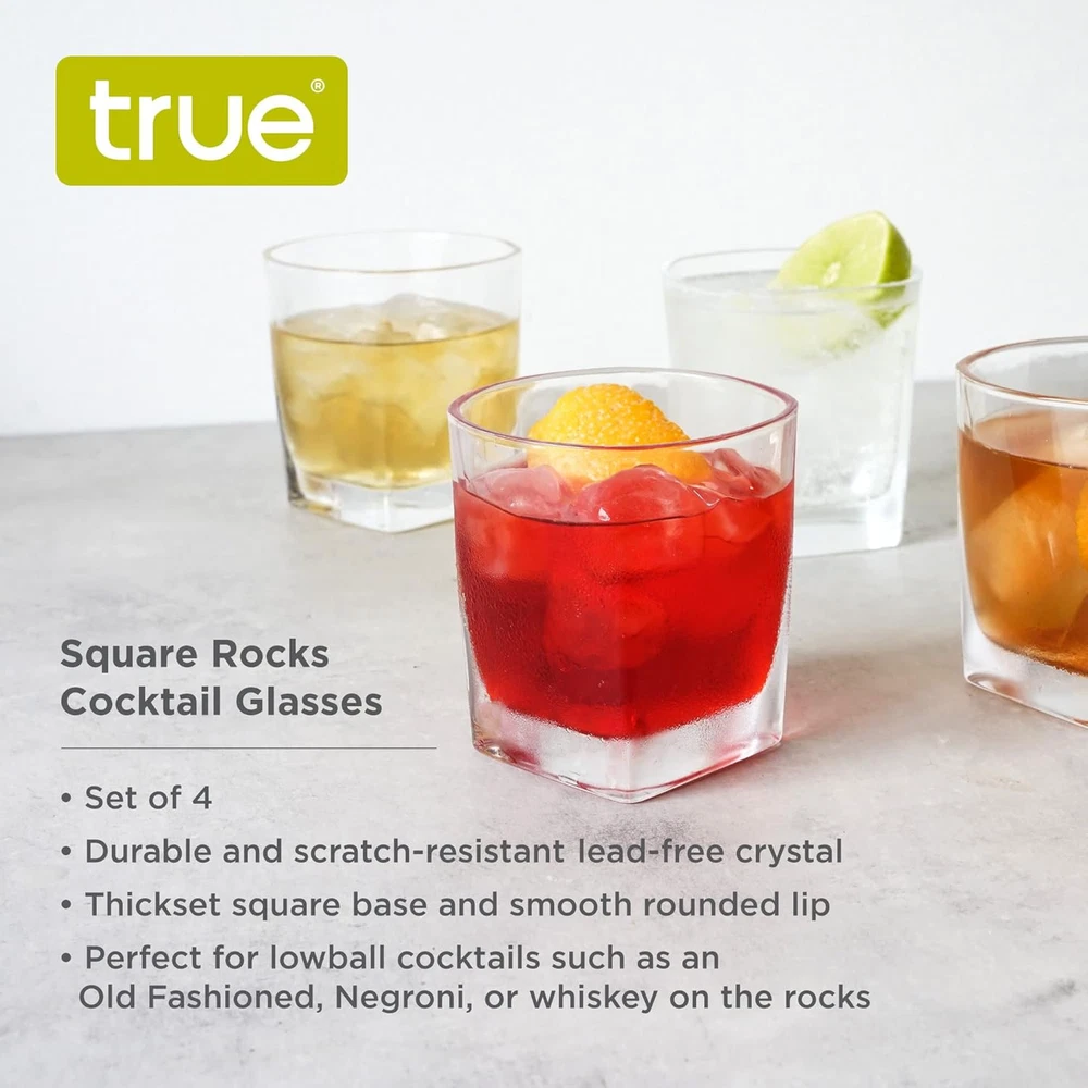 TRUE Square Rocks Glass, Old Fashioned Whiskey Glasses, Set of 4, Clear Product Details Brand: TRUE Color: Clear Special Feature: Dishwasher Safe Style: Square DOF Glasses Theme: Minimalist,Modern Recommended Uses For Product: Home Specific Uses For Product: Cocktail Drinks, Whiskey Drinks Shape: Square Pattern: Solid Product Care Instructions: Hand Wash Only Age Range (Description): Adult Material Feature: Recyclable Reusability: Reusable Unit Count: 1.0 Count Product Dimensions: 3.25"W x 3.5"H Number of Items: 1 Finish Type: Glossy Manufacturer: True Size: Set of 4 Item Weight: 10.7 ounces Country of Origin: China Item model number: 11163 MaterialCapacity: Glass10 Fluid Ounces OccasionItem Weight: Father's Day0.67 Pounds MINIMALIST OLD FASHIONED GLASSES SET – These whiskey glasses are the epitome of elevated simplicity. A thick, square base adds modern style, while the glass rises to a smooth rounded lip for the perfect cocktail glass. PERFECT SCOTCH GLASSES FOR OLD FASHIONED COCKTAILS – A 10 oz. capacity leaves plenty of room in these whiskey glasses for an Old Fashioned or classic cocktails such as a Negroni, Margarita, G&T, or a generous pour of whiskey on the rocks. DISHWASHER SAFE WHISKEY GLASSES SET OF 4 – Celebrate with your favorite bourbon, rum, or rye with these versatile liquor glasses. Minimalist style and dishwasher-safe design will make these your go-to bourbon glasses for happy hour or nightcaps. IMPRESS FRIENDS AND GUESTS – Give this set of whiskey rocks glasses as a gift to cocktail lovers, gifts for Father’s day, or housewarming gifts. Impress visitors by sharing your favorite drink in fine bar glasses with timeless minimalist style. EVERYDAY BASICS DONE BETTER - True makes entertaining simple and elegant with stylish, practical serveware, dishes, barware, and cocktail accessories. Combining streamlined design with functional utility, True elevates the basics. With a thickset square base and a smooth rounded lip, these clear glass tumblers bring a modern touch to otherwise classic glassware. They’re perfect for serving lowball cocktails such as an Old Fashioned or Negroni, or whiskey on the rocks. Dishwasher safe. 10 oz. capacity.