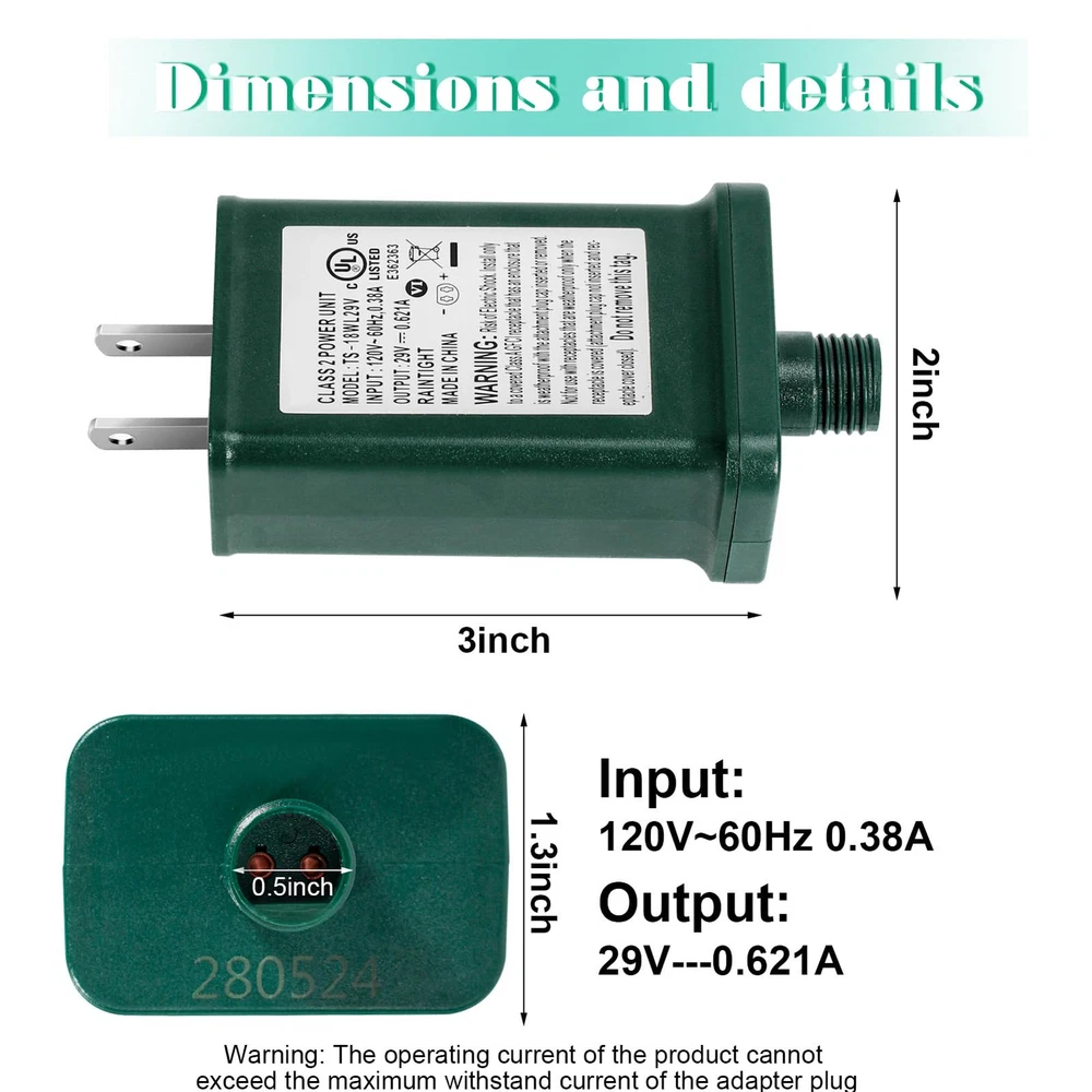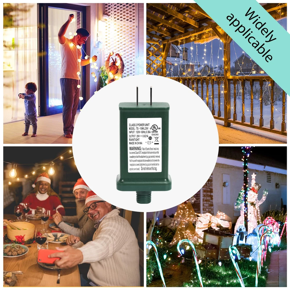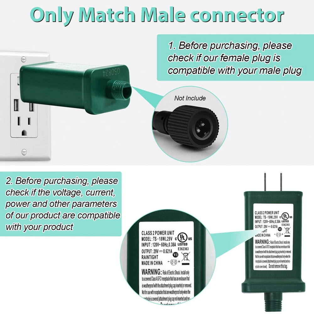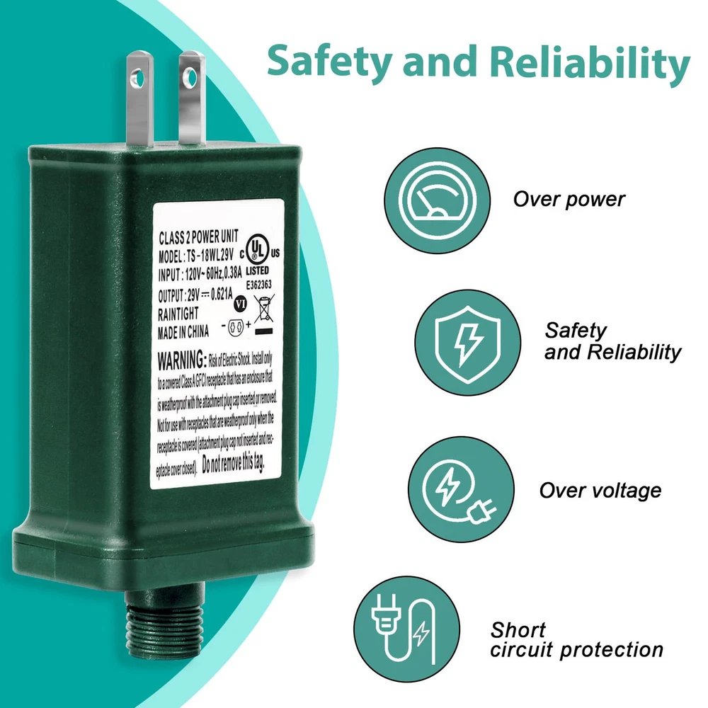 LED power supply specifications - Input: 120V, 60Hz, 0.38A; Output: 29V, 18W, 0.621A; please check the voltage, current, wattage of your connector when purchasing Class 2 power supply - Suitable for most 29V 18W Christmas lights and low-voltage electronic devices, and please carefully check if our female plug of adapter matches your male plug UL certification - This Christmas light replacement plug meets the UL1310 standard and can provide safe, continuous, and stable power supply. Built-in over-voltage, short circuit, and overheating protection, allowing you to use it with peace of mind IP44 waterproof transformers - Class 2 power supply has IP44 waterproof function, which protects the power supply from working normally outdoors in all adverse weather conditions Widely application - Our power supply is suitable for low-voltage Led devices, such as line lights, curtain lights, lawn lights, table lights, equipment, holiday decoration lights,and so on Please note: If using a multimeter for testing, it is necessary to select the AC/DC Voltage for testing. The test result is around 29.42, indicating that the plug is normal