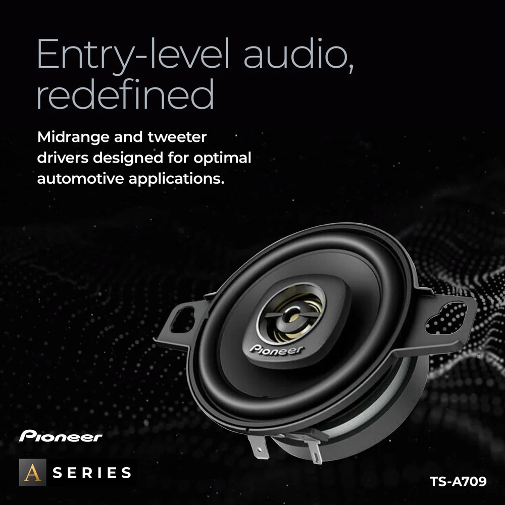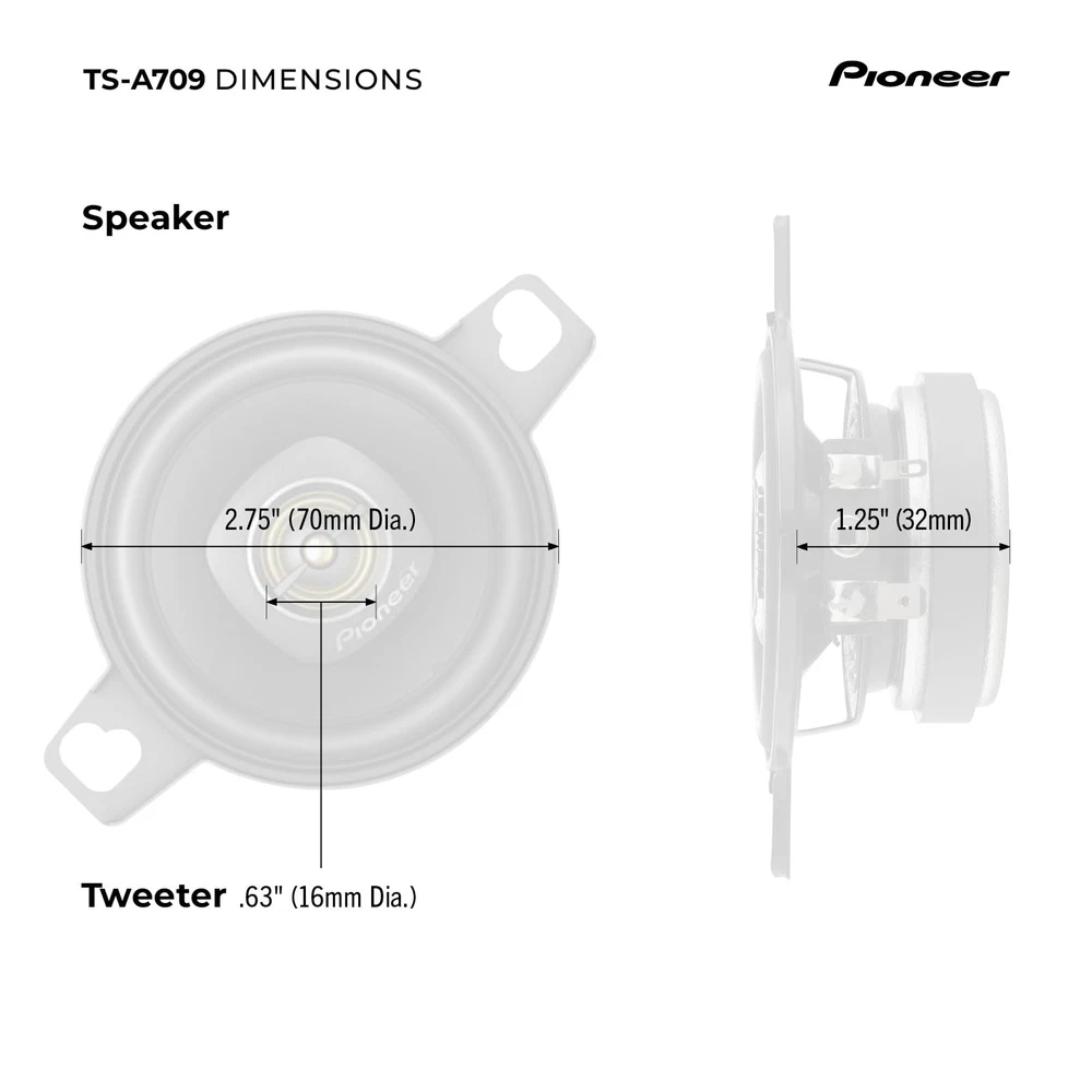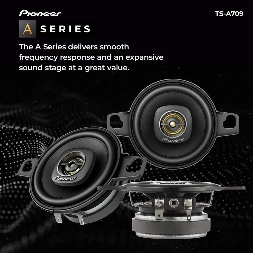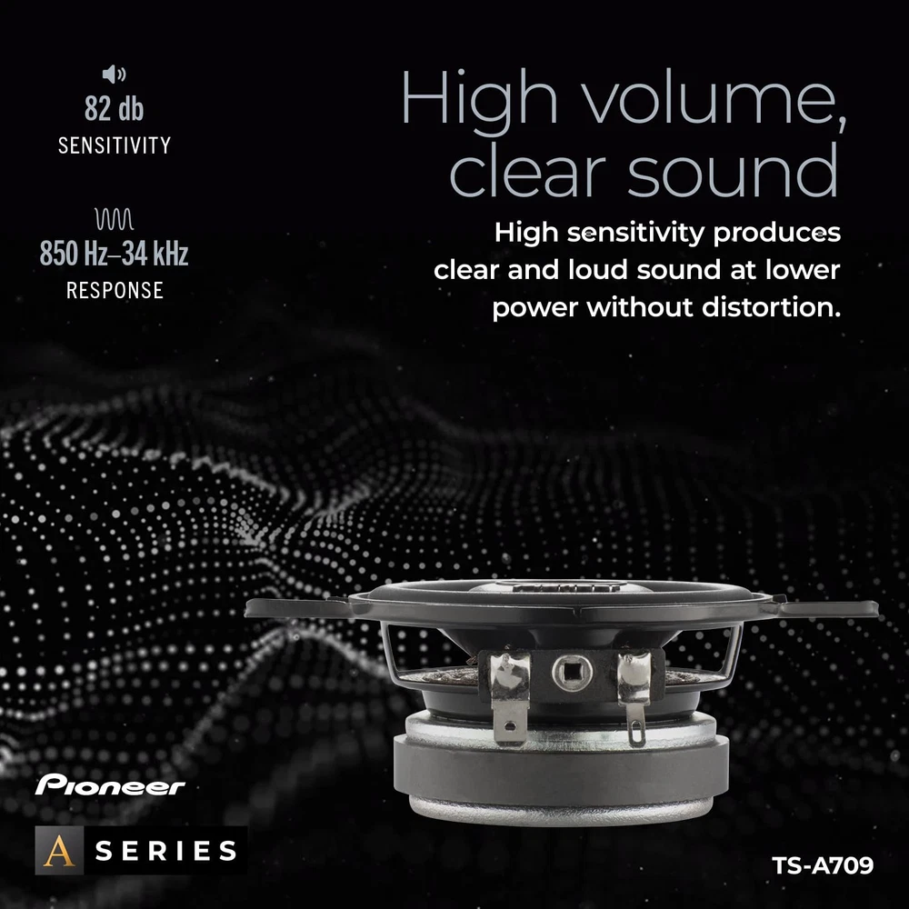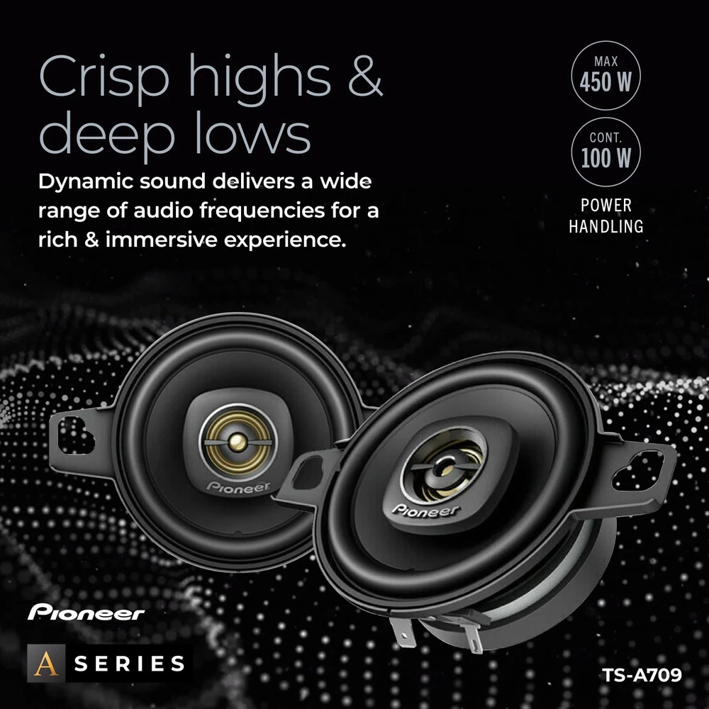 Upgrade your car's audio system with the TS-A709 2-3/4” 2-Way Car Speakers. These speakers are designed to deliver enhanced sound quality and performance, allowing you to enjoy your favorite music like never before. These speakers are a popular choice for many car models. They fit seamlessly into standard speaker openings, making installation hassle-free. Whether you're replacing existing speakers or upgrading from factory-installed ones, the TS-A709 is designed to deliver superior audio reproduction. With a maximum power handling of 450 watts and a continuous power handling of 100 watts, the TS-A709 can handle higher power levels, allowing you to enjoy louder and more dynamic audio. The speakers are designed to deliver impressive volume levels without sacrificing clarity or causing distortion. Upgrade your car's audio system with the TS-A709 2-Way Car Speakers. Experience improved sound quality, enhanced bass, and clear vocals, bringing your music to life on the road. Enjoy the quality and elevate your in-car audio experience. 2-Way Design - Enhance your car accessories with this 2-way design speaker, meaning separate drivers for reproducing different frequency ranges. Results in more accurate and balanced sound reproduction. Power Handling - Maximum power handling of 450 watts and a continuous power handling of 100 watts, these speakers deliver dynamic sound. Crisp highs and deep lows ensure that you can experience a wide range of frequencies with clarity and accuracy. Frequency Response - Receive a rich and immersive sound reproduction across different music genres. This car audio speaker contains a broad range of audio frequencies with a response range of 101 Hz to 34 kHz. Sensitivity - The sensitivity rating of 82 dB ensures that the speakers can produce clear and loud sound even with lower power inputs. This means you can enjoy your music without distortion, even at higher volume levels. Direct Fit OEM Upgrade - Is designed to be compatible with a wide range of car audio systems and can be used as a direct replacement for factory-installed speakers or as an upgrade to existing audio setups.