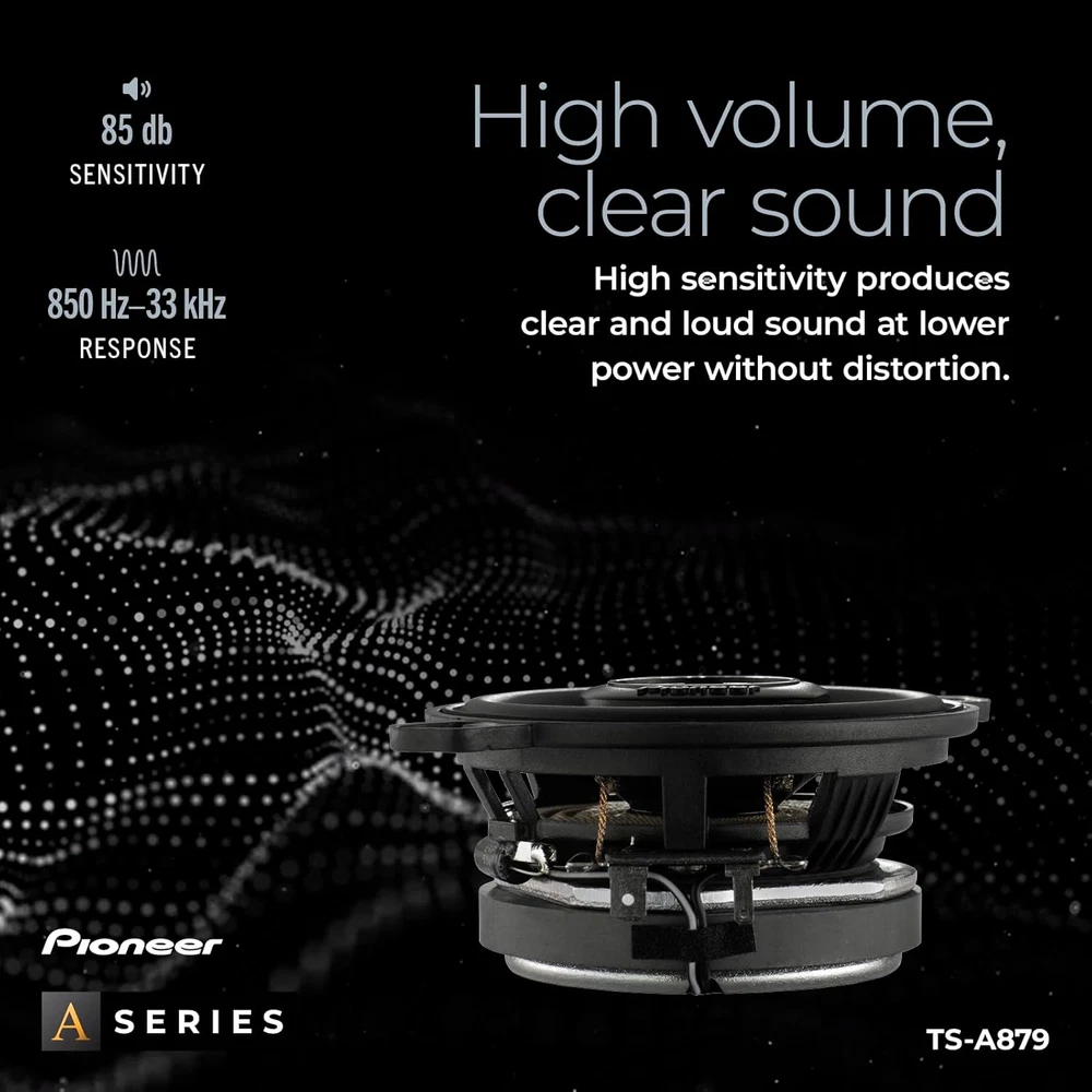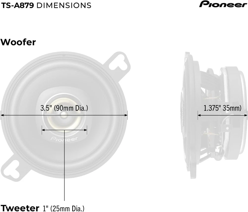 2-Way Design - Enhance your car accessories with this 2-way design speaker, meaning they have separate drivers for reproducing different frequency ranges. Results in more accurate and balanced sound reproduction. Power Handling - Maximum power handling of 450 watts and a continuous power handling of 100 watts, these speakers deliver dynamic sound. Crisp highs or deep lows ensure that you can experience a wide range of frequencies with clarity and accuracy. Frequency Response - Receive a rich and immersive sound reproduction across different music genres. This car audio speaker contains a broad range of audio frequencies with a response range of 850 Hz to 33 kHz. Sensitivity - The sensitivity rating of 85 dB ensures that the speakers can produce clear and loud sound even with lower power inputs. This means you can enjoy your music without distortion, even at higher volume levels. Direct Fit OEM Upgrade - The Pioneer TS-A879 is designed to be compatible with a wide range of car audio systems and can be used as a direct replacement for factory-installed speakers or as an upgrade to existing audio setups. Upgrade your car's audio system with the Pioneer TS-A879 3.5” 2-Way Car Speakers. These speakers are designed to deliver enhanced sound quality and performance, allowing you to enjoy your favorite music like never before. These speakers are a popular choice for many car models. They fit seamlessly into standard speaker openings, making installation hassle-free. Whether you're replacing existing speakers or upgrading from factory-installed ones, the TS-A879 is designed to deliver superior audio reproduction. With a maximum power handling of 450 watts and a continuous power handling of 100 watts, the TS-A879 can handle higher power levels, allowing you to enjoy louder and more dynamic audio. The speakers are designed to deliver impressive volume levels without sacrificing clarity or causing distortion. Upgrade your car's audio system with the Pioneer TS-A879 2-Way Car Speakers. Experience improved sound quality, enhanced bass, and clear vocals, bringing your music to life on the road. Enjoy the Pioneer quality and elevate your in-car audio experience.