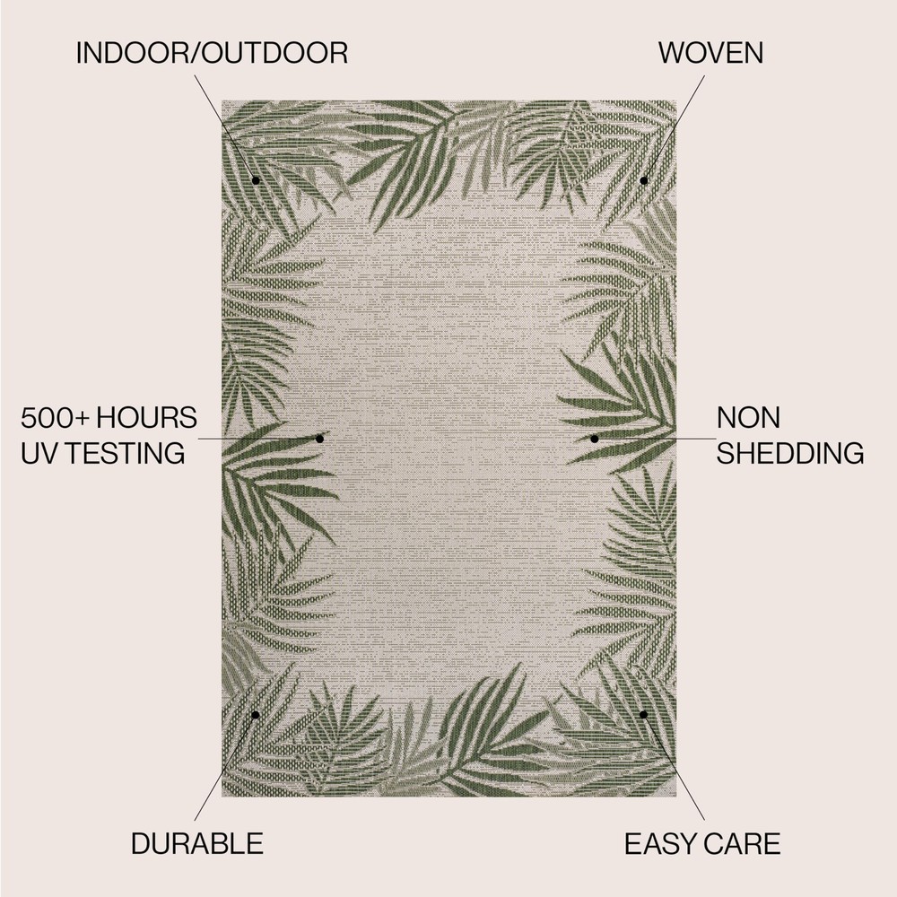 Whether you live at the beach or just love tropical style, this rug's palm frond border adds a coastal vibe. Woven from durable synthetic fiber, the design features overlapping palm tree branches. Use this family-friendly rug on the porch, or indoors in the living room, dining room or bedroom. Woven design with a short 0.23" pile Crisp color scheme in shades of green and cream Durable woven construction is made from easy-care polypropylene 100% Polypropylene No backing, use of rug pad is recommended (sold separately)