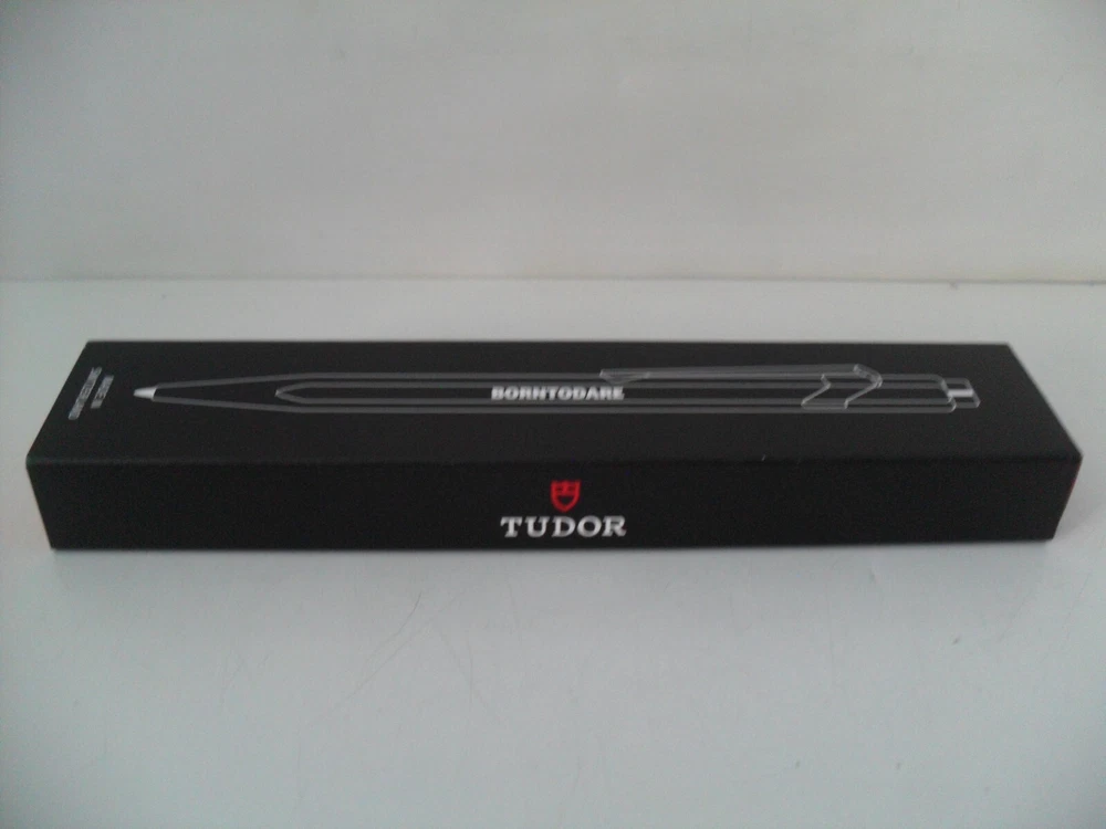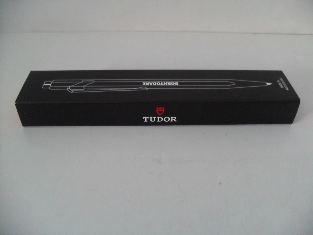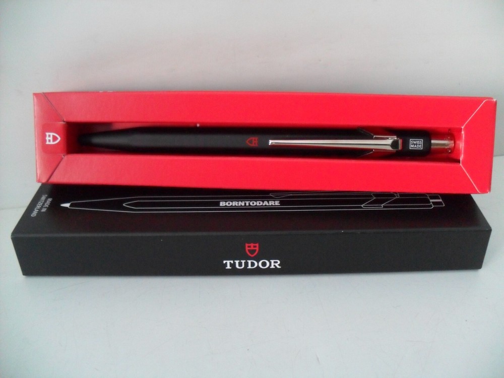 This is a RARE - TUDOR Watch Pen - Beautiful Matte Black CARAN d'ACHE Model 849. BRAND NEW - NEVER USED - EXCELLENT CONDITION! Sleek Matte Black Finish with Bright Chrome Trim. Features the Iconic TUDOR "red shield" Logo and Block Letter "BORNTODARE" TUDOR Motto Logo on the Barrel. The "849 - CARAN d'ACHE" Logo is Featured Under the Chrome Pocket Clip. Made in Switzerland - "SWISS MADE" Logo is Featured on the End of the Barrel Above the Chrome Pocket Clip. Includes TUDOR "BORNTODARE" Logo Gift Box. The ink color is blue. Non-Smoking home. Listing and template services provided by inkFrog