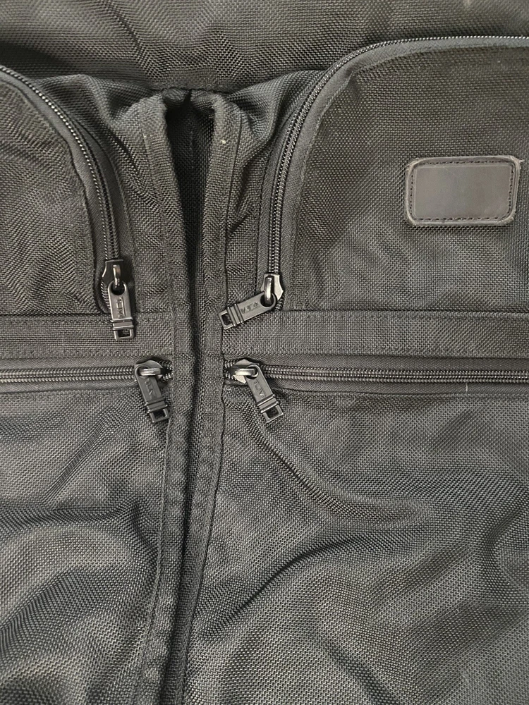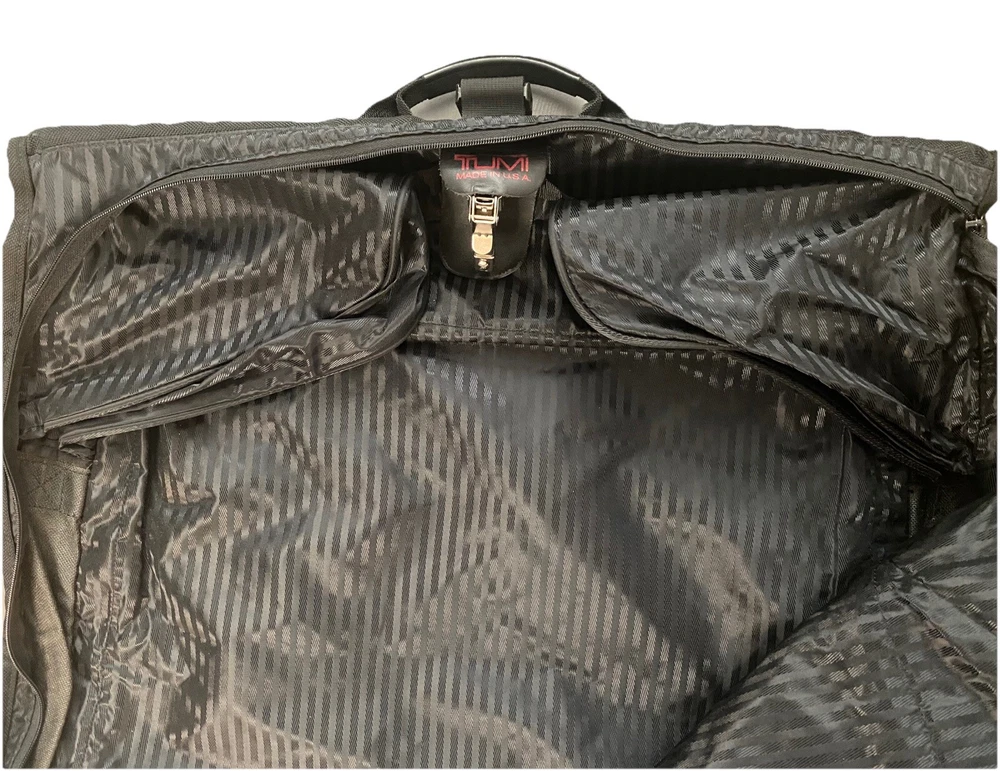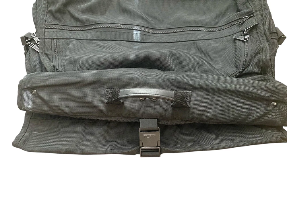 TUMI Bi-Fold Garment Bag Luggage Ballistic Nylon Suit Dress BLACK Made In USA. Pre owned condition. Measurements : Fold 24” x 23” Unfold 48” x 23”