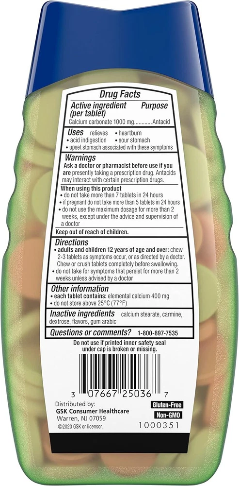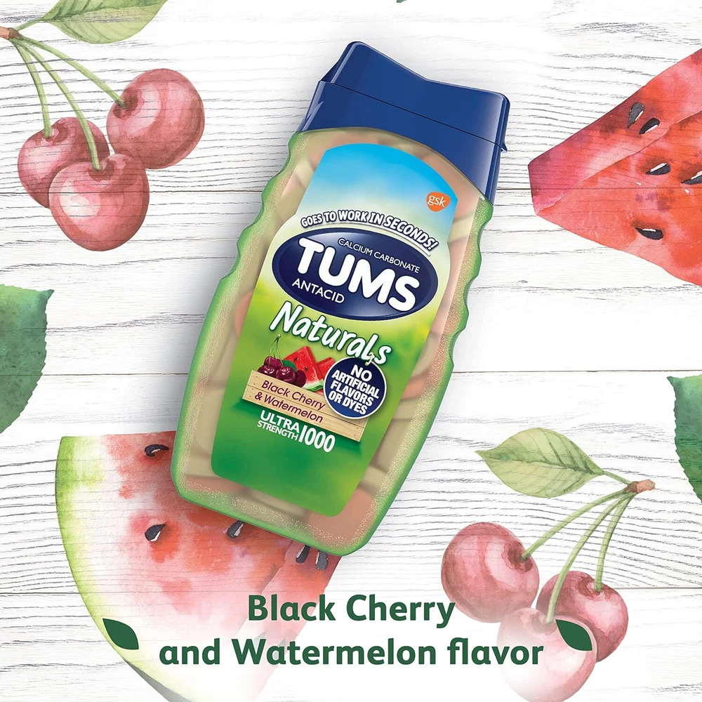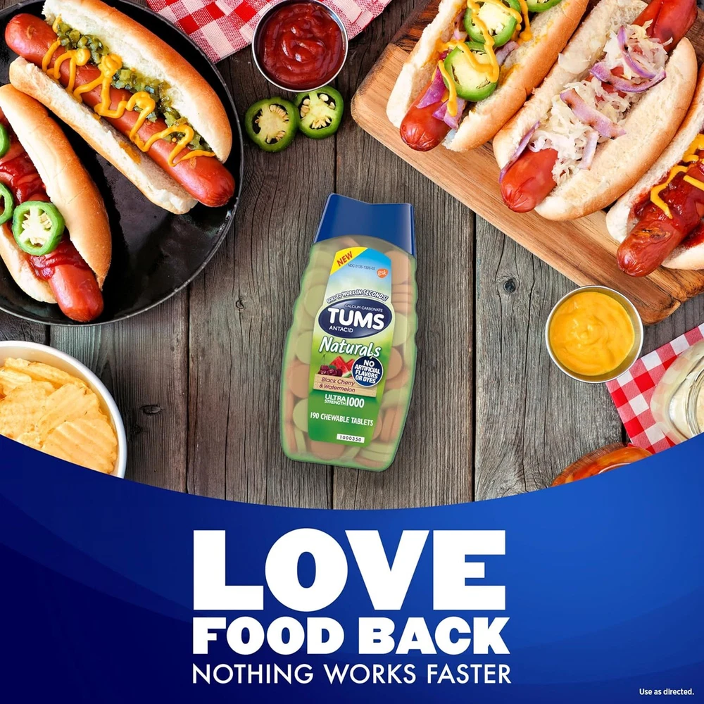 TUMS Naturals Ultra Strength Antacid Chews for Heartburn Relief, Great for a Summer BBQ - Black Cherry & Watermelon - 190 Count Product Details Product Dimensions : 2.75 x 3.04 x 6.01 inches; 11.5 ounces Item model number : 725036A Manufacturer : Haleon US Services Inc. Brand: TUMS Special Feature: fast_acting Item Weight: 11.5 Ounces Item dimensions L x W x H: 2.75 x 3.04 x 6.01 inches Product Benefits: Acidity Relief CONTENTS: 190 TUMS Naturals Ultra Strength Antacid Chews Black Cherry & Watermelon, provides fast-acting, ultra strength heartburn relief. Great tasting with no artificial flavors or dyes MULTI-SYMPTOM RELIEF: Tablets work quickly to relieve heartburn, sour stomach, acid indigestion and upset stomach associated with these symptoms FAST AND POWERFUL STRENGTH: Nothing works faster! These 1000mg antacid tablets go to work instantly by starting to neutralize acid on contact, with 33 percent more acid-fighting power per tablet than TUMS Extra Strength GLUTEN FREE: Chewable antacid tablets with no artificial flavors or dyes and the active ingredient calcium carbonate NUMBER 1 DOCTOR RECOMMENDED: TUMS antacids are the #1 recommended adult antacid brand by doctors, pharmacists and OBGYNs TRUSTED BRAND: TUMS is America’s #1 antacid, providing trusted heartburn relief for 90 years Perfect for a summer BBQ or outdoor grilling, TUMS Naturals offer fast relief from heartburn caused by spicy barbecue, grilled chicken, and other cookout cuisines Suffer from heartburn? Fast, effective relief is here for you thanks to TUMS. TUMS Naturals Ultra Strength Antacid Chews provide fast-acting, ultra strength heartburn relief. Perfect for a summer BBQ or outdoor grilling, TUMS Naturals offer fast relief from heartburn caused by spicy barbecue, grilled chicken, and other cookout cuisines. Free from artificial flavors and dyes, these heartburn tablets are non-GMO and gluten-free. Containing 1000mg of active ingredient calcium carbonate, TUMS Naturals Black Cherry & Watermelon Antacid Chewable Tablets provide ultra strength heartburn relief. It goes to work in seconds to neutralize stomach acid and relieve heartburn, acid indigestion and upset stomach associated with these symptoms. This TUMS heartburn medicine tastes great too, giving you more flavor options than anyone else. These new ultra strength antacid chewable tablets are available in Black Cherry & Watermelon. And the bottle and cap are 100% recyclable. Try them today to join the millions of people who have successfully treated their heartburn with TUMS antacids. Today, TUMS antacid products are available in a whole range of great-tasting flavors and types.