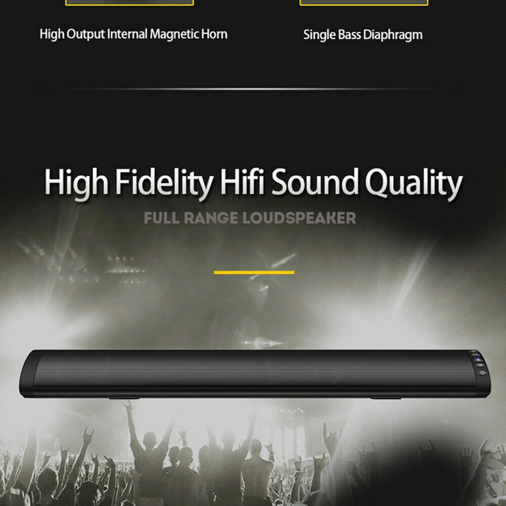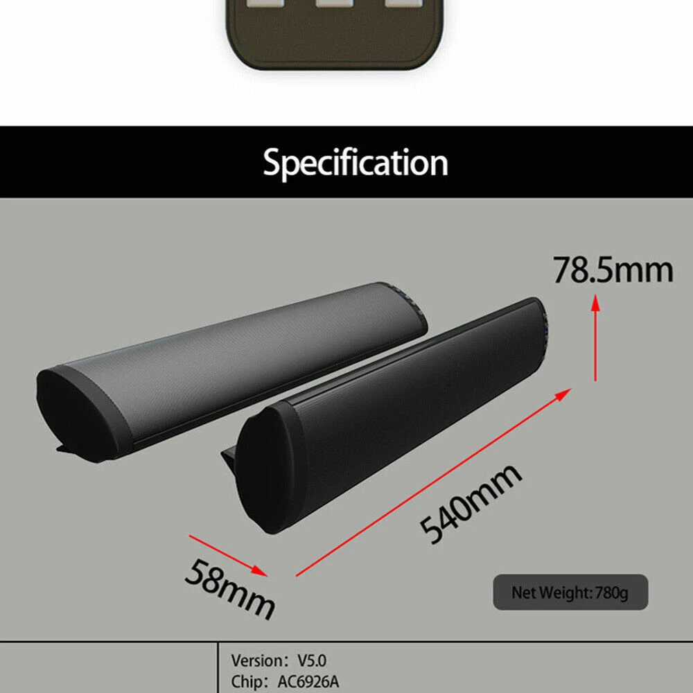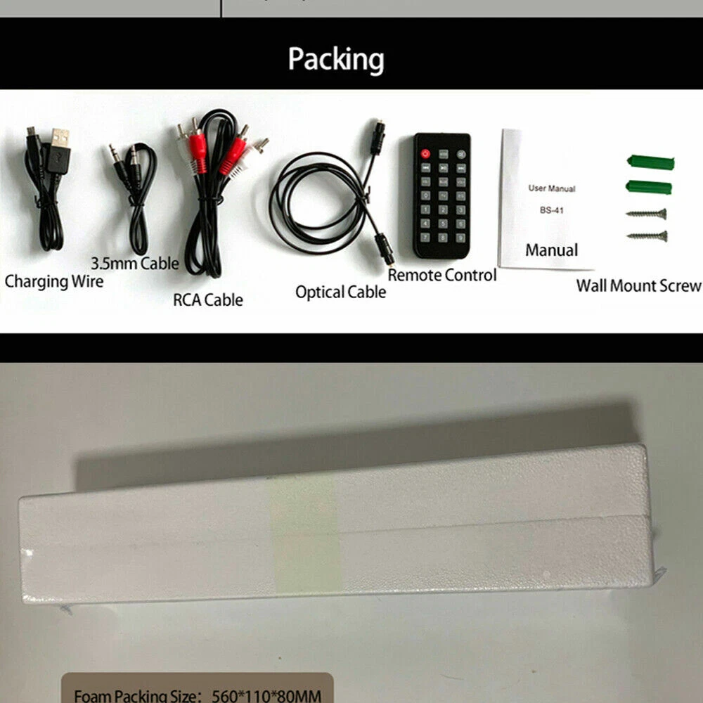 Store category You may also like TV Home Theater Soundbar Wireless Sound Bar Speaker System Subwoofer With Remote DESCRIPTION Description 1. 2 high-power speakers to help you get more powerful effect when playing music or movie 2. Support Bluetooth connection, fully compatible with most kinds of Bluetooth devices, wireless playing, do follow your heart. 3. You can also play the audio of your phone or other device via the audio cable. 4. Built-in DSP sound processor with clear sound and no noise. 5. Simple connection, easy to operate. 6. Multi-function can help you get different ways of experience 540MM Speaker Bluetooth version: V5.0 Speaker power: 10W x 2 Battery type: 18650 aluminum polymer battery Battery capacity: 2000mAh Use time: about 6 hours Rated voltage: 7.4V Overcharge protection (8.40±0.05) V Over discharge protection (5.0±0.1)V Frequency response: 20Hz-20KHz Transmission frequency range: 2402MHz-2480MHz Signal to noise ratio: ±80db Transmission distance: 8-10m Built-in radio: external antenna receiver Receiving audio segment: 87.5-108 Support TF card audio input Support 3.5mm audio input Support Remote control Support Fiber/RCA Does not support hands-free Support Hanging/Flat way With radio function 20. Weight: 780 g Colour: Black Material: PVC Size: 540*58*78.5mm Only the above package content, other products are not included. Note: Light shooting and different displays may cause the color of the item in the picture a little different from the real thing. The measurement allowed error is +/- 1-3cm. Package Contents: 1 x Speaker 1 x Remote Controller 1 x Charging Cable 1 x 3.5mm audio cable 1 x OPT cable 1 x RCA cable 2 x Wall screw 1 x User Manual Payment Delivery details return policy feedback Contact us Payment 1.We accept PayPal only. 2.All major credit cards are accepted through secure payment processor PayPal. 3.We ship to your eBay or Paypal address. Please make sure your eBay and Paypal address is correct before you pay. Delivery 1.We ship to your eBay or Paypal address. Please make sure your eBay and Paypal address is correct before you pay. 2.Items will be shipped within 1 business day when we received payment. 3.Delivery time depends on destination and other factors; 4.International buyers please note: a.Import duties, taxes and charges are not included in the item price or shipping charges. These charges are buyer’s responsibility. We will try our best to reduce the risk of the custom duties. b.Please check with your country's customs office to determine what these additional costs will be prior to
