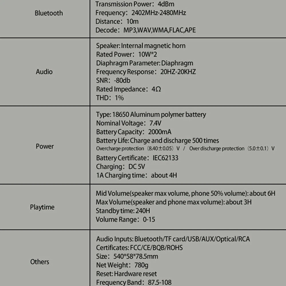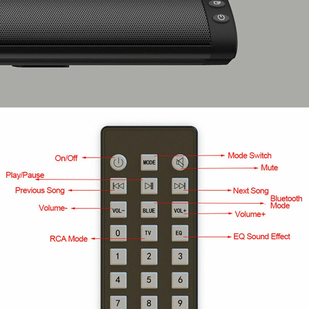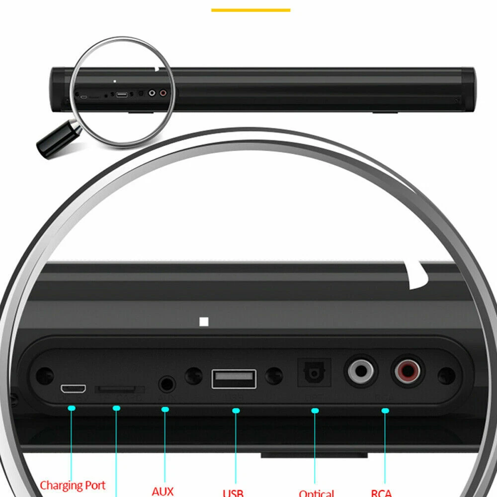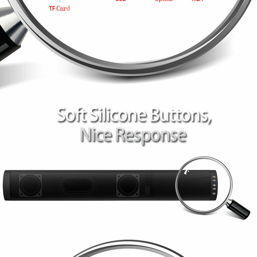 Store category You may also like TV Home Theater Soundbar Wireless Sound Bar Speaker System Subwoofer With Remote DESCRIPTION Description 1. 2 high-power speakers to help you get more powerful effect when playing music or movie 2. Support Bluetooth connection, fully compatible with most kinds of Bluetooth devices, wireless playing, do follow your heart. 3. You can also play the audio of your phone or other device via the audio cable. 4. Built-in DSP sound processor with clear sound and no noise. 5. Simple connection, easy to operate. 6. Multi-function can help you get different ways of experience 540MM Speaker Bluetooth version: V5.0 Speaker power: 10W x 2 Battery type: 18650 aluminum polymer battery Battery capacity: 2000mAh Use time: about 6 hours Rated voltage: 7.4V Overcharge protection (8.40±0.05) V Over discharge protection (5.0±0.1)V Frequency response: 20Hz-20KHz Transmission frequency range: 2402MHz-2480MHz Signal to noise ratio: ±80db Transmission distance: 8-10m Built-in radio: external antenna receiver Receiving audio segment: 87.5-108 Support TF card audio input Support 3.5mm audio input Support Remote control Support Fiber/RCA Does not support hands-free Support Hanging/Flat way With radio function 20. Weight: 780 g Colour: Black Material: PVC Size: 540*58*78.5mm Only the above package content, other products are not included. Note: Light shooting and different displays may cause the color of the item in the picture a little different from the real thing. The measurement allowed error is +/- 1-3cm. Package Contents: 1 x Speaker 1 x Remote Controller 1 x Charging Cable 1 x 3.5mm audio cable 1 x OPT cable 1 x RCA cable 2 x Wall screw 1 x User Manual Payment Delivery details return policy feedback Contact us Payment 1.We accept PayPal only. 2.All major credit cards are accepted through secure payment processor PayPal. 3.We ship to your eBay or Paypal address. Please make sure your eBay and Paypal address is correct before you pay. Delivery 1.We ship to your eBay or Paypal address. Please make sure your eBay and Paypal address is correct before you pay. 2.Items will be shipped within 1 business day when we received payment. 3.Delivery time depends on destination and other factors; 4.International buyers please note: a.Import duties, taxes and charges are not included in the item price or shipping charges. These charges are buyer’s responsibility. We will try our best to reduce the risk of the custom duties. b.Please check with your country's customs office to determine what these additional costs will be prior to