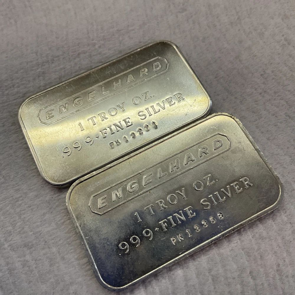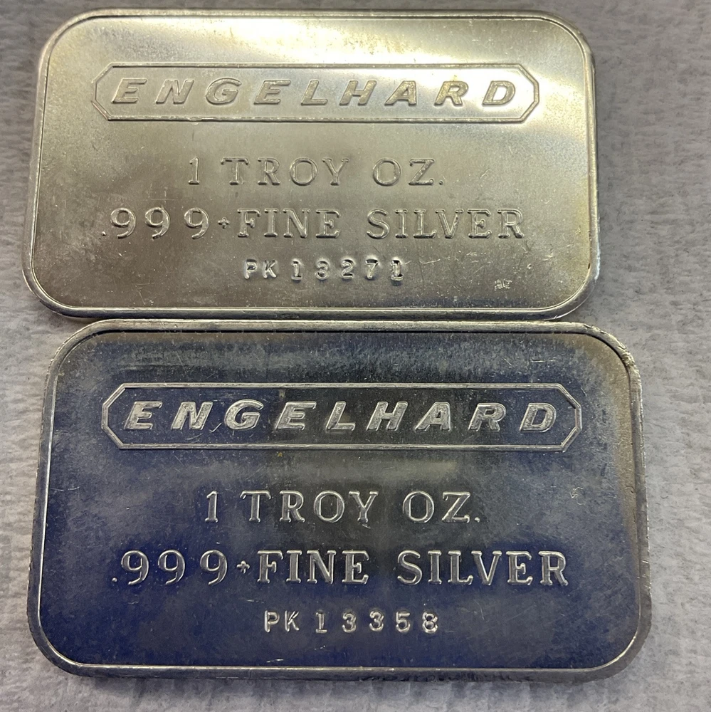 The product is a set of two Engelhard 1 oz silver bars with a horizontal style logo from the PL series. Each bar is composed of 999+ Fine Silver with a fineness of 0.999. The bars feature the Engelhard brand and were minted in the United States in 1981. Each bar contains 1 troy ounce of precious metal content, making a total of 2 oz for the set. These bars are original and highly sought after by collectors and investors in the bullion market.