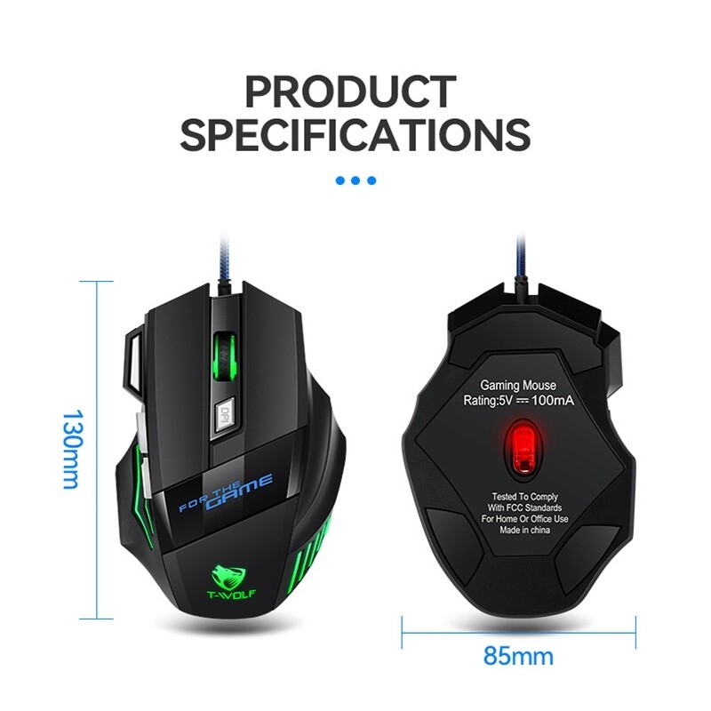 Raton Gaming con Cable USB y luz RGB Modelo T-WOLF M1. TBD0605419601A descripcion: 1. Luz suave con respiración de color RGB, puedes ajustar tus preferencias para crear una atmósfera de iluminación de juego increíble, haciendo que tu escritorio sea colorido. 2. DPI ajustable en tres niveles, 800-1200-2400DPI 3. Diseño ergonómico, agarre cómodo, más suave 4. Material: ABS 5. Número de teclas: 7 teclas 6. DPI: 800/1200/2400 7. Efecto de iluminación: luz con respiración de color 8. Longitud del cable: aproximadamente 140 cm 9. Tamaño del producto: 130 x 85 x 40 mm 10. Peso: 127 gramos Especificación: Peso del paquete Peso de un paquete 0.16kgs / 0.36lb Tamaño de un solo producto 17cm * 12cm * 7cm / 6.69inch * 4.72inch * 2.76inch