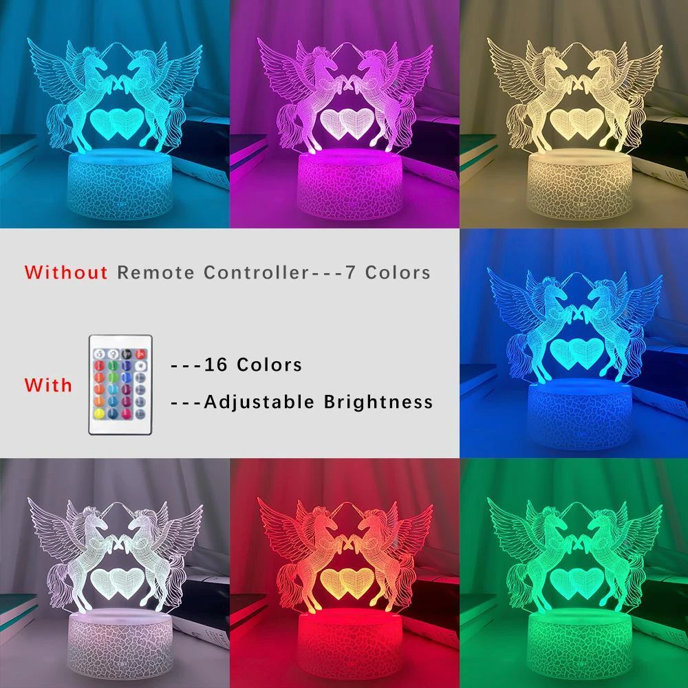 Free and fast shipping , shipping take up 1-7 Business Days 30 Day Return Accepted EASY PAYMENT via PayPal, Credit Card, PayPal Credit, Google Pay... Table Lamp LED 3d Unicorn Plastic Small Multicolor Modern Novelty Touch USB Deco Features: * 7 Color Automatically color changing mode with touch button switch. Press the touch button to last color, then press it again, auto color changing mode works. * 16 Color mode with touch button switch and remote controller. can control the light both by the touch button and remote controller. Specifications: Item Type: 3D LED Night Light Base Material: ABS Plastic Light Guide Plate Material: Acrylic Process: Laser Engraving Power Mode:USB/Battery (Battery not included) Input Voltage: DC5V Light Source: LED Light Color: 7 Colorful Change or 16 Colorful Change Light Pattern: 3D Stereoscopic Figure(As Pictures Show) Switch Mode: Touch Switch / Touch Switch+Remote controller Product voltage: 5V Product power: 3W Package Included: 7Color No Remote(Remote controller not included) 1 x Acrylic Plate 1 x Base 1 x USB Cable 1 x English Instructions 16 Color Remote 1 x Acrylic Plate 1 x Base 1 x USB Cable 1 x Remote controller(Battery not included) 1 x English Instructions REVIEWS The product came very well packaged. I'm very happy. thank you for everything. Seller strongly recommended. This is great! I definitely recommend! Product looks amazing Delivery was fast. Excellent seller, great communication. I advise everyone to buy it!