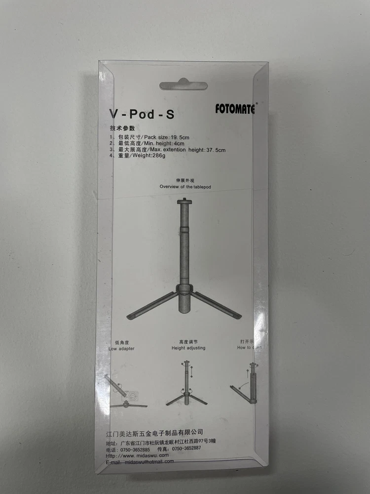 Introducing the Fotomate V-Pod S, a lightweight and versatile table top tripod designed to fit your camera perfectly. Made of high-quality aluminum material, this tripod is stable and durable. Its compact design makes it easy to carry around, making it an ideal choice for photographers who love to capture moments on the go. The Fotomate V-Pod S is perfect for taking photos of your products, landscapes, portraits, and more. Its sturdy construction ensures that your camera remains stable and focused on your subject, while its adjustable features allow you to change the angle and height of your shot to suit your needs. Whether you're a professional photographer or just starting out, this tripod is a must-have accessory for your camera gear. 7.6 inches collapsed height Min height 1.5 inches Max height 14.75 inches Weight 10 ounces