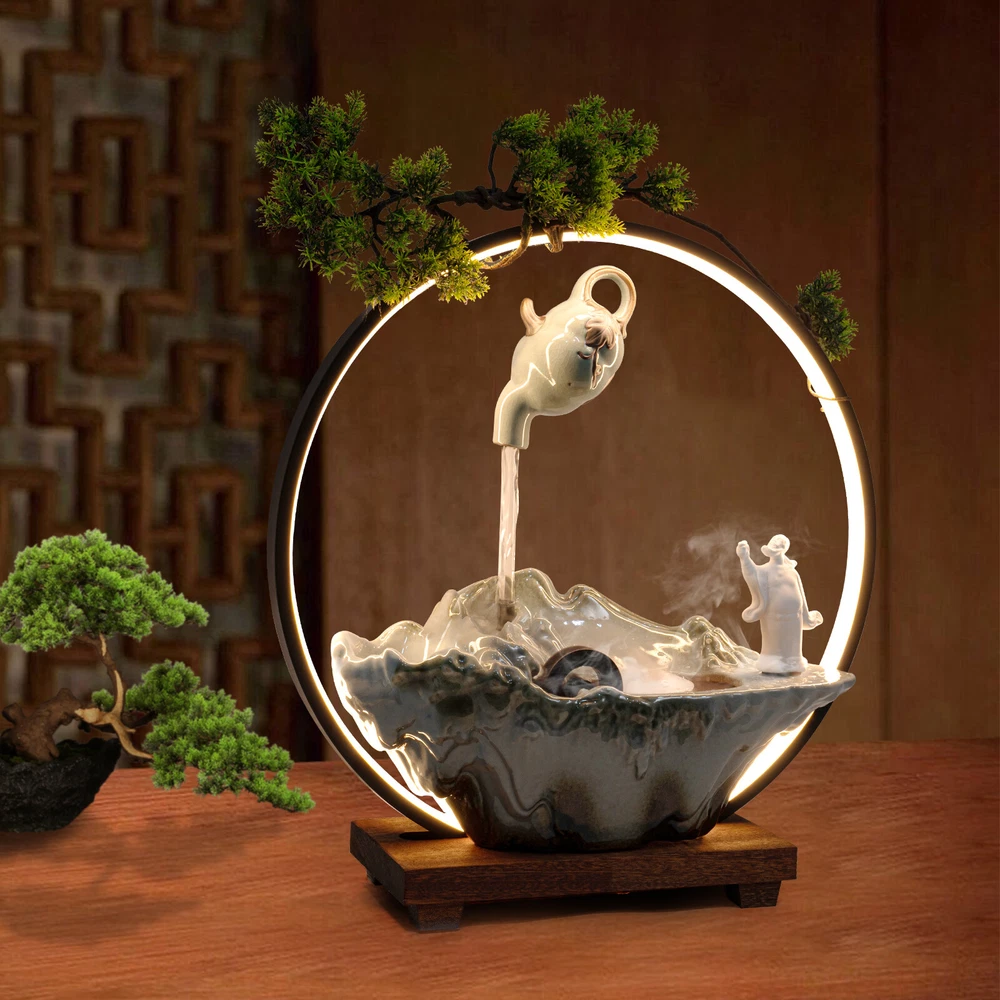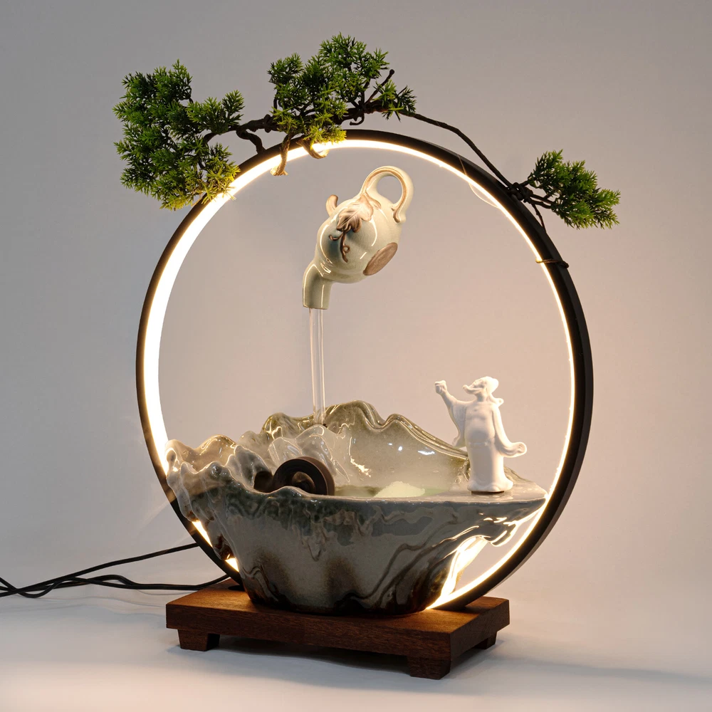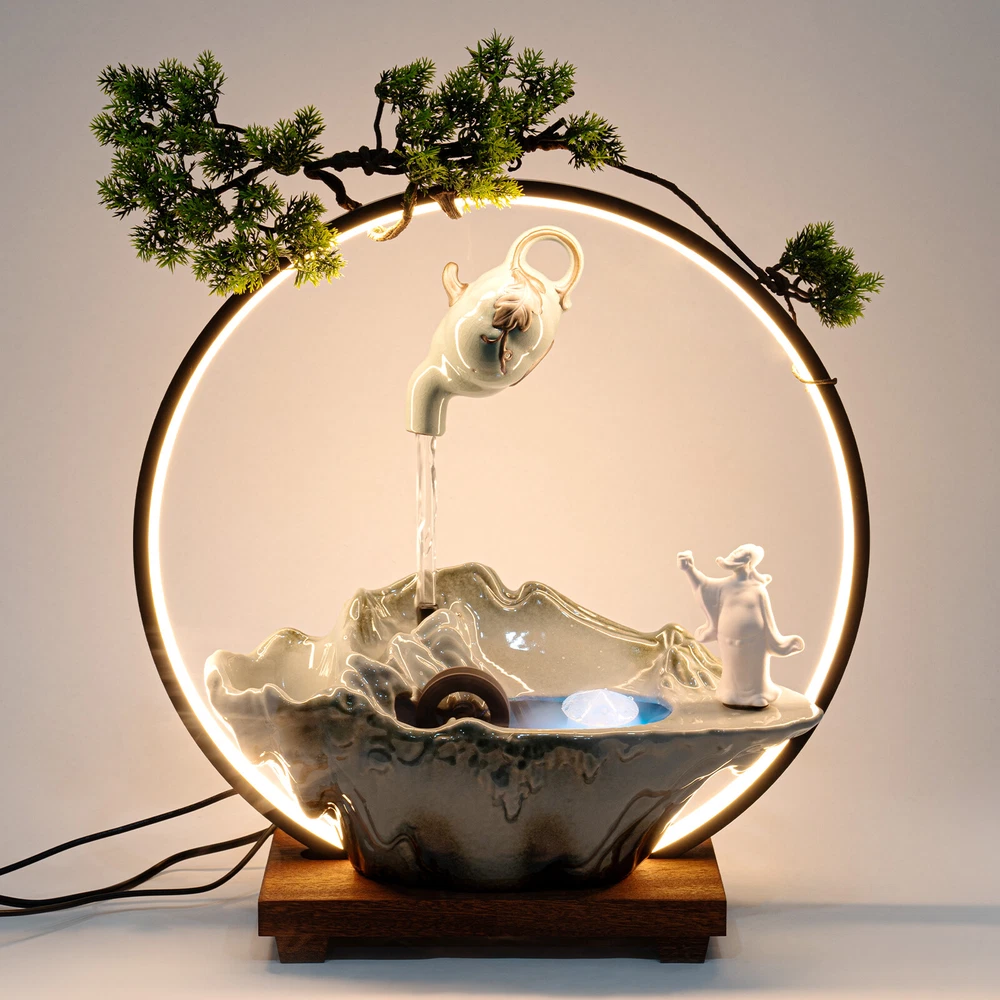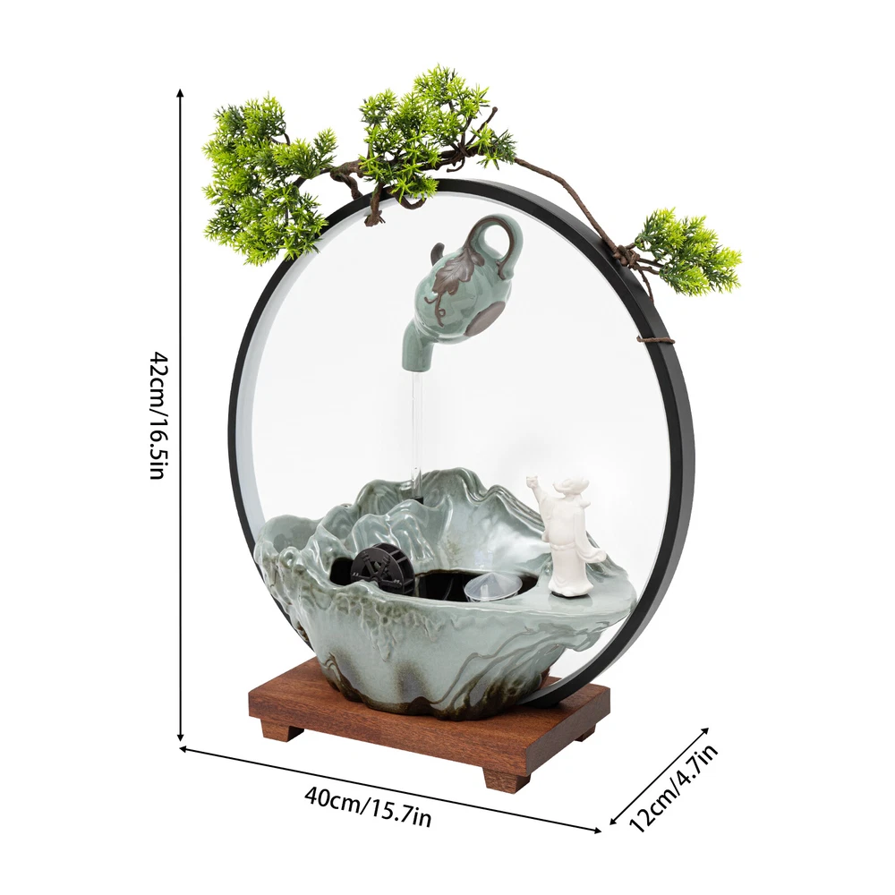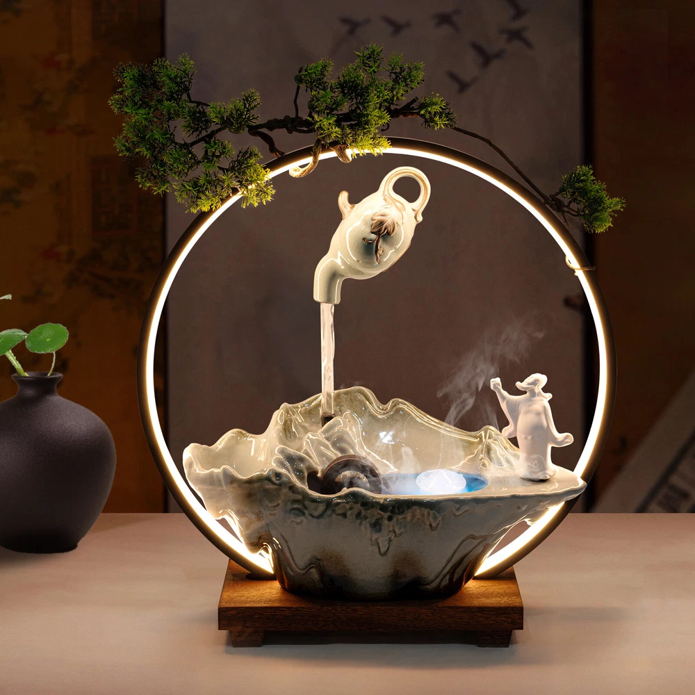 Specifications Color: Black, Wood Color Shape: Round Style: Antique Mount Type: Tabletop Control Type: Manual Assembly Required: Yes Indoor/Outdoor Usage: Indoor Surface Treatment: Glaze Material: Ceramic, Solid Wood, PC, Plastic, Aluminium Ironwork Atomizer Light Color: Red, Orange, Yellow, Green, Blue, Purple Power: 3 W (Pump), 24 W (Atomizer), 13 W ( Lamp Ring ) Light Color: Warm Voltage: 110V Efficiency: E Light Source: LED(Included) Power Source: Corded Electric Plug Type: US Standard Power Cord Length: About 1.2m/3.93ft Illumination Area: 7-10m/22.96-32.8ft Atomized Area: 50cm/19.69in Gross Weight: 3.5kg/7.71lbs Product Size: 40*12*42cm/15.7*4.7*16.5 in Package Size: 42*42*22cm/16.5 *16.5 *8.66in Tabletop Water Fountain, Indoor Waterfall with LED Light Mist Desk Fountain Welcome to my store: Description As life moves at such a fast pace, we often feel tired and anxious and want a piece of peace and comfort. Our tabletop water fountain with an atomizer design and LED light ring can bring you a warm and romantic atmosphere, bringing a sense of peace and warmth to your life. It is a beautiful and generous desktop ornament that adds a little artistic touch to your life. Whether you are at work or leisure, open it, and you can let your mind get soothing and relaxation. Key Features Sturdy and Durable: The product is made of high-quality ceramic, solid wood, PC, plastic, and aluminum ironwork materials, using a glazing process, with uniform and stable color, ensuring safety and durability Relieve Stress : After a long day's work, you can recline in your chair and feel the sound of its crisp running water, surrounded by soft mist, and enjoy a quiet moment alone to let the stress of your day disappear. You can also use it when trying to meditate or practice yoga. Atomizer Design: It comes with an atomizer and the misting effect creates a hazy and romantic atmosphere, adding to the aesthetics of the product whilst also bringing the humidity of the air around you to a healthier level, giving you a comfortable living experience. Stunning LED Visuals: It adopts an energy-saving and environmentally friendly LED light source, with simulated landscape modeling, which not only presents you with a beautiful visual experience but also protects your eyes. Beautifully Decorated: Exquisite pottery, simulated cliff cypress and waterwheel, and lifelike carved bard make this product a well-deserved piece of art deco, like a wonderful landscape painting. Its elegant appearance and suitable size can add color to any tabletop, living room, or bedroom. Auspicious Symbol: In Chinese culture, the continuous flow of water symbolizes rolling wealth, and the bard who is singing to the wine signifies having fun in time and a pleasant life. Therefore, it is especially suitable for placing in homes and offices. You can also give this meaningful product as a gift to your friends, family, and colleagues on birthdays, Christmas, Thanksgiving, or other festivals. Easy to Clean: The product's smooth surface and simple construction make it easy to clean, all you need to do is gently wipe it down with a dry cloth or wet wipe. Protective Packaging: The foam provides comprehensive protection for products to ensure that it is fully delivered to you to the greatest extent possible. Details Solid Base: The large wood base increases the stress area, so it can maintain the stability of the product. Practical Switch: The one-touch switch makes it easy to switch the power on and off with one hand at any time. Uneven Rockery: It is convenient for you to make your arrangement on it, or plant your greenery. Application The illumination area is 22.96-32.8ft and the atomized area is 19.69in. It can be placed as a decorative item in the living room, corridor, entrance, study room, dining room, bookstore, study room, tea break room, office, bedroom, yoga room, meditation room, conference room, and so on. It is also suitable as a beautiful gift for your leaders, colleagues, friends, and relatives. How to Install 1. Insert the lamp ring into the groove of the solid wood base. 2. Place the reservoir smoothly on the solid wood base. 3. Connect the water hose to the outlet of the water dispenser. 4. Connect the other end of the water hose to the pump. 5. Pull the pump power plug out of the water dispenser. 6. Place the atomizer into the spout of the water dispenser. 7. Pull the atomizer power connection port out of the water dispenser. 8. Insert the hanging kettle support into the water dispenser outlet port. 9. Insert the hanging teapot into the acrylic water pipe. 10. Place the white bard ornament on the water runner. 11. Wrap the simulated cliff cypress around the LED light ring 12. Place the inverted incense(not included) on the lamp ring. Specifications Color: Black, Wood Color Shape: Round Style: Antique Mount Type: Tabletop Control Type: Manual Assembly Required: Yes Indoor/Outdoor Usage: Indoor Surface Treatment: Glaze Material: Ceramic, Solid Wood, PC, Plastic, Aluminium Ironwork Atomizer Light Color: Red, Orange, Yellow, Green, Blue, Purple Power: 3 W (Pump), 24 W (Atomizer), 13 W ( Lamp Ring ) Light Color: Warm Voltage: 110V Efficiency: E Light Source: LED(Included) Power Source: Corded Electric Plug Type: US Standard Power Cord Length: About 1.2m/3.93ft Illumination Area: 7-10m/22.96-32.8ft Atomized Area: 50cm/19.69in Gross Weight: 3.5kg/7.71lbs Product Size: 40*12*42cm/15.7*4.7*16.5 in Package Size: 42*42*22cm/16.5 *16.5 *8.66in Package Included 1* Tabletop Water Fountains Other Accessories Required for Installation Notes Please do not switch on the pump without water. When installed, the pump should be placed in water and the water level should exceed the pump. To avoid short-circuiting due to corrosion, please use clean water. Please note that this product does not include fresh greenery or inverted incense. Please do not operate the pump without water. If the amount of water discharged decreases, please promptly check whether th