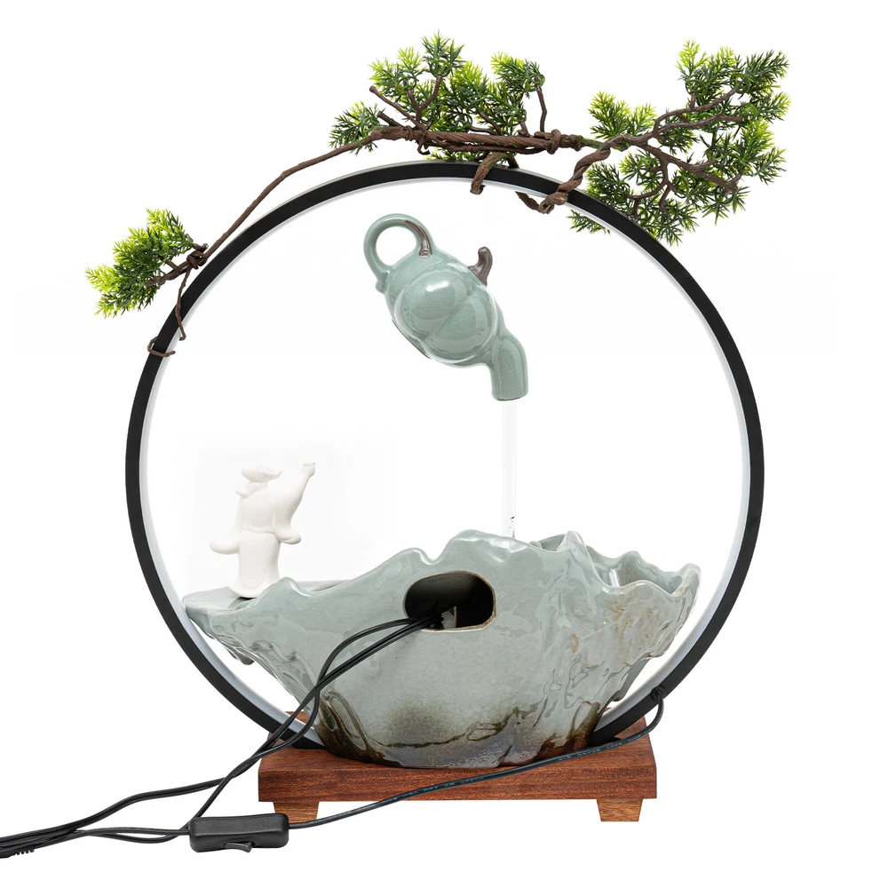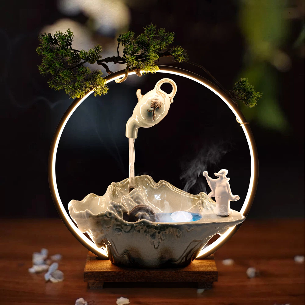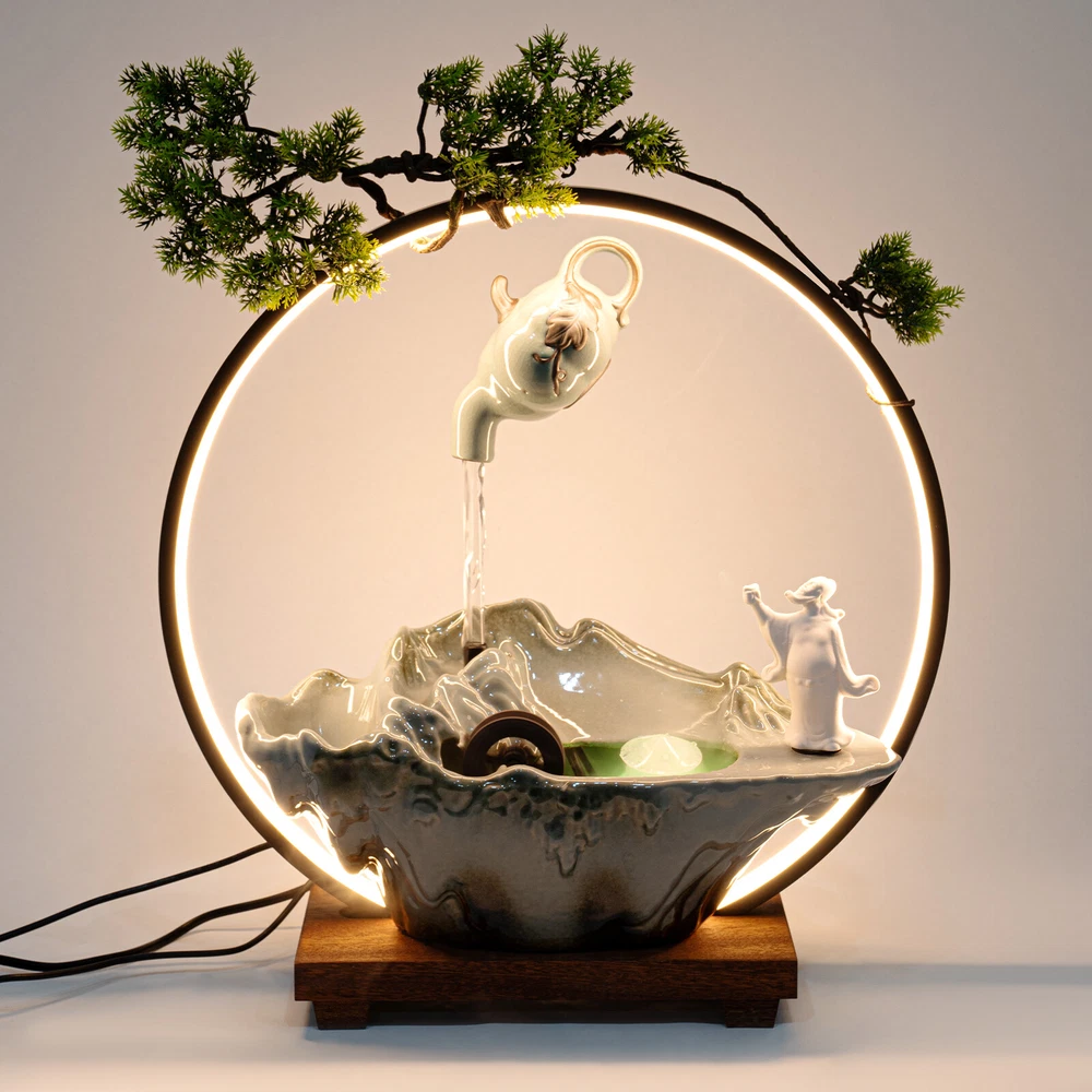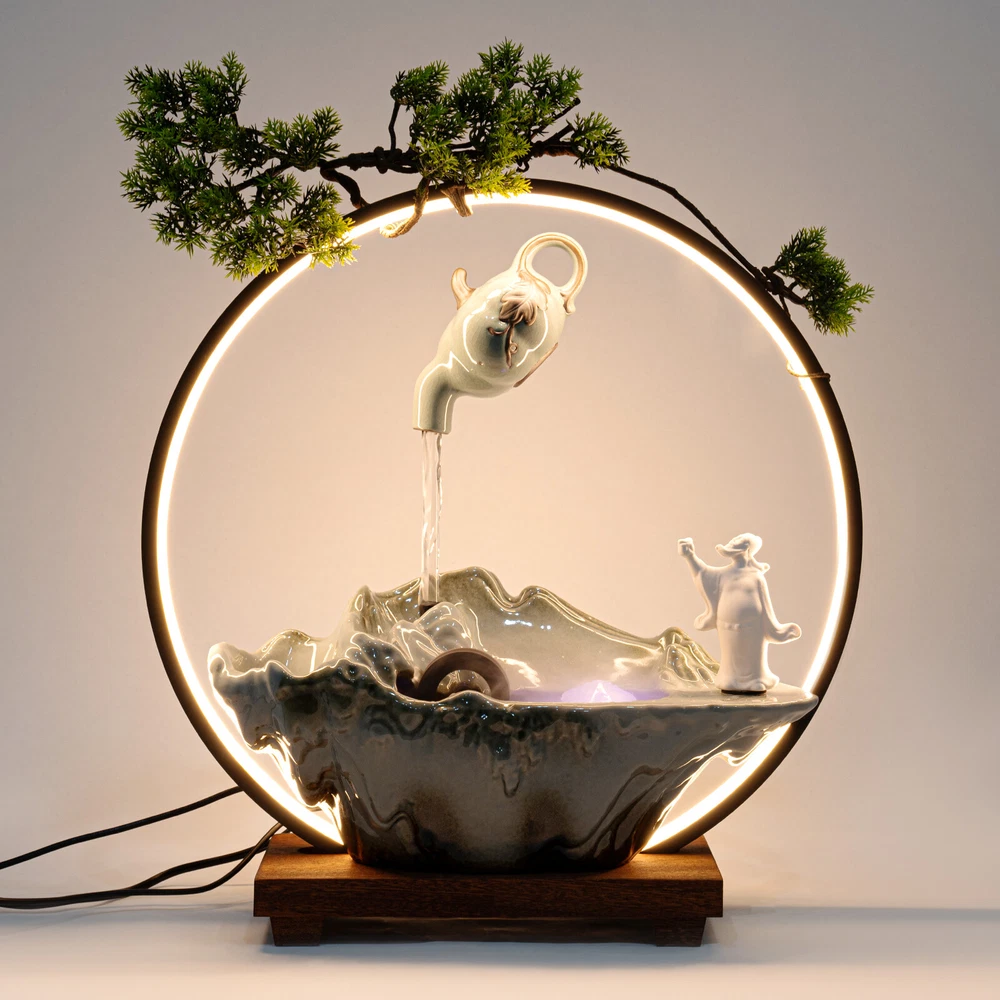 Specifications Color: Black, Wood Color Shape: Round Style: Antique Mount Type: Tabletop Control Type: Manual Assembly Required: Yes Indoor/Outdoor Usage: Indoor Surface Treatment: Glaze Material: Ceramic, Solid Wood, PC, Plastic, Aluminium Ironwork Atomizer Light Color: Red, Orange, Yellow, Green, Blue, Purple Power: 3 W (Pump), 24 W (Atomizer), 13 W ( Lamp Ring ) Light Color: Warm Voltage: 110V Efficiency: E Light Source: LED(Included) Power Source: Corded Electric Plug Type: US Standard Power Cord Length: About 1.2m/3.93ft Illumination Area: 7-10m/22.96-32.8ft Atomized Area: 50cm/19.69in Gross Weight: 3.5kg/7.71lbs Product Size: 40*12*42cm/15.7*4.7*16.5 in Package Size: 42*42*22cm/16.5 *16.5 *8.66in Tabletop Water Fountain, Indoor Waterfall with LED Light Mist Desk Fountain Welcome to my store: Description As life moves at such a fast pace, we often feel tired and anxious and want a piece of peace and comfort. Our tabletop water fountain with an atomizer design and LED light ring can bring you a warm and romantic atmosphere, bringing a sense of peace and warmth to your life. It is a beautiful and generous desktop ornament that adds a little artistic touch to your life. Whether you are at work or leisure, open it, and you can let your mind get soothing and relaxation. Key Features Sturdy and Durable: The product is made of high-quality ceramic, solid wood, PC, plastic, and aluminum ironwork materials, using a glazing process, with uniform and stable color, ensuring safety and durability Relieve Stress : After a long day's work, you can recline in your chair and feel the sound of its crisp running water, surrounded by soft mist, and enjoy a quiet moment alone to let the stress of your day disappear. You can also use it when trying to meditate or practice yoga. Atomizer Design: It comes with an atomizer and the misting effect creates a hazy and romantic atmosphere, adding to the aesthetics of the product whilst also bringing the humidity of the air around you to a healthier level, giving you a comfortable living experience. Stunning LED Visuals: It adopts an energy-saving and environmentally friendly LED light source, with simulated landscape modeling, which not only presents you with a beautiful visual experience but also protects your eyes. Beautifully Decorated: Exquisite pottery, simulated cliff cypress and waterwheel, and lifelike carved bard make this product a well-deserved piece of art deco, like a wonderful landscape painting. Its elegant appearance and suitable size can add color to any tabletop, living room, or bedroom. Auspicious Symbol: In Chinese culture, the continuous flow of water symbolizes rolling wealth, and the bard who is singing to the wine signifies having fun in time and a pleasant life. Therefore, it is especially suitable for placing in homes and offices. You can also give this meaningful product as a gift to your friends, family, and colleagues on birthdays, Christmas, Thanksgiving, or other festivals. Easy to Clean: The product's smooth surface and simple construction make it easy to clean, all you need to do is gently wipe it down with a dry cloth or wet wipe. Protective Packaging: The foam provides comprehensive protection for products to ensure that it is fully delivered to you to the greatest extent possible. Details Solid Base: The large wood base increases the stress area, so it can maintain the stability of the product. Practical Switch: The one-touch switch makes it easy to switch the power on and off with one hand at any time. Uneven Rockery: It is convenient for you to make your arrangement on it, or plant your greenery. Application The illumination area is 22.96-32.8ft and the atomized area is 19.69in. It can be placed as a decorative item in the living room, corridor, entrance, study room, dining room, bookstore, study room, tea break room, office, bedroom, yoga room, meditation room, conference room, and so on. It is also suitable as a beautiful gift for your leaders, colleagues, friends, and relatives. How to Install 1. Insert the lamp ring into the groove of the solid wood base. 2. Place the reservoir smoothly on the solid wood base. 3. Connect the water hose to the outlet of the water dispenser. 4. Connect the other end of the water hose to the pump. 5. Pull the pump power plug out of the water dispenser. 6. Place the atomizer into the spout of the water dispenser. 7. Pull the atomizer power connection port out of the water dispenser. 8. Insert the hanging kettle support into the water dispenser outlet port. 9. Insert the hanging teapot into the acrylic water pipe. 10. Place the white bard ornament on the water runner. 11. Wrap the simulated cliff cypress around the LED light ring 12. Place the inverted incense(not included) on the lamp ring. Specifications Color: Black, Wood Color Shape: Round Style: Antique Mount Type: Tabletop Control Type: Manual Assembly Required: Yes Indoor/Outdoor Usage: Indoor Surface Treatment: Glaze Material: Ceramic, Solid Wood, PC, Plastic, Aluminium Ironwork Atomizer Light Color: Red, Orange, Yellow, Green, Blue, Purple Power: 3 W (Pump), 24 W (Atomizer), 13 W ( Lamp Ring ) Light Color: Warm Voltage: 110V Efficiency: E Light Source: LED(Included) Power Source: Corded Electric Plug Type: US Standard Power Cord Length: About 1.2m/3.93ft Illumination Area: 7-10m/22.96-32.8ft Atomized Area: 50cm/19.69in Gross Weight: 3.5kg/7.71lbs Product Size: 40*12*42cm/15.7*4.7*16.5 in Package Size: 42*42*22cm/16.5 *16.5 *8.66in Package Included 1* Tabletop Water Fountains Other Accessories Required for Installation Notes Please do not switch on the pump without water. When installed, the pump should be placed in water and the water level should exceed the pump. To avoid short-circuiting due to corrosion, please use clean water. Please note that this product does not include fresh greenery or inverted incense. Please do not operate the pump without water. If the amount of water discharged decreases, please promptly check whether th