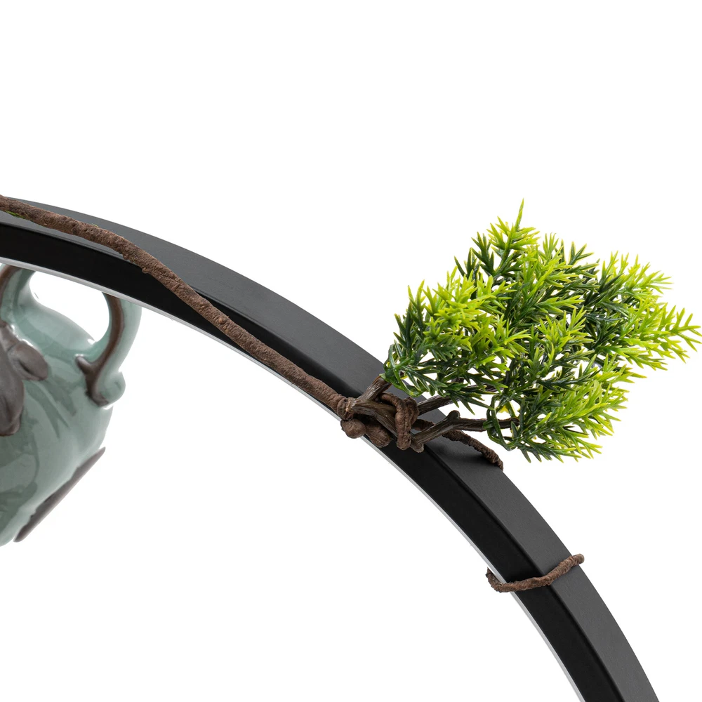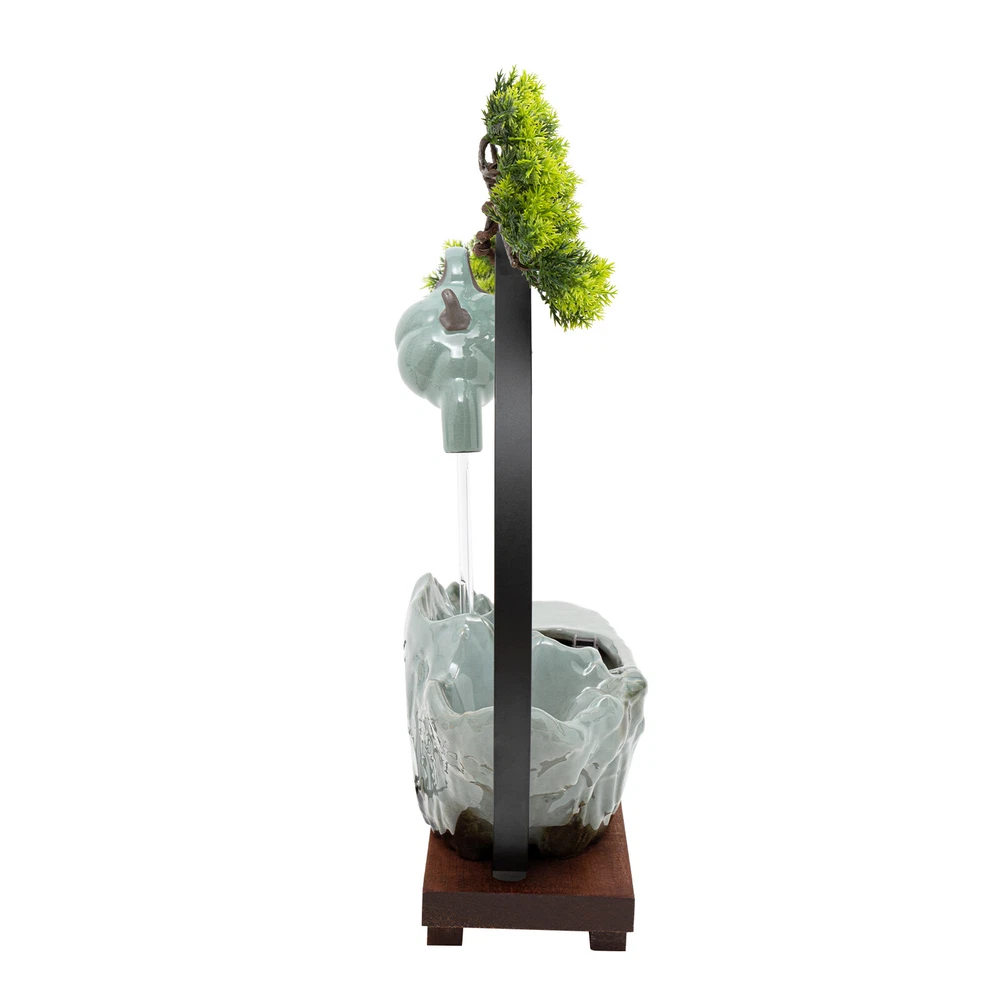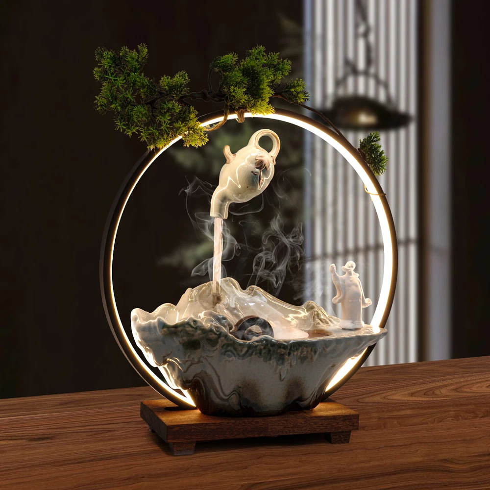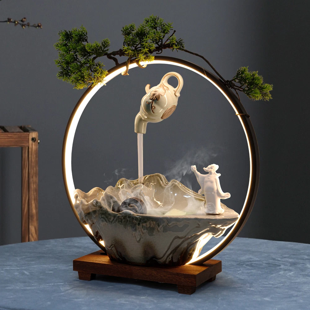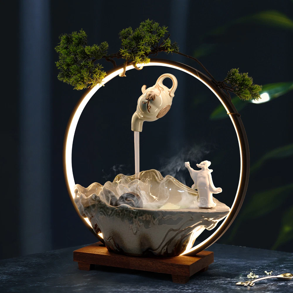 Specifications Color: Black, Wood Color Shape: Round Style: Antique Mount Type: Tabletop Control Type: Manual Assembly Required: Yes Indoor/Outdoor Usage: Indoor Surface Treatment: Glaze Material: Ceramic, Solid Wood, PC, Plastic, Aluminium Ironwork Atomizer Light Color: Red, Orange, Yellow, Green, Blue, Purple Power: 3 W (Pump), 24 W (Atomizer), 13 W ( Lamp Ring ) Light Color: Warm Voltage: 110V Efficiency: E Light Source: LED(Included) Power Source: Corded Electric Plug Type: US Standard Power Cord Length: About 1.2m/3.93ft Illumination Area: 7-10m/22.96-32.8ft Atomized Area: 50cm/19.69in Gross Weight: 3.5kg/7.71lbs Product Size: 40*12*42cm/15.7*4.7*16.5 in Package Size: 42*42*22cm/16.5 *16.5 *8.66in Tabletop Water Fountain, Indoor Waterfall with LED Light Mist Desk Fountain Welcome to my store: Description As life moves at such a fast pace, we often feel tired and anxious and want a piece of peace and comfort. Our tabletop water fountain with an atomizer design and LED light ring can bring you a warm and romantic atmosphere, bringing a sense of peace and warmth to your life. It is a beautiful and generous desktop ornament that adds a little artistic touch to your life. Whether you are at work or leisure, open it, and you can let your mind get soothing and relaxation. Key Features Sturdy and Durable: The product is made of high-quality ceramic, solid wood, PC, plastic, and aluminum ironwork materials, using a glazing process, with uniform and stable color, ensuring safety and durability Relieve Stress : After a long day's work, you can recline in your chair and feel the sound of its crisp running water, surrounded by soft mist, and enjoy a quiet moment alone to let the stress of your day disappear. You can also use it when trying to meditate or practice yoga. Atomizer Design: It comes with an atomizer and the misting effect creates a hazy and romantic atmosphere, adding to the aesthetics of the product whilst also bringing the humidity of the air around you to a healthier level, giving you a comfortable living experience. Stunning LED Visuals: It adopts an energy-saving and environmentally friendly LED light source, with simulated landscape modeling, which not only presents you with a beautiful visual experience but also protects your eyes. Beautifully Decorated: Exquisite pottery, simulated cliff cypress and waterwheel, and lifelike carved bard make this product a well-deserved piece of art deco, like a wonderful landscape painting. Its elegant appearance and suitable size can add color to any tabletop, living room, or bedroom. Auspicious Symbol: In Chinese culture, the continuous flow of water symbolizes rolling wealth, and the bard who is singing to the wine signifies having fun in time and a pleasant life. Therefore, it is especially suitable for placing in homes and offices. You can also give this meaningful product as a gift to your friends, family, and colleagues on birthdays, Christmas, Thanksgiving, or other festivals. Easy to Clean: The product's smooth surface and simple construction make it easy to clean, all you need to do is gently wipe it down with a dry cloth or wet wipe. Protective Packaging: The foam provides comprehensive protection for products to ensure that it is fully delivered to you to the greatest extent possible. Details Solid Base: The large wood base increases the stress area, so it can maintain the stability of the product. Practical Switch: The one-touch switch makes it easy to switch the power on and off with one hand at any time. Uneven Rockery: It is convenient for you to make your arrangement on it, or plant your greenery. Application The illumination area is 22.96-32.8ft and the atomized area is 19.69in. It can be placed as a decorative item in the living room, corridor, entrance, study room, dining room, bookstore, study room, tea break room, office, bedroom, yoga room, meditation room, conference room, and so on. It is also suitable as a beautiful gift for your leaders, colleagues, friends, and relatives. How to Install 1. Insert the lamp ring into the groove of the solid wood base. 2. Place the reservoir smoothly on the solid wood base. 3. Connect the water hose to the outlet of the water dispenser. 4. Connect the other end of the water hose to the pump. 5. Pull the pump power plug out of the water dispenser. 6. Place the atomizer into the spout of the water dispenser. 7. Pull the atomizer power connection port out of the water dispenser. 8. Insert the hanging kettle support into the water dispenser outlet port. 9. Insert the hanging teapot into the acrylic water pipe. 10. Place the white bard ornament on the water runner. 11. Wrap the simulated cliff cypress around the LED light ring 12. Place the inverted incense(not included) on the lamp ring. Specifications Color: Black, Wood Color Shape: Round Style: Antique Mount Type: Tabletop Control Type: Manual Assembly Required: Yes Indoor/Outdoor Usage: Indoor Surface Treatment: Glaze Material: Ceramic, Solid Wood, PC, Plastic, Aluminium Ironwork Atomizer Light Color: Red, Orange, Yellow, Green, Blue, Purple Power: 3 W (Pump), 24 W (Atomizer), 13 W ( Lamp Ring ) Light Color: Warm Voltage: 110V Efficiency: E Light Source: LED(Included) Power Source: Corded Electric Plug Type: US Standard Power Cord Length: About 1.2m/3.93ft Illumination Area: 7-10m/22.96-32.8ft Atomized Area: 50cm/19.69in Gross Weight: 3.5kg/7.71lbs Product Size: 40*12*42cm/15.7*4.7*16.5 in Package Size: 42*42*22cm/16.5 *16.5 *8.66in Package Included 1* Tabletop Water Fountains Other Accessories Required for Installation Notes Please do not switch on the pump without water. When installed, the pump should be placed in water and the water level should exceed the pump. To avoid short-circuiting due to corrosion, please use clean water. Please note that this product does not include fresh greenery or inverted incense. Please do not operate the pump without water. If the amount of water discharged decreases, please promptly check whether th