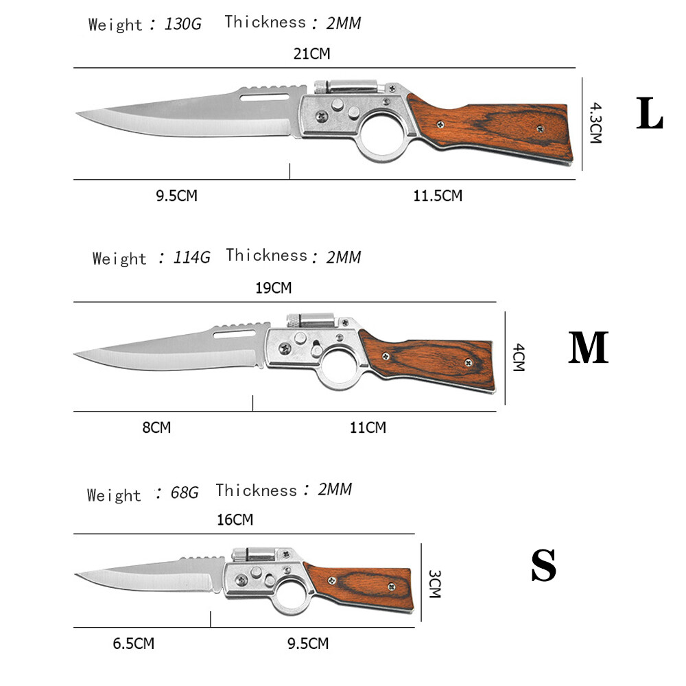 Description: The AK47 tactical folding knife is a versatile tool designed for outdoor enthusiasts and adventurers. Featuring a 9.8 cm stainless steel blade with a straight edge, this tactical knife is perfect for various tasks while camping or hiking. The wooden handle in a rich brown colour provides a comfortable grip for precision handling, making it a reliable companion for your next outdoor excursion. Ideal for camping, hiking, or general outdoor use, this AK47 knife is a must-have for any outdoor enthusiast. Features: 1. New Upgrade -- The newly upgraded bottle opener makes it easy to open refreshing beers and drinks, making your outdoor trip more enjoyable. It has also added serrations, which can provide good help in outdoor activities. 2. Led Lighting Design -- The LED lighting design on the top allows you to find your target even on dark nights, providing better help for camping, outdoor activities, exploring, fishing and more. 3. Dual Protection Mechanism -- The AK47 folding knife has two protective locks, one is to protect the opening and closing of the switch, slide up and down to control. The other is the lock with fixed blade, fixed blade does not close when in use, use finger inward push to control, double protection is safer to use. 4. Pocket Knife for Daily Use -- Pocket knife just 3.7/4.5/5.5 inches when folded and about 6.3/8.3/10.2 inches when opened, it weighs about 2.4/4.0/4.6oz, fast and smooth assisted opening with one hand, can be used for opening boxes, letters, envelopes, peeling fruits, self-defense. 5. Reversible Deep-carry Pocket Clip Knife -- It's not a small knife, but it carries very well, practically disappearing in the pocket, ideal folder for camping, hunting, hiking outdoor activities,everyday working carry or collection. Specifications: Model Name: AK47 Gun Shape Knife Special Feature: Folding, Led, Pocket Clip, Multifunctional Age Range (Description): Adult Handle Material: Wood, Carbon Steel Blade Material: Steel Recommended Uses For Product: Outdoor, Fishing, Camping, Hiking Item Length: 16/21/26 cm( 6.3/8.3/10.2 inch ) Package Content: 1X Knife Caution: Please don't put in dishwasher Please keep it away from children. Please don't keep the edge and point of knife aim to people. Please don't catch the knife by hand when the knife drop down. Acidic or alkaline substances cannot stay on the blade for a long period. Please clean and dry the knife after using, and place it to the dry place. The blade is very sharp, please don't use you finger to test the knife's sharpness.
