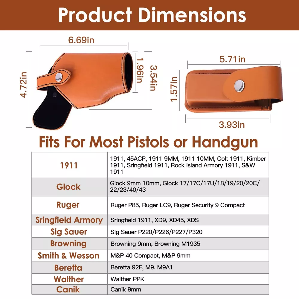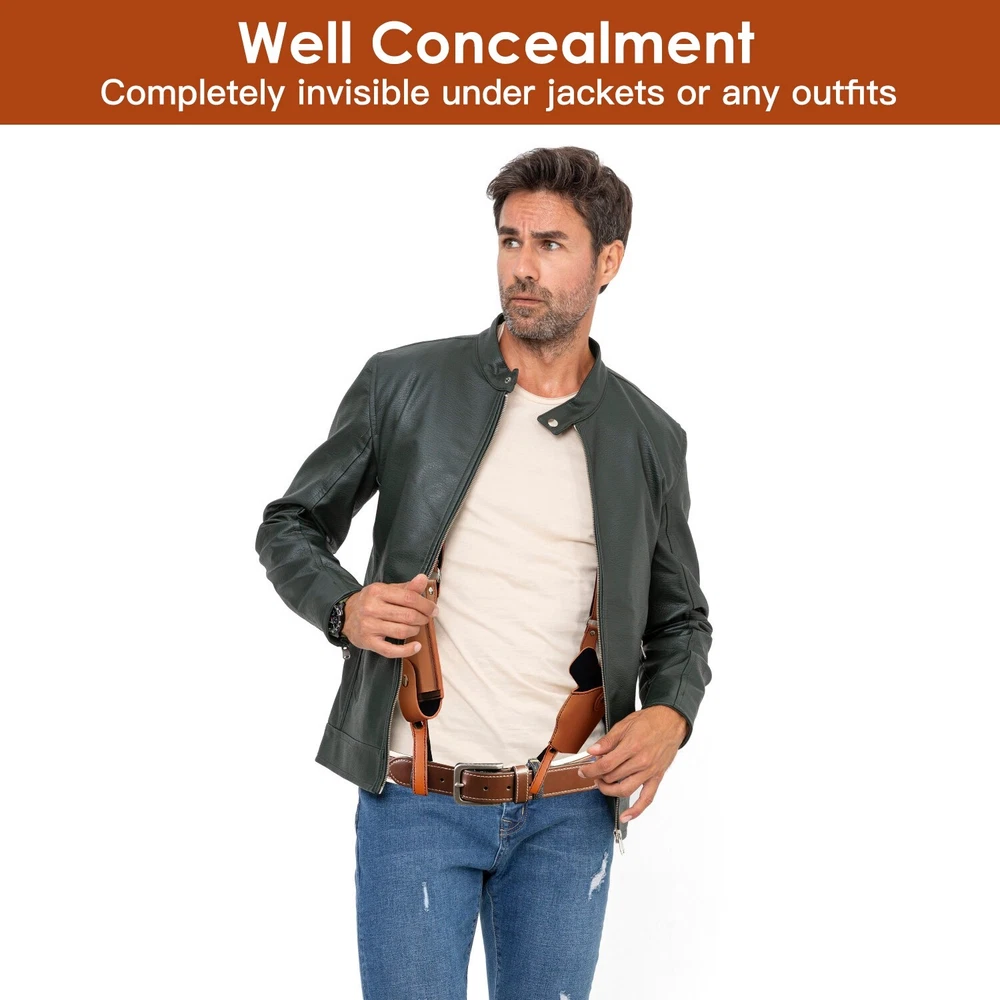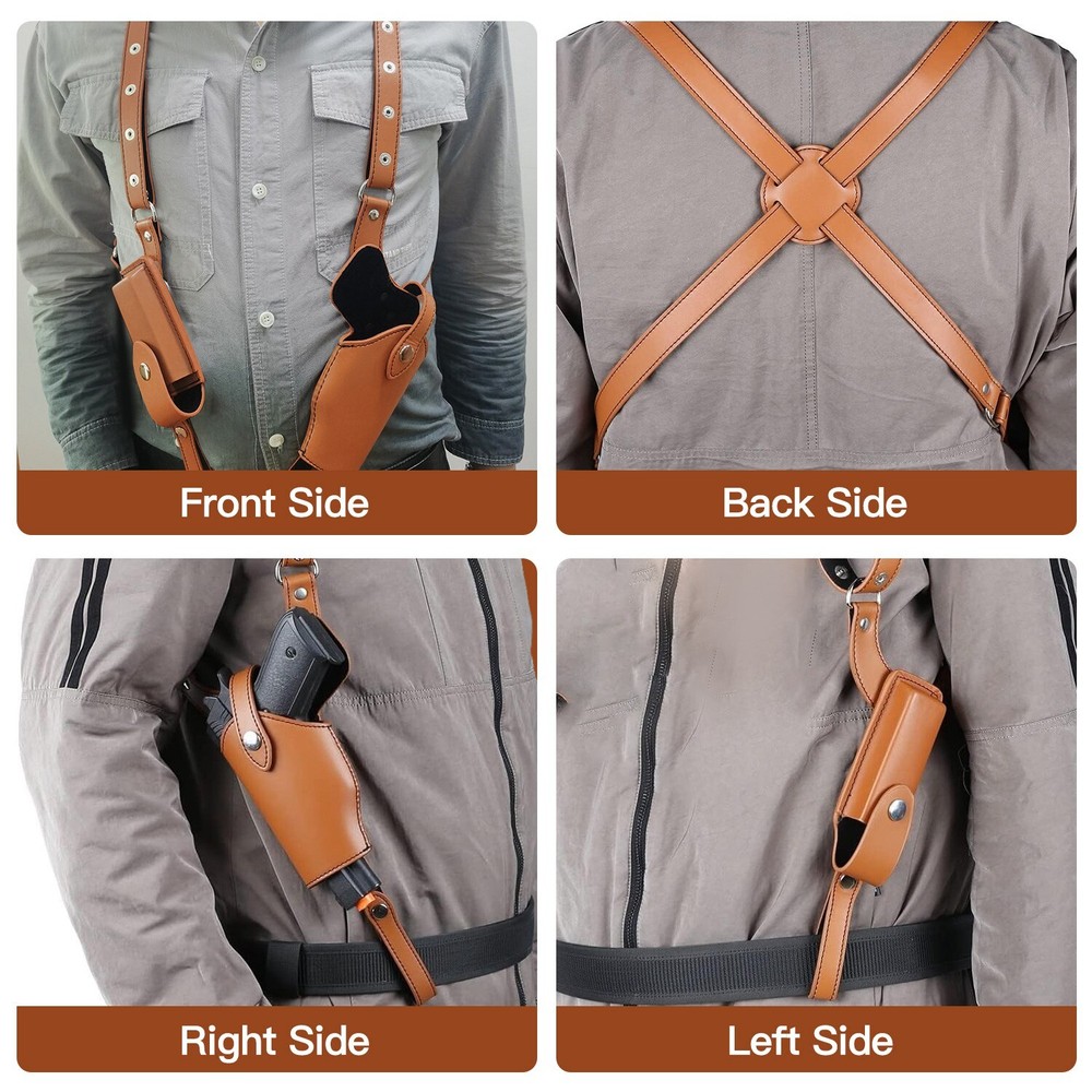 GOOD QUALITY Featured Item Product Detail Image Gallery Product Description Overview: Weighing only 0.55lbs, our shoulder holster provides a comfortable wearing experience without adding unnecessary burden. In addition, optimal concealment makes this shoulder holster seamlessly integrate into jackets or any other outfit. Simply adjust the straps through the cross-shaped adjusting buckle to fit your body perfectly. Crafted from premium leather, it won't easily fade, deform, or break, ensuring long-lasting use. Widely compatible with firearms such as Sig Sauer P320/P220/P226/P227, Glock 17/22/31, QSZ92/92G, M1911, and other similar-sized models. Features: Lightweight & Secure: Our shoulder holster only weighs for .55lbs,lightweight and velvet inner material provides you comfortable wearing experience,causing less burden on daily wearing. Reinforced sewing thread and enhanced fixed buckles ensure the security of your gun and magazine. Adjustable Straps: Flexible shoulder straps come with 5 adjustable lengths:35.03/33.85/32.67/31.49/30.31in,you can adjust the straps through the cross-shaped adjusting buckle to fit your body. Additionally,the buckles on the belt loop can firmly keep our shoulder holster in place even when running. Great Concealment: Different from those well-marked belly band which may add your waist line,our shoulder holster can seamlessly integrate into jacket or any outfit with remarkable concealment. You can still walk,jump and run as usual. Premium Leather Material: Made of premium leather material,durable,wear-resistant,won’t easily fade,deform or break. You can simply wipe the stains on the leather surface,making cleaning in a breeze. Wide Compatibility: Our shoulder holster is designed for right-handed users,fit for both man and woman. Widely compatible with Sig Sauer P320/P220/P226/P227,Glock 17/22/31,QSZ92/92G,M1911 and firearms of similar sizes. Specifications: Brand: iMounTEK Product Type: Shoulder Holster Material: PU Leather Color Option: Black; Brown Shoulder Strap Adjustable Length: 89cm/86cm/83cm/80cm/77cm; 35.03in/33.85in/32.67in/31.49in/30.31in Waist Tie-Down Belt Adjustable Length: 12.5cm/15.5cm; 4.92in/6.1in Item Length: 1.3m/51in Item Weight: 250g/0.55lbs Package Size: 22*16*8cm/8.66*6.29*3.14in Package Weight: 267g/0.58lbs Package Contents: 1x Shoulder Holster Terms & Conditions Thank you for your business !