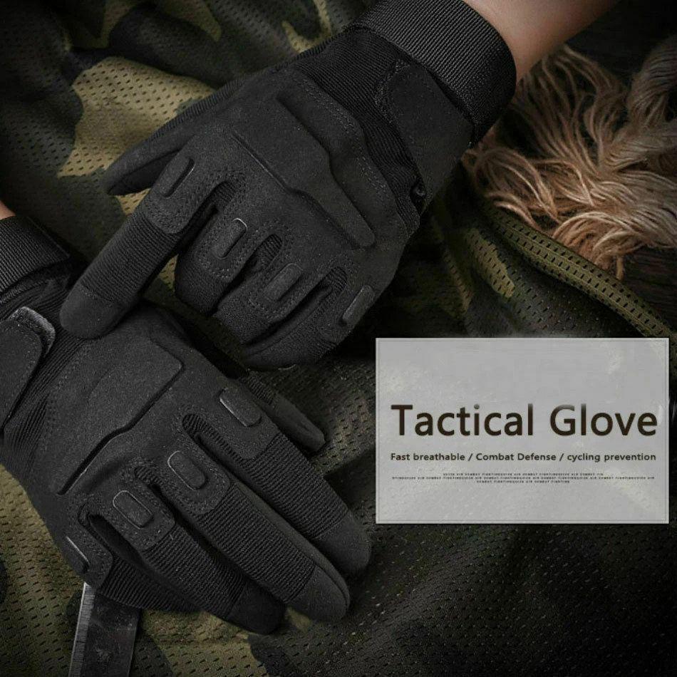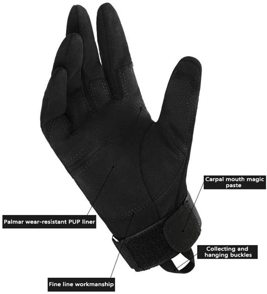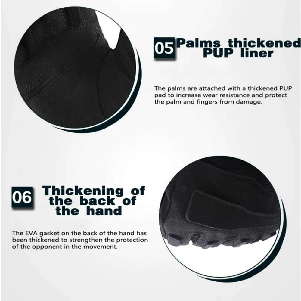 1. Ultimate Protection: The knuckle paddings effectively absorb direct impact, minimizing the injury caused by abrasion and scratching. PU padded palm reinforcement serves as an extra layer of protection, providing a sturdy grip for your motorcycle rides. 2. Snug Fit: Spandex material covers vital joint areas, allowing free hand movement without hindering the dexterity; Velcro wrist strap makes it easy to adjust and secure the glove. 3. Outstanding Breathability: Breathable lightweight spandex material makes this an ideal glove even in hot weather conditions. 4. Wear Resistant: Microfiber material can take on the roughest terrain. Capable of withstanding abrasion, accidental slippage. Ideal for combat situation. 5. Versatile Application: Its rugged build makes it ideal for most outdoor activities. Including survival, sports, motorcycling, climbing, shooting and many more. Specification: Made of a composite of windproof fabrics,excellent warmth retention. The palm is with skidproof design. Fleece lining, it is soft and comfortable. Sweat-absorbent quick dry towel. Suitable for skiing, cycling, travelling and other outdoor activities. Color: Black/ Army Green/ Khaki Size: M: Palm width 10-11.5 cm, middle finger to wrist length 18-19 cm L: Palm width 11.5-12.5cm, middle finger to wrist length 19-20cm XL: Palm width 12.5-14cm, middle finger to wrist length 20-21cm Package Include: 1 Pair Full Finger Gloves