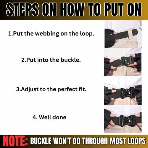 Tactical Military Belt for Men Riggers Work Belt Hiking Web with Heavy Duty Quick Release Metal Buckle Size: Belt Width: 3.8cm / 1.5in Belt Length: 125cm / 49in in this tactical style belt comfortably fits up to a 42” waist Tactical / Work Belt - Stay on Pants - Please Note Buckle wont go trough most loops, see attached picture Easy to Use - Our Tactical Belt Featured with Heavy Duty Quick Release Metal Buckle Best Gift Idea - Belt for Work,Rigger, Hiking, Fishing and more Heavy Duty Military Belt - made of nylon & metal buckle