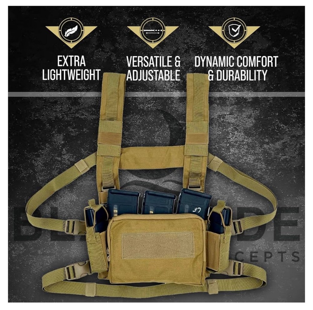 BLACK TIDE CONCEPTS Tactical Chest Rig Forged for the indomitable & crafted to match the unwavering strength of those who rely on them, our tactical chest rigs are designed to excel in field duty, training, and extreme outdoor challenges. Designed by a Navy SEAL, our chest rig is SPECIAL OPS APPROVED. STAY MISSION READY WITH AMPLE STORAGE The BLACK TIDE CONCEPTS chest rig is the perfect solution for storing, carrying, and accessing essential tactical and adventure gear, featuring: LARGE MAIN ADMIN & DUAL SIDE POCKETS Featuring ample storage space and a sturdy zipper closure, the main admin pocket is perfect for storing maps, snacks, and a variety of other gear from tactical gear, to hunting and fishing tools, to airsoft and paintball accessories. Store your flashlight, or another small tool in the dual side pockets. Carry everything you need in a lightweight, breathable front chest pack with a streamlined design that minimizes weight and maximizes mobility. MAGAZINE POUCH Located behind the admin pocket, the magazine holder pouch acts as a chest holster by securing your magazines while allowing quick and easy access to your ammunition. MODULAR DESIGN Fully customize the setup of this minimalist chest rig with the versatile MOLLE hook & loop system. Easily attach pouches, holsters, and other accessories for your specific needs. Whether you're using this as a military, hunting, fishing, paintball, or airsoft, chest pack, BLACK TIDE CONCEPTS is the perfect work or adventure companion. BB4 Features & details The fabric in this Chest Rig is high-quality 1050D Cordura nylon, known for its strength and durability. It withstands tactical demands, providing reliable protection. Tear-resistant and water-repellent, it keeps you comfortable in challenging conditions. UV-resistant, it maintains its color over time. This fabric ensures your Chest Rig is reliable and ready for intense use in the field. Imported SPECIAL OPS APPROVED Stay mission ready with tactical gear from BLACK TIDE CONCEPTS. Designed by a Navy Seal Veteran, this durable chest rig is built to last. Add to cart with confidence in our LIFETIME WARRANTY and 100% CUSTOMER SATISFACTION GUARANTEE. STAY MISSION READY Main magazine pouch of this chest holster securely holds 3 magazines, ensuring quick & easy access to your ammunition. VERSATILE STORAGE Spacious main chest rig pocket is perfect for maps, snacks, and other tactical accessories. Conveniently store flashlights and other accessories in dual side pouches. CUSTOMIZABLE CONFIGURATION Modular MOLLE system allows you to customize the setup of your chest rig according to your specific needs. Easily attach or detach pouches, holsters, or other accessories to adapt the rig to different missions, loadouts, or scenarios. Integrates seamlessly with the BTC Tactical Vest for a comprehensive system. DYNAMIC COMFORT & DURABILITY Carefully crafted from heavy-duty 1050D nylon, this chest rig withstands the most demanding conditions for long-lasting performance for military, hunting, fishing, or paintball/airsoft use. H-strap harness distributes the weight evenly across your torso, reducing strain and fatigue and ensuring comfort during extended wear and is fully adjustable for a custom fit.