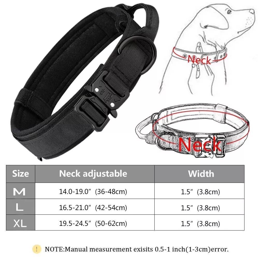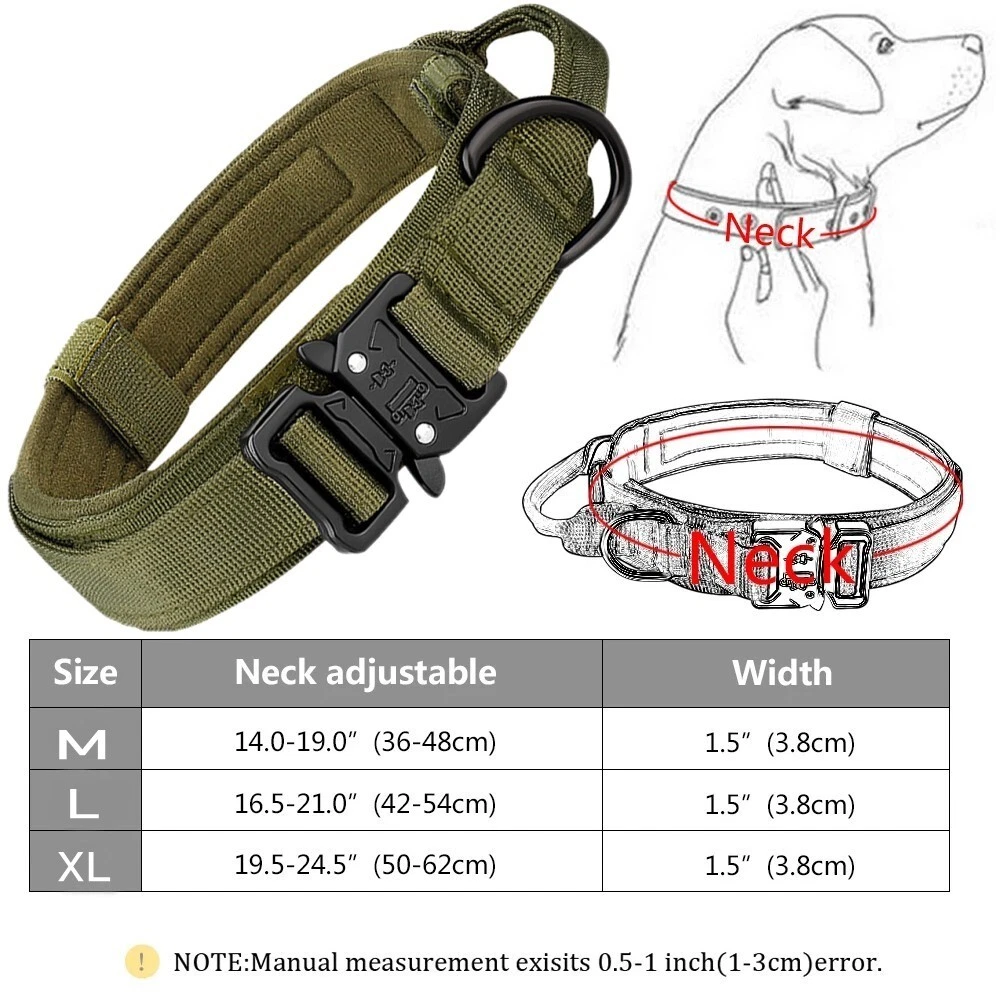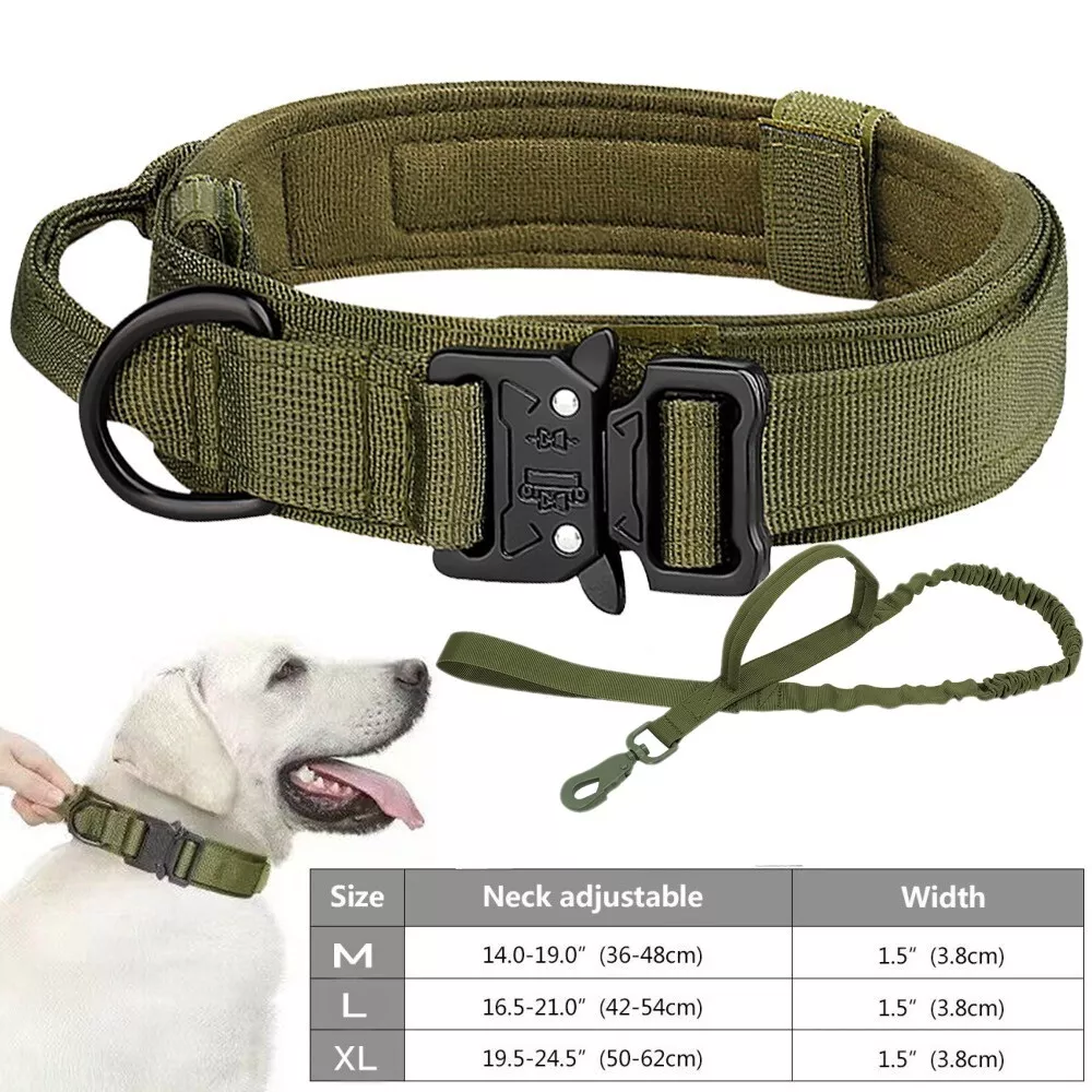 Meinuousa Your Best Online Business Partner Tactical Dog Collar w/ Handle +Leash Heavy Duty Military Service Canine Training Feature: Made of high-quality nylon material and metal clasp, strong and durable, light weight, easy to carry. A power D-shaped ring with a handle that can be attached to a belt to securely strap your dog and make your pets more easily controlled in difficult situations. Adjustable belt and quick release buckle, suitable for all pets, also very suitable for outdoor sports, training, travel, camping and hunting. Soft padded lining.While this collar is strong, the padding liner is comfortable. This enables your dog to train, work or explore all day without being distracted by this collar. Controllable Thickened Handle.Control the dog's movements to ensure safety at close range . Thick material, very durable and comfortable Specification: Product Name: Tactical Dog Collar Color: Green/Black/Khaki Material: Nylon Applicable objects: General purpose Uses: outdoor training Width: 3.8cm/1.5inch Size: XL 54-62cm/21-24inch /32.5kg-50kg L 48-54cm/19-21inch/22.5kg-32.5kg M 37-45cm/14-19inch/15kg-22.5kg Package includes: 1x Tactical Dog Collar 1x Leash (Depends on your choice) The tactical dog collar is suitable for large and medium dogs. It can be used for training German shepherd, Doberman, Golden Retriever, Labrador, Bulldog, Husky, etc. The collar can also apply to outdoor sports, such as camping, hunting, patrol, and travel. It can easily make your dog under control whether in training or leisure time. Payment Shipping Returns Contact Us About US - We accept the payment through :Credit, debit, and gift cards, Apple Pay, Google Pay, PayPal, and PayPal Credit. - Payment must be fulfilled within 4 days after the end of auction. - Please make sure your ebay address is correct. Or not, please correct it before payment. - If you are a big customer, Please contact with us about the item's PRICE and SHIPPING. - Your feedback & suggestion is deeply appreciated, thanks. 1. Please make sure your address in ebay is correct. 2. We will only follow your address listed in the ebay orders for the shipment. 1. We can exchange the item within 30 days after you received it if it is defective. 2. Returned item must have all original packaging and accessories. 3. Buyer are responsible for the returning shipping costs. 1. We greatly appreciate your POSITIVE feedback. 2. Negative or Neutral feedback does not resolve any underlying issues that you may be experiencing as a buyer. 3. Any question or unsatisfaction please contact us with ebay message, we will sincerely solve for you. Feedback is very important to us, if you are satisfied with us, please leave us 5 star positive feedback to us. If you h have any problem, please contact us first BEFORE you give us neutral or negative feedback, so we can try our best to help you solve your problem. All rights reserved.