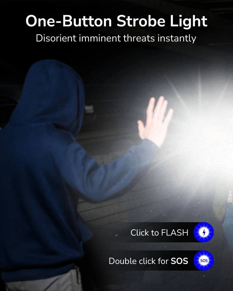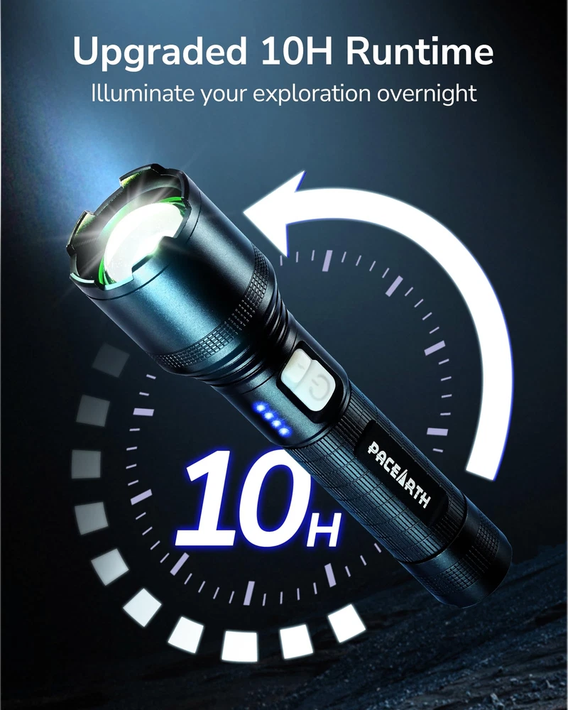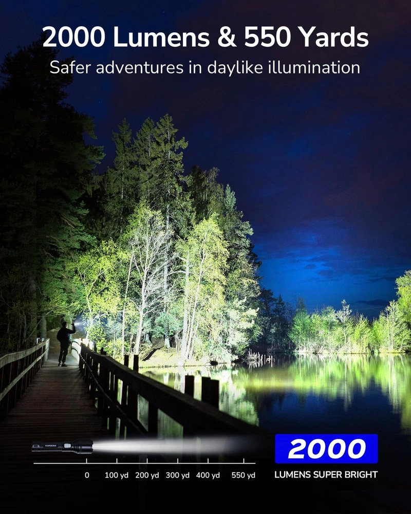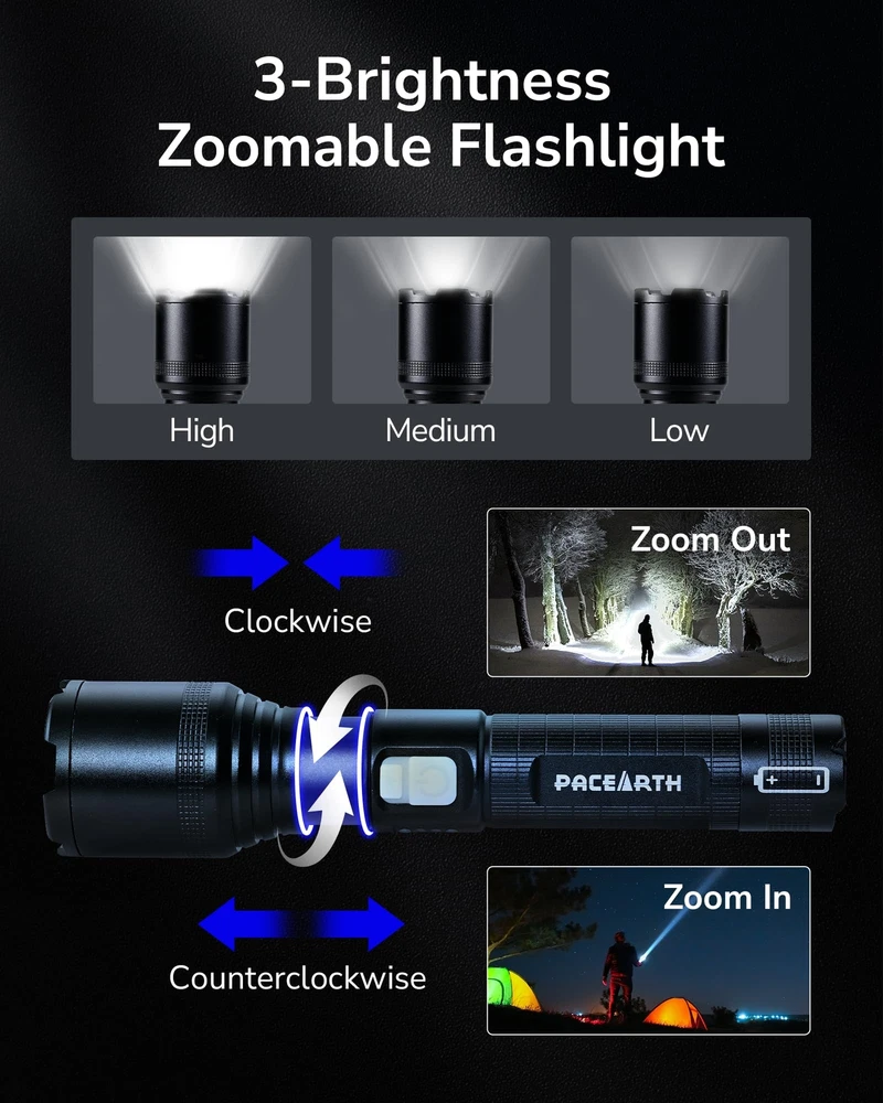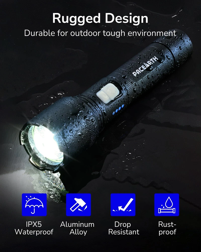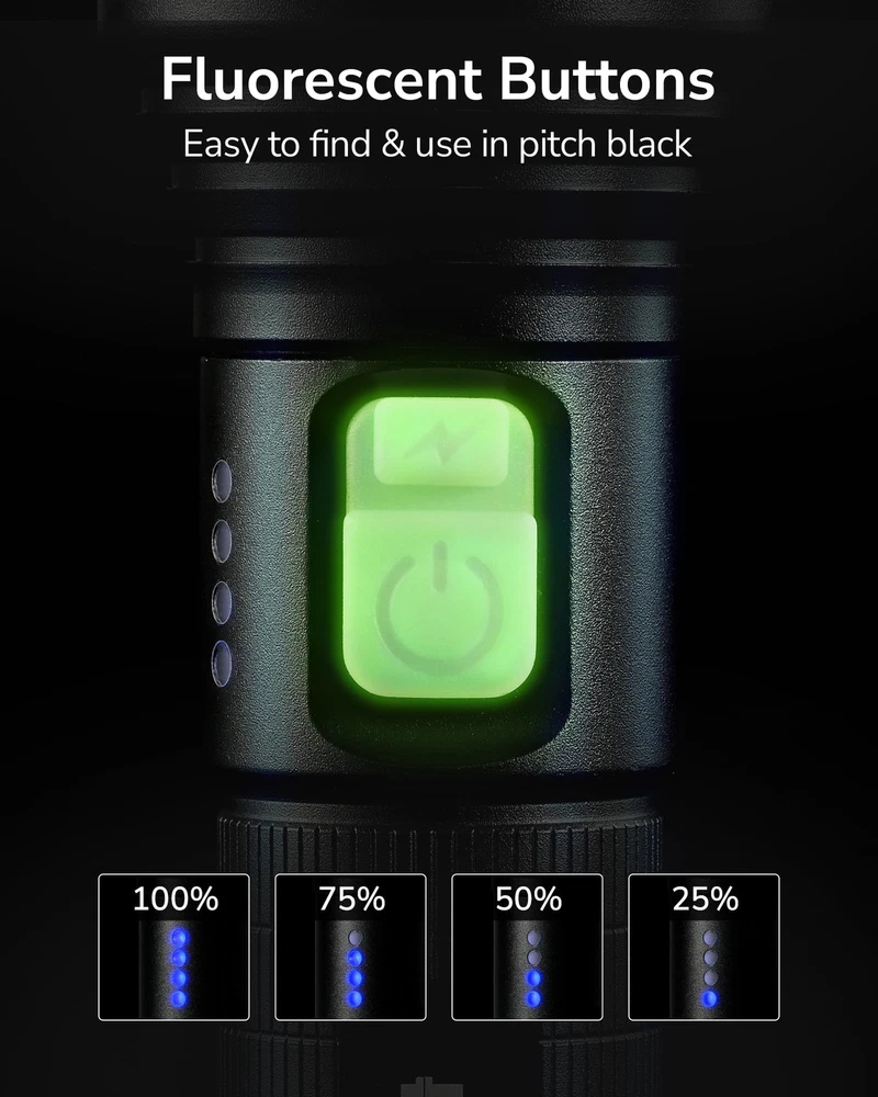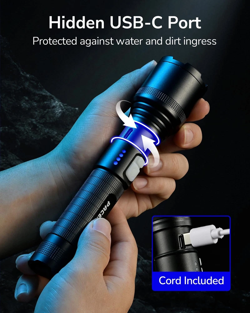 【INSTANT STROBE LIGHT & FLUORESCENT BUTTONS】: rechargeable flashlights features a separate button for strobe light and SOS functions, allowing you to instantly repel imminent threats with just one click or signal for help with two clicks. Unlike other led flashlight on the market, this tactical flashlight bursts out sudden strobe light without cycling through all functions of the only button. The buttons are fluorescent, so you can easily locate them to find the flashlight in darkness. 【LED FLASHLIGHTS HIGH LUMENS & LONG RUNNING TIME】:brightest flashlight are equipped with a super bright LED chip, producing up to 2000 lumens of high brightness into 1650ft distance. With a super bright flashlight at hand, your nighttime outdoor activities are now as safe as in daytime. This high powered flashlight can power up to 10 hours of continuous use, so your exploration won’t run out of power and need recharging frequently. 【HIDDEN TYPE-C PORT & POWER DISPLAY】: Twisting the rechargeable flashlights counterclockwise, a hidden Type-C charging port is exposed for fully recharging the super bright flashlight with the included USB-C cable in 2.5 hours. The hidden design protects the charging port from being damaged by water or dirt ingress, enhancing its longevity. Four indicators on this super bright flashlight clearly tell the remaining camping flashlight levels (100%, 75%, 50%, 25%) so you know when to recharge it. 【5 MODE FLASH LIGHT & ZOOMABLE】: tactical flashlight has 3 flashlight options (High, Medium, Low) and 2 tactical light options (Strobe, SOS ). You can choose the appropriate lighting according to your needs from the two buttons respectively. All five lighting options are zoomable for wider area floodlight or intensive far-reaching spotlight by twisting the head of the brightest flashlight. 【IPX5 WATERPROOF & DURABLE】: Designed for indoor & outdoor use, the high lumens camping flashlight is IPX5 waterproof and shock resistant. This waterproof flashlight can be used in extreme weather conditions such as storms and snowstorms. The powerful flashlight is made of high-quality aviation aluminum alloy, with non-slip grooves on the handle and a lanyard for comfortable and convenient carrying. Led flashlight with high lumens can be used for emergencies, camping, gifting, and so on.