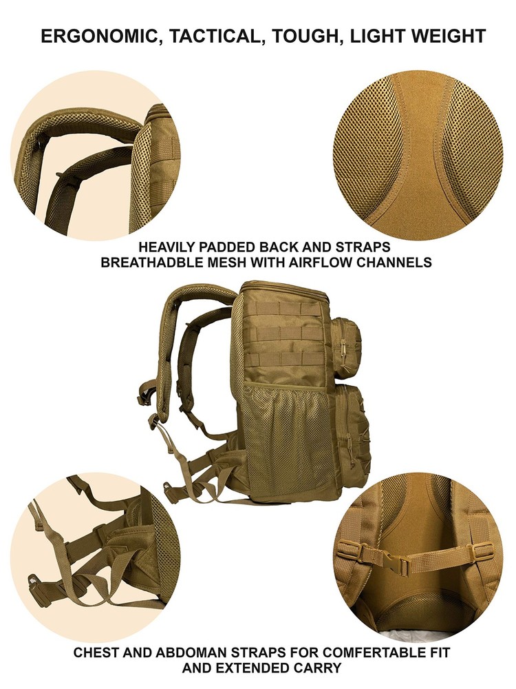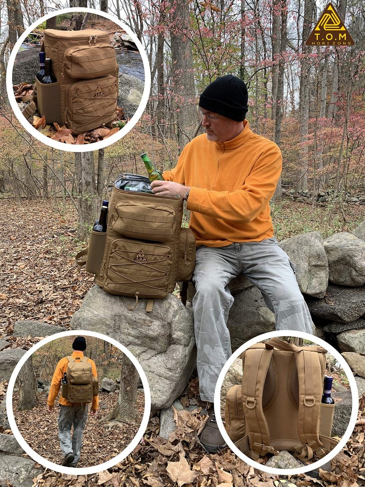 **UPDATED 6/2020 - REINFORCED STITCHING** Why get this cooler backpack? If you are looking for a heavy duty, extra-large, tactical cooler backpack, which will keep food cold or warm for up to 18 hours , hold enough food and drinks to feed a group for a whole day, and be comfortable to carry for a long time, look no further! Designed by a veteran army officer with functionality, durability, and comfort in mind Features and specifications Main compartment is fully insulated, infused by heat to stay watertight (melting ice will not leak). Holds food containers, drinks, ice packs, sandwiches and more in an extra large insulated compartment. The compartment is large enough to hold up to 35 soda cans including ice! 3 large additional closed pockets to hold plates, cups, silverware, condiments and anything you need to serve a full meal on the go and beyond. Mesh pocket which fits 2 full size wine bottles 2 straps below the backpack can hold such items as a rolled blanket, mat, tripod etc. Heavy duty, wide padded straps with abdominal and chest cross straps for extra comfort and fit while walking long distances. Heavy Padding on straps and back is made out of breathable material with air channels to reduce sweating Zipper extenders to easily handle with gloves during cold temperatures Front and side Molle PALS (pouch attachment ladder system), allow connection of attachments you already own such as pouches, knives, first aid kits, buckles, utilities etc. Bonus: credit card multi tool with up to 46 different uses. Will assist with tasks during your hike and meal prep (open, bottles, cans, boxes). Also great to keep in your wallet whenever you need a sleek multi tool and don't want to carry a full size tool Satisfaction guaranteed. One year buyback warranty. Love it or we will buy it back from you! HEAVY DUTY EXTRA LARGE COOLER BACKPACK: Keep food and drinks cold or warm for up to 18 hours in the main insulated compartment. Includes additional 4 large compartments for all other necessities. Main compartment’s volume is 33 Liter and can hold up to 35 soda cans including ice. Backpack can comfortably hold up to 40 lbs of items LEAKPROOF: Insulated and fused main compartment with a watertight seal that will not leak. Additional compartments and exterior are made of a waterproof, heavy duty material. Backpack is easy to clean ERGONOMIC, TACTICAL, TOUGH and LIGHTWEIGHT: Specifically made for long hikes and outings. Includes breathable, heavily padded mesh back pads, reinforced padded straps with chest and abdomen securing straps. This design keeps the cooler backpack comfortably in place even after many hours of walking. A molle system is included for any supported attachments. A pair of straps under the backpack allow for attaching blankets, mats, extra shoes, etc. SIZE: Main cooler compartment is 18x8x14inches. Other compartments sizes are 11x9.5x2.5 11x5x2.5 and 10x5x2.5 inches. Mesh pocket can hold 2 full size wine bottles BONUS CREDIT CARD MULTI TOOL: included with each cooler backpack. Up to 46 tools in one including screwdrivers, wrenches, knife, bottle opener, can opener, box opener and more