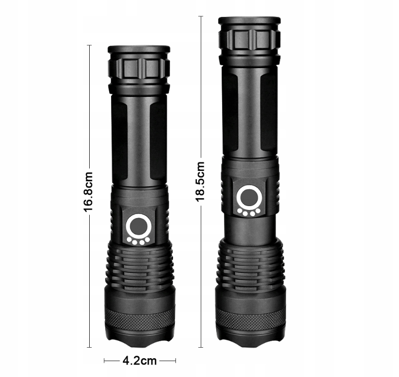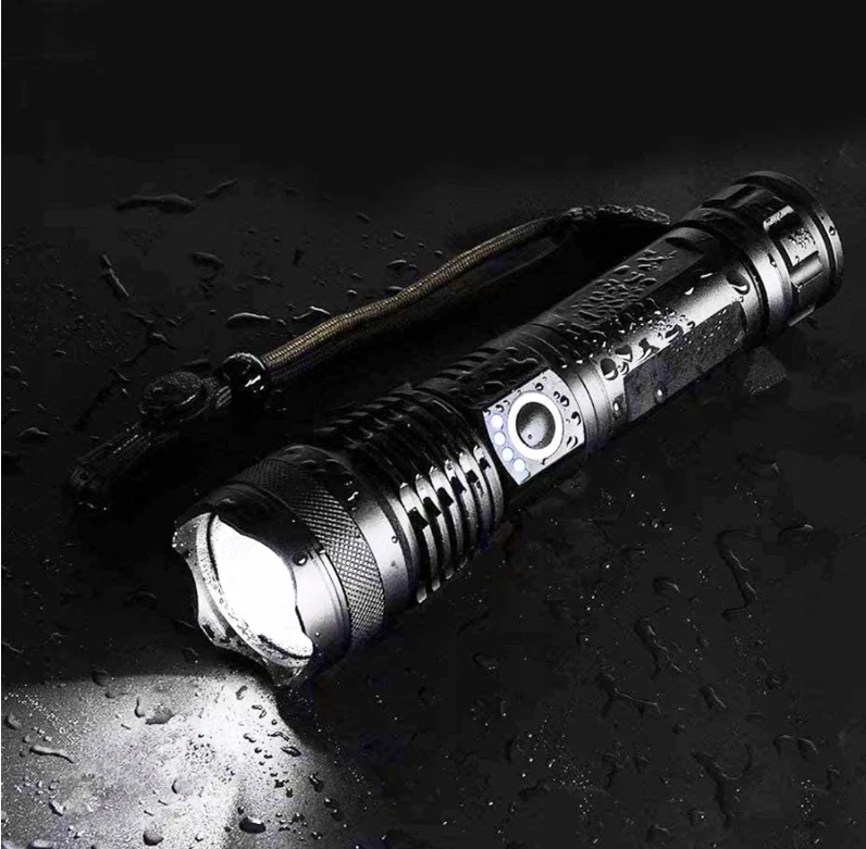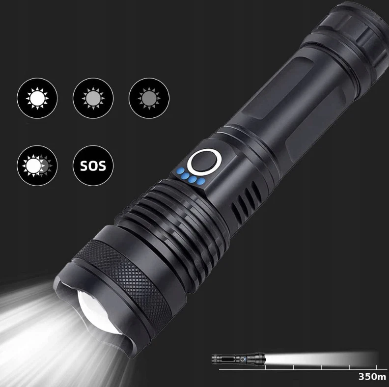 POWERFUL TACTICAL LED LAMP XHP50 -ZOOM SPECIFICATION: ☝️ Waterproof – thanks to its resistance to moisture and rain, the flashlight will work in all weather conditions. ☝️ Zoom function – the ability to adjust the light flow allows you to precisely illuminate both close and distant objects. ☝️ Charge level indicator – intuitive indicator informs about the battery status, helping to avoid unexpected discharge. ☝️ Cordless or battery-powered – gives you flexible power supply, adapting to your needs. ☝️ 5000lm luminous flux – strong, high-brightness light is ideal for demanding tasks. ☝️ Micro USB – enables quick and convenient charging. ☝️Suitcase – a practical suitcase makes it easy to transport and store the flashlight and accessories. ☝️5 lighting modes – various light settings allow you to adjust the intensity and effect to the situation. ☝️Power 10W – high efficiency guarantees bright and energy-saving lighting. ☝️Range 1500M – impressive range allows effective lighting of large spaces. RECHARGEABLE OR BATTERY POWERED The flashlight is equipped with a rechargeable battery and a basket for three AAA batteries. This allows you to use the included USB cable to charge the battery with a regular USB phone charger, or use the flashlight on batteries when traveling when you don't have access to a power outlet.
