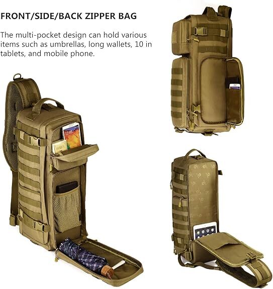 out this item ✅ MATERIAL -- Made A+ Grade durable nylon ripstop fabric; scratch-resistant, water-repellent, not easy to fade after long-term use, which wear-resistance is higher 10 times than conventional polyester fabric tension ✅ OUTSTANDING STRUCTURE -- 20" W x 8.2" H x 7.4" D. The tactical sling pack designed has multiple pockets for storing different stuffs. The 2 front for frequently-used items, and right side zip pocket and left side open pouch can fits things easy take them in and out; The large compartment can fits up to 20 shirts; The hidden back zip pocket for valuable items; Multi-layer storage compartments can accommodate a lot of EDC equipments ✅ MOLLE MODULAR DESIGN -- Molle webbing system on front and both sides, designed to be used in combination with other equipments, you can attaching extra pouches or gears; such as kettle pouch, walkie-talkie pouch, first-aid pouch, torch pouch and so on ✅ INTIMATE DESIGN -- Backpack has hydration system that works great for a up to 3L hydration bladder (Not included) as hydration pack; Hook-and-loop for attaching personality tags according to your own liking; The pack can be carried on both shoulders; This tactical sling bag double stitched, padded shoulder straps and back area with mesh backing for comfort, ventilation, and strength during travel. With high-quality zipper. Easy adjustable waist & chest straps ✅ WIDE APPLICATION -- 3 Carrying options (shoulder bag, chest / back sling bag, hand carry bag). Well-organized items placement serve you in different usage scenarios from everyday use, stroll, camping, hiking, to trip and travel