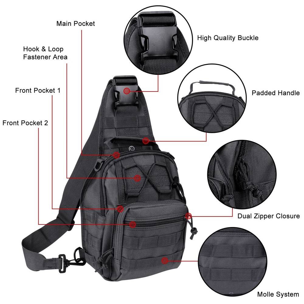 Fashion Design: The tactical backpack has compact appearance, conform to the tactical trends, easy to carry. Multiple Storage Function: The main inter pocket with three auxiliary pockets'design, the sling shoulder bag for men is easy for categorizing and storing and keep your items in order. High Quality Fabric: The sling bag for men is nylon fabric, wear-resistant and anti-tearing, waterproof, long use time, saving cost of living. Versatility: The Oxford cloth bag is suitable for outdoor cycling, leisure, office and short distance travel, can be loaded with iPad, mini radios, smart phones, wallets and other daily necessities Carefree Experience: Try the military backpack, Quality assurances with 12 months. If not satisfied with the small backpack, support return, replace or .