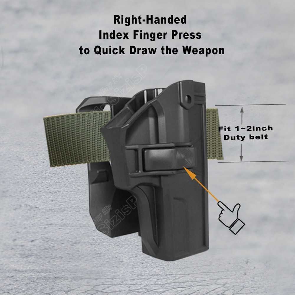 High Quality Military & Police Grade Polymer OWB Holster Specially Designed For Fast Draw During Duty Or Shooting Competition. Item Description: Outside the Waistband Duty Holster with Paddle attachment Holster fit S ig Sauer SP2022 Full-Size 9mm Luger Sig Sauer SP2022 SAR Sport Full-Size 9mm Luger Sig Sauer SP2022 Full-Size .40 S&W Sig Sauer SP2022 Full-Size .357 SIG ( I t can not fit the gun with Optic Mount Mini Sight , laser , embedded chassis, or flashlight style ) Ease and Comfort Push side buttons to achieve the fast opening and closing, unique design allows for belt carrying or vest carrying, perfectly used by duty holsters, uniformed law enforcement officers, security personnel, military personnel, private persons, and shooting sports holsters. And it fits closer to the body which can achieve better concealment under clothes. High S afety Secure Level II Retention - Auto-locking system restrain pistol in the holster to ensure ultimate safety, activate the release by pressing the button with the index finger to achieve gun access . A djustable Easily set Holster 360 degrees to your desire position with Allen key, compatible belt width up to 2 inch . Tough & Durable Material Custom-molded body made of polymer stronger than leather that will wear out, adapt to every bad environment In the Package: · 1*Holster with Paddle Attachment · 1*Allen Key Shipping: Ships same day or next except Sundays and Holidays ! Free shipping! Ship by USPS First Class Package. 100% MONEY BACK GUARANTEE. Any question please be free to contact with us .Thanks!