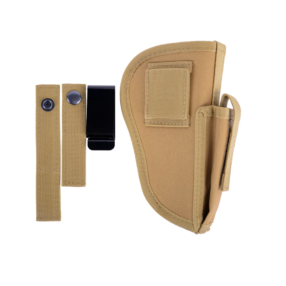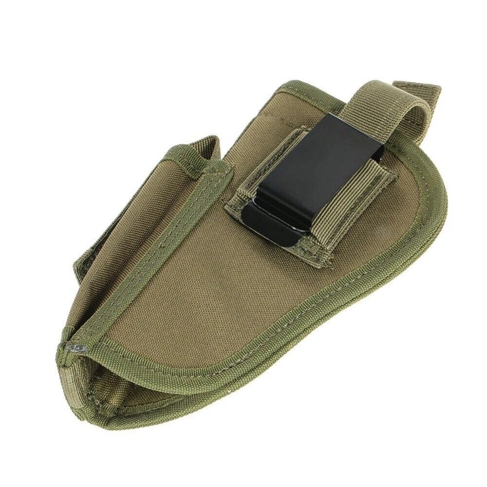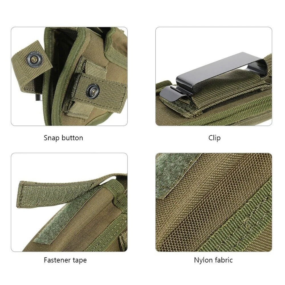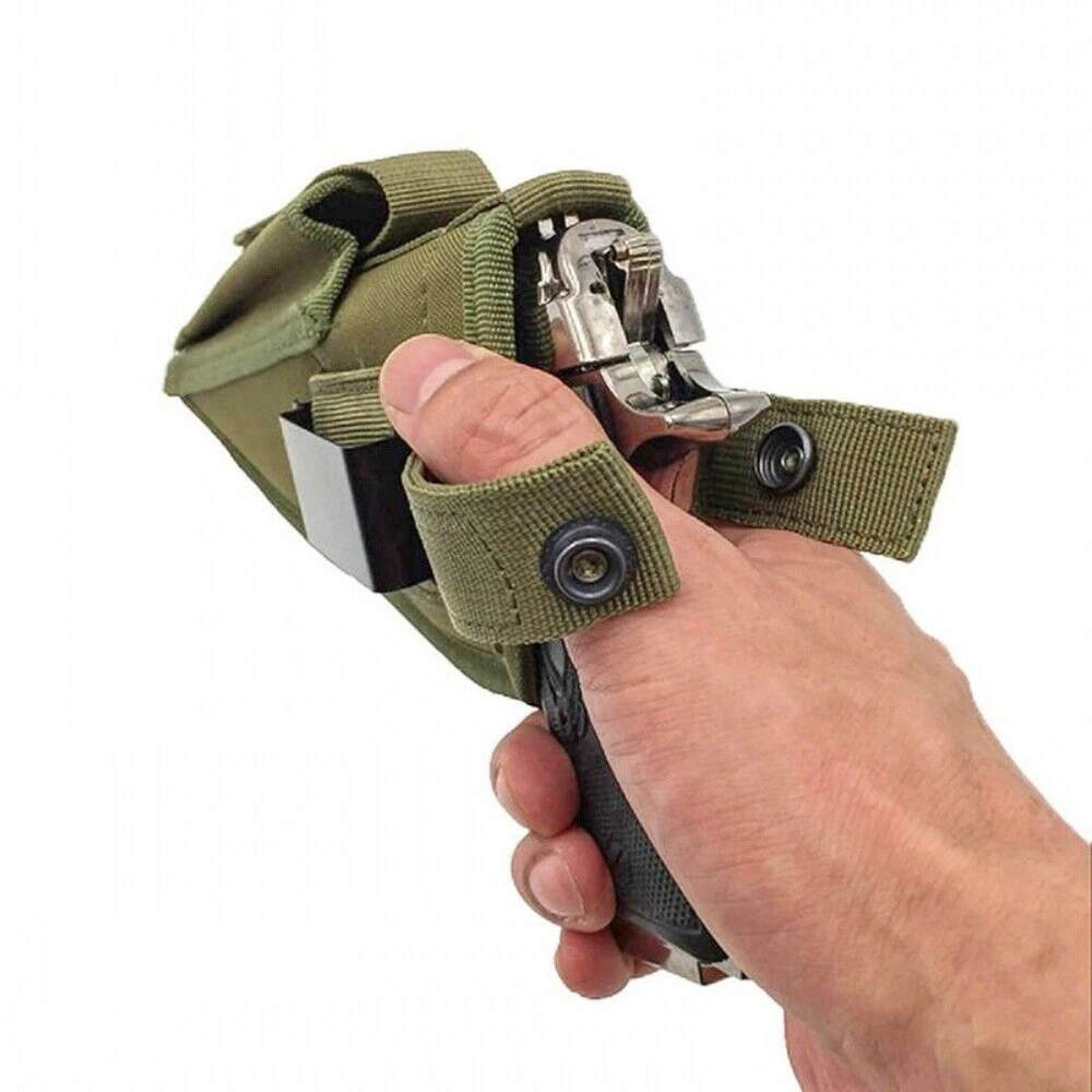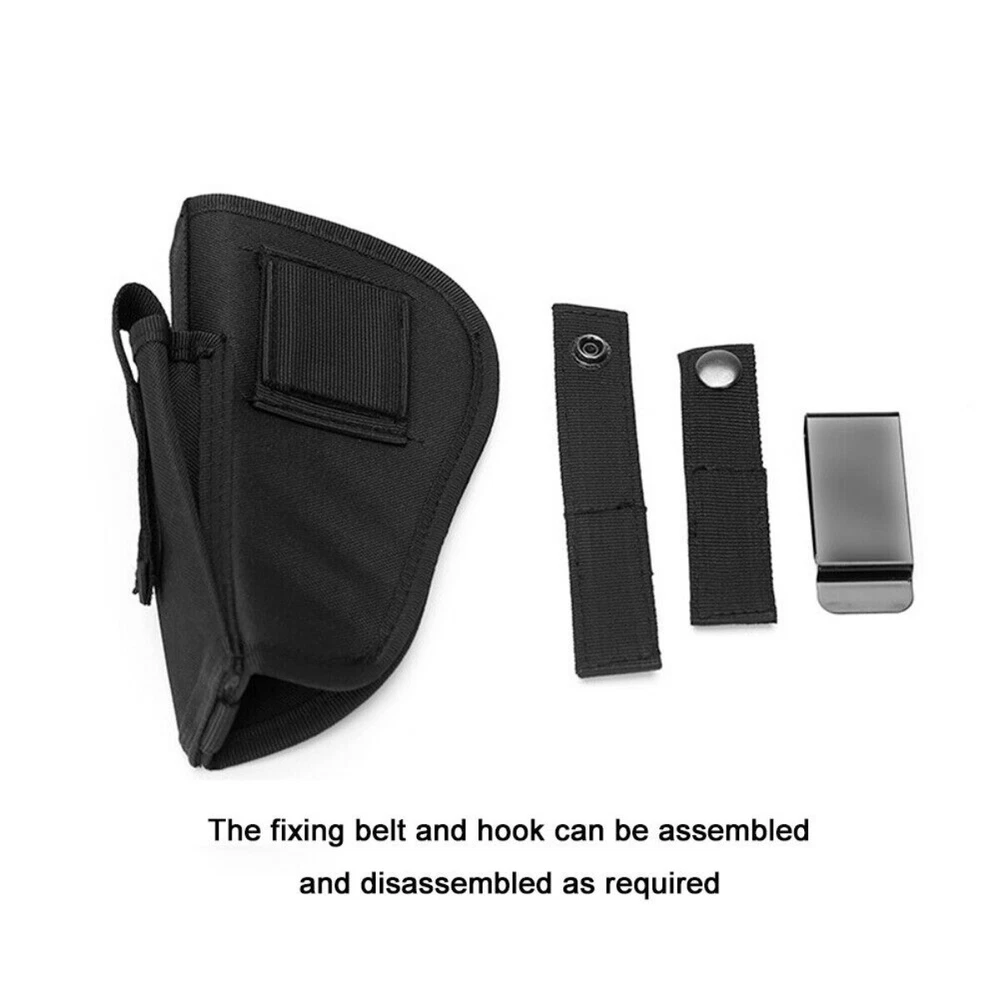 Product Description: Concealed Waist Gun Holder Lightweight Compact Double-Ended Pistol Handgun Pouch Modular Universal Holster Features: 1. Hidden universal holster. 2. It is exquisite, lightweight, durability and portability. 3. It can adjustable, suitable for left or right hand free replacement. 4. It is equipped with safety buckle, fixing belt and a metal clip, which can also be assembled and disassembled as required. 5. The holster can be attached on your waist belt and fasten to your leg. Specifications: 1. Material: Nylon 2. Colors: Black, Khaki, Army Green 3. Size: 20*10.5cm 4. Weight: about 127g Package Included: 1x Universal Concealed Carry Holster Note: 1. All pictures are professionally color-coded, but due to the difference of ambient light and display equipment settings, there may be some deviation between the pictures you see and the objects themselves, please understand. 2. The data is measured manually, and there may be some deviation, but it does not affect the use.