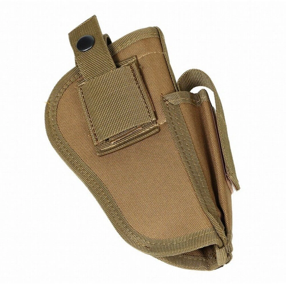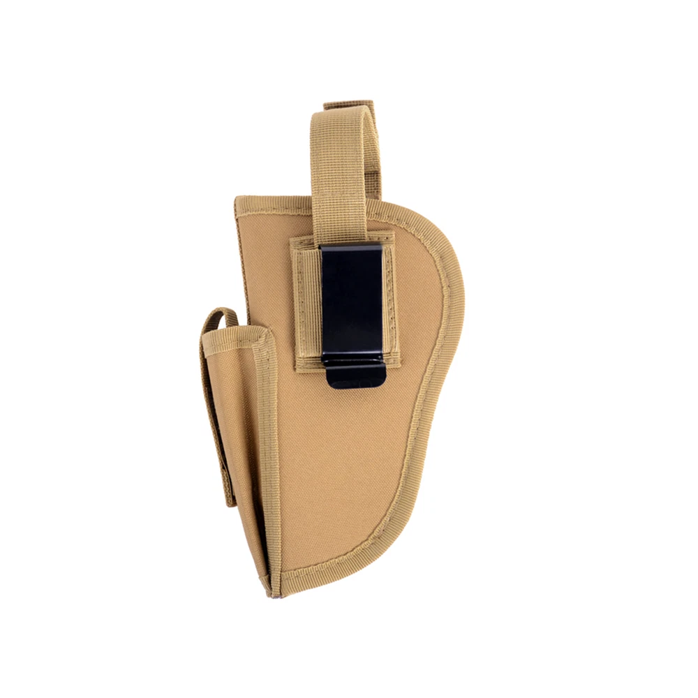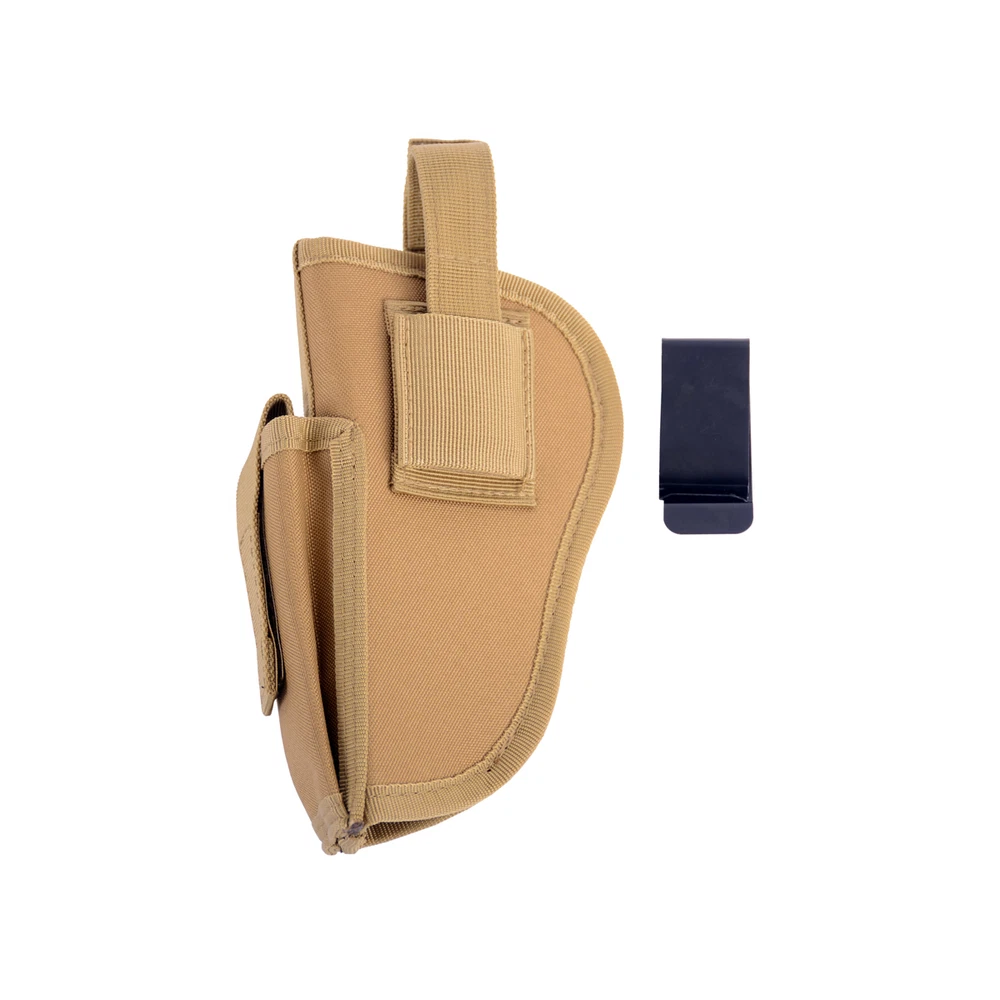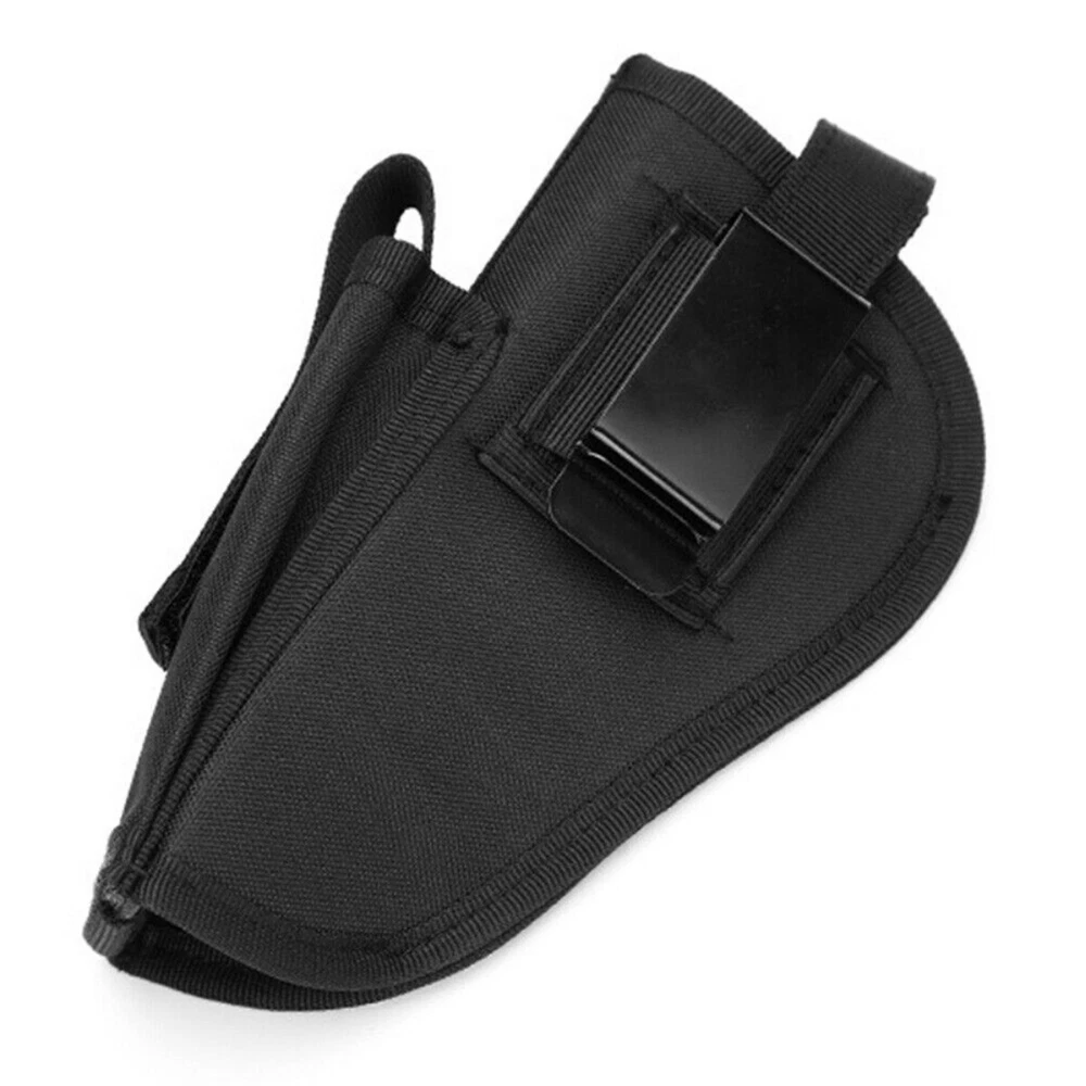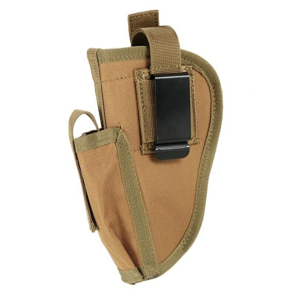 Product Description: Concealed Waist Gun Holder Lightweight Compact Double-Ended Pistol Handgun Pouch Modular Universal Holster Features: 1. Hidden universal holster. 2. It is exquisite, lightweight, durability and portability. 3. It can adjustable, suitable for left or right hand free replacement. 4. It is equipped with safety buckle, fixing belt and a metal clip, which can also be assembled and disassembled as required. 5. The holster can be attached on your waist belt and fasten to your leg. Specifications: 1. Material: Nylon 2. Colors: Black, Khaki, Army Green 3. Size: 20*10.5cm 4. Weight: about 127g Package Included: 1x Universal Concealed Carry Holster Note: 1. All pictures are professionally color-coded, but due to the difference of ambient light and display equipment settings, there may be some deviation between the pictures you see and the objects themselves, please understand. 2. The data is measured manually, and there may be some deviation, but it does not affect the use.