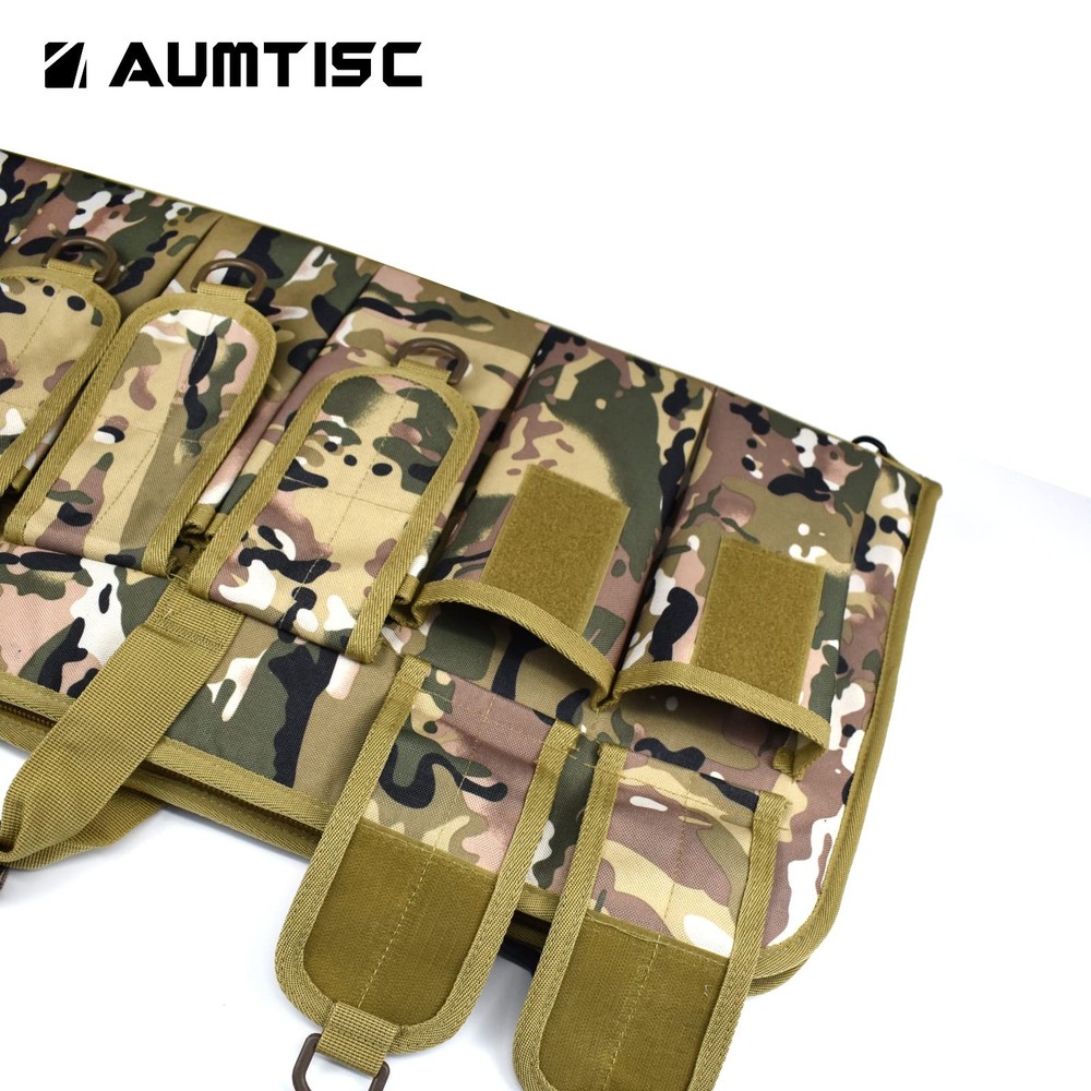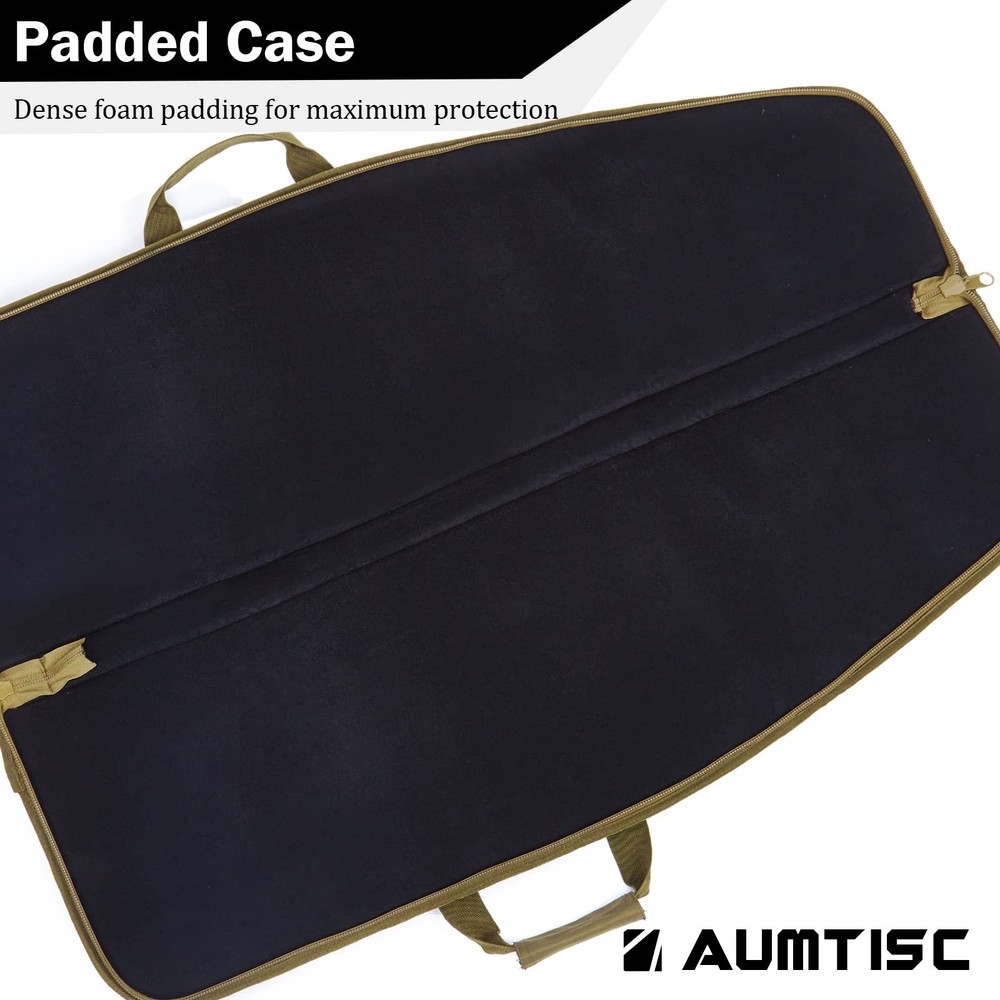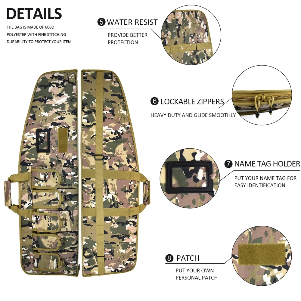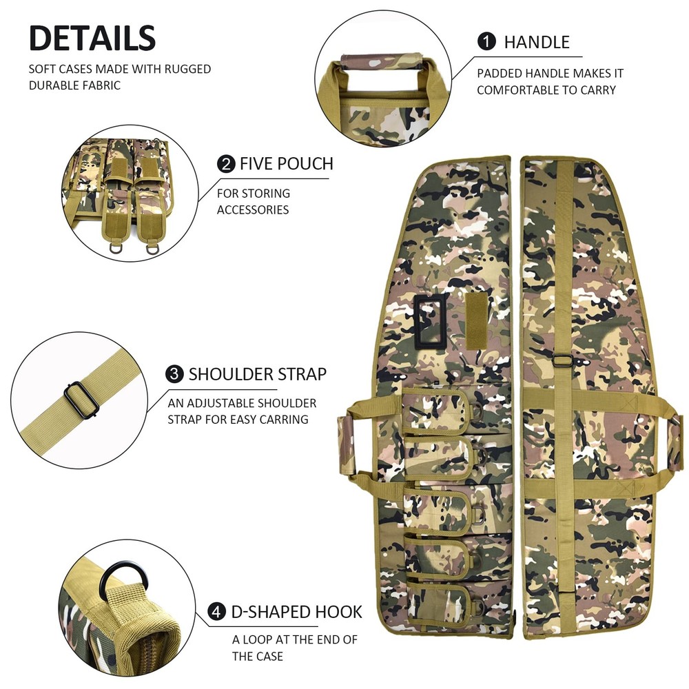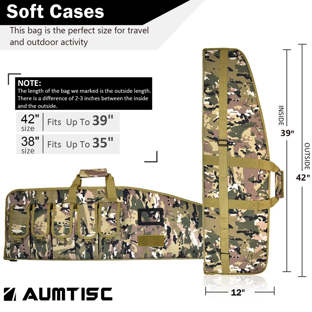 bag is available in two sizes: Medium case is 38"x12" outside; Large case is 42" x 12" outside. The bag with 5 pouches and adjustble shoulder sling. Case is made of 600D tough material. I believe that we will be satisfied with this bag. We are a professional OEM outdoor bag factory. Our quality is guaranteed. LARGE SIZE: Size of shot gun case--42" can Fits Item Up To 39" PADDED SOFT GUN BAG: Double zippers which can easy to slide the zippers strong and sturdy (Luggage lock NOT INCLUDED) POLYESTER: Heavy duty 600D polyester which have 5 pouches, D-Ring for hanging TACTICAL BAG DETAIL: Includes a 1.5" reinforced one-piece wrap-around carry handle, and a 1.5" adjustable shoulder sling sewn to the case; Tough back support for Long lasting wear CUSTOMER SERVICE: If you have any questions, please feel free to tell us