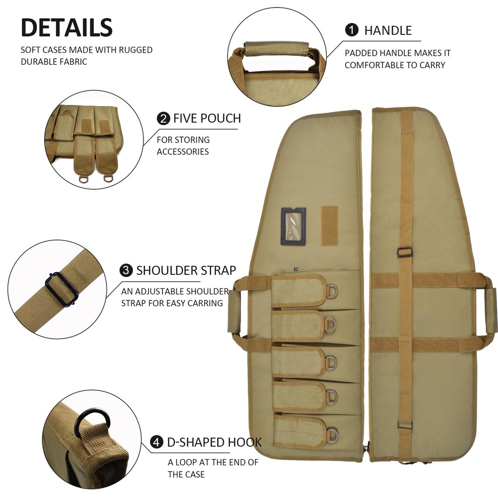 bag is available in two sizes: Medium case is 38"x12" outside; Large case is 42" x 12" outside. The bag with 5 pouches and adjustble shoulder sling. Case is made of 600D tough material. I believe that we will be satisfied with this bag. We are a professional OEM outdoor bag factory. Our quality is guaranteed. LARGE SIZE: Size of soft case--38" can Fits Up To 35" PADDED SOFT GUN BAG: Double zippers which can easy to slide the zippers strong and sturdy (Luggage lock NOT INCLUDED) POLYESTER: Heavy duty 600D polyester which have 5 pouches, D-Ring for hanging GUN BAG DETAIL: Includes a 1.5" reinforced one-piece wrap-around carry handle, and a 1.5" adjustable shoulder sling sewn to the case; Tough back support for Long lasting wear CUSTOMER SERVICE: If you have any questions, please feel free to tell us