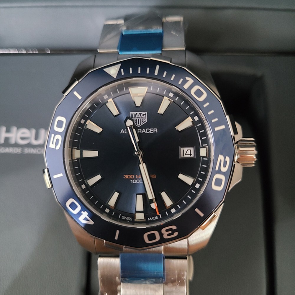 This Tag Heuer Aquaracer is absolutely stunning—the bold blue dial pops beautifully against the stainless steel case and bracelet. It's sleek yet rugged with 300-meter water resistance, perfect for any adventure. The quartz movement ensures precision, and the 41mm size sits perfectly on the wrist. Plus, the option for leather or rubber straps adds versatility. A premium watch that looks luxurious and performs flawlessly!