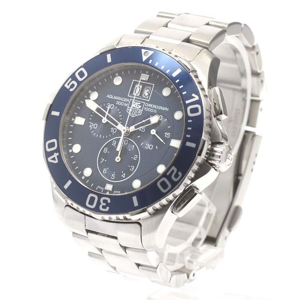 Tag Heuer Aquaracer CAN1011 Men’s Quartz Chronograph Big Date Used Key Features TAG Heuer Aquaracer Men's Watch, Ref. CAN1011, with blue dial and stainless steel case and bracelet. Features include date, chronograph, and small seconds. Case size approximately 45mm, bracelet length about 15.5cm, with 21mm lug width. The watch shows minor scratches and small dents on the glass, bezel, and bracelet, with a clean dial and well-maintained hands and clasp. No accessories included. Item Specifics: - Brand: TAG Heuer - Model: Aquaracer - Gender: Men's - Case Material: Stainless Steel - Band Material: Stainless Steel - Dial Color: Blue - Movement: Quartz - Features: Date, Chronograph, Small Seconds - Reference Number: CAN1011 - Serial Number: RMT2 Specifications Brand Tag Heuer Country Japan Product Description Tag Heuer Can1011 Aquaracer Big Date Chronograph Quartz Men'S 878445 Used Description If you have any questions or request about items, please feel free to ask us. Thank you! Shipping Shipping by FedEx, DHL, or EMS. International Buyers - Please Note: Import duties, taxes, and charges are not included in the item price or shipping cost. These charges are the buyer's responsibility. Please check with your country's customs office to determine what these additional costs will be prior to bidding or buying. Thank you for your understanding.